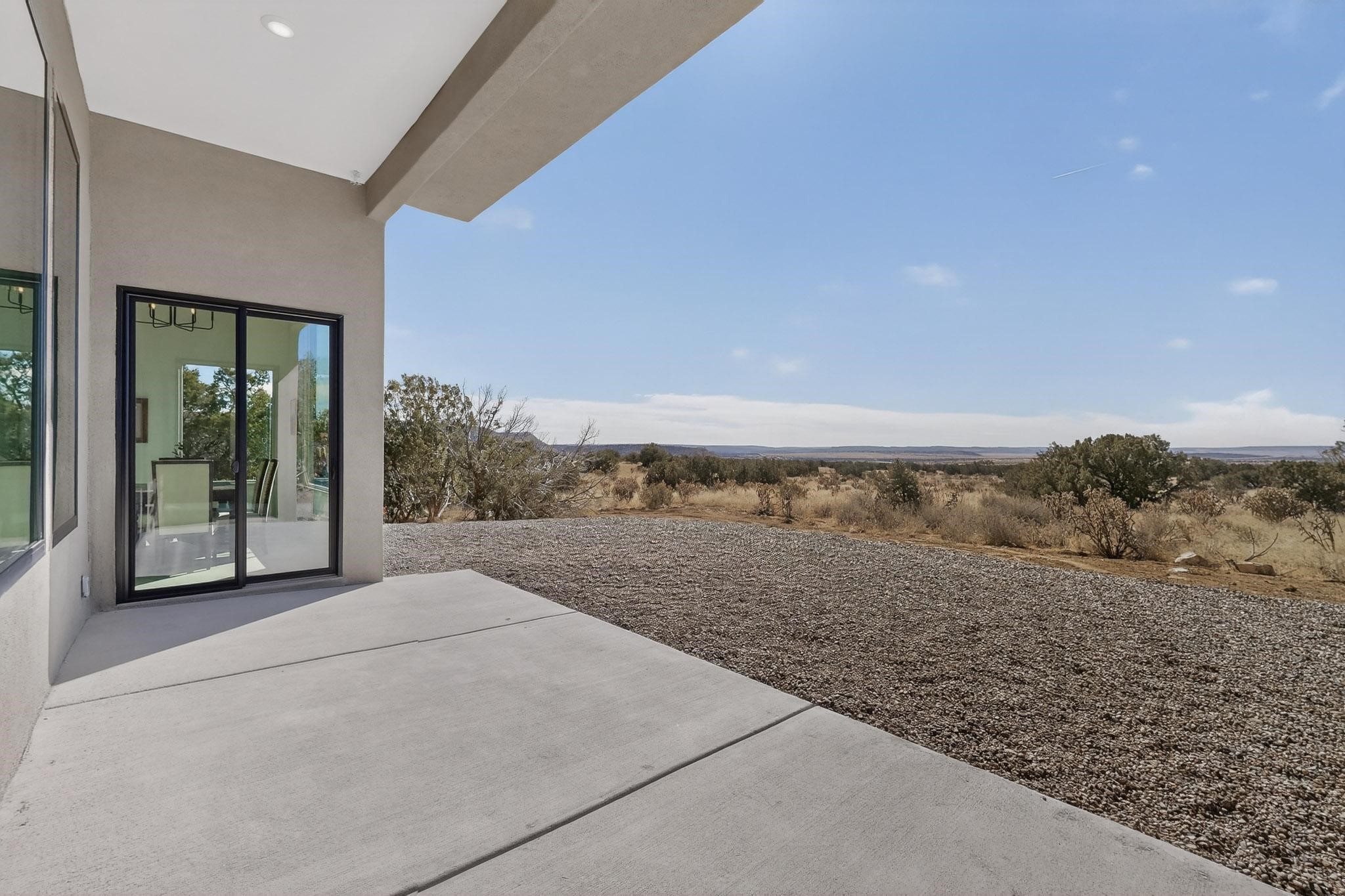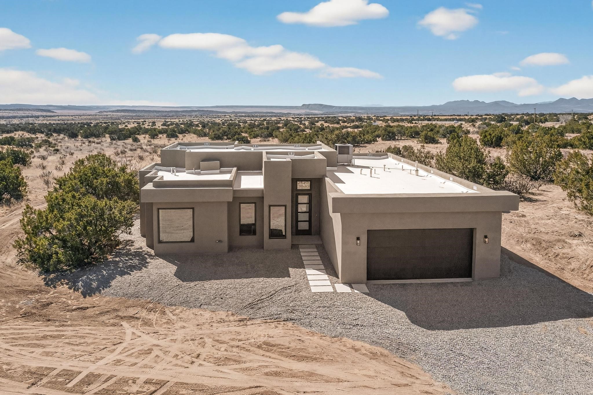 Welcome home! This stunning newly constructed contemporary-modern style home is perfectly positioned on 3.10 acres with stunning views of the Sandia Mountains and the Galisteo Basin. This 2,000 sq ft home has been designed to maximize the natural light and space, featuring high ceilings with contemporary style vigas, an open floor plan great for entertaining or keeping an eye on kids; with walls of windows taking full advantage of the expansive views!The modern kitchen includes a beautiful large granite island, large walk-in pantry, that flows beautifully into the living and dining areas, very functional and ideal for entertaining. Oversized windows and sliding glass doors invite abundant natural light and creates a seamless connection between indoor comfort and outdoor enjoyment; meanwhile framing the surrounding landscape like living artwork. The primary suite offers a peaceful escape with a luxurious spa inspired stand-alone bathtub, dual vanities, walk-in-shower with dual rain heads, and a spacious walk-in closet. Two additional bedrooms and a second full bath provide comfortable accommodations for family or guests.Enjoy the freedom of no HOA, space for horses, and the tranquility of rural living - while remaining just 20 minutes from downtown Santa Fe, close to nearby restaurants, shopping and outdoor activities. Brand new, beautifully designed, and ready to be lived in!
