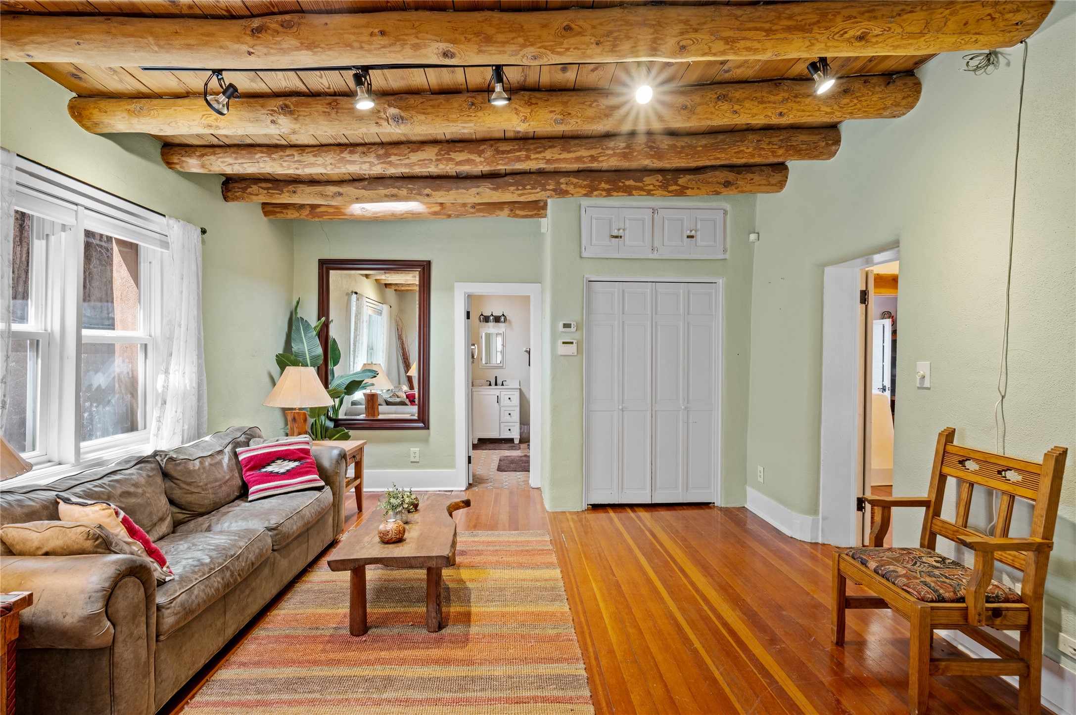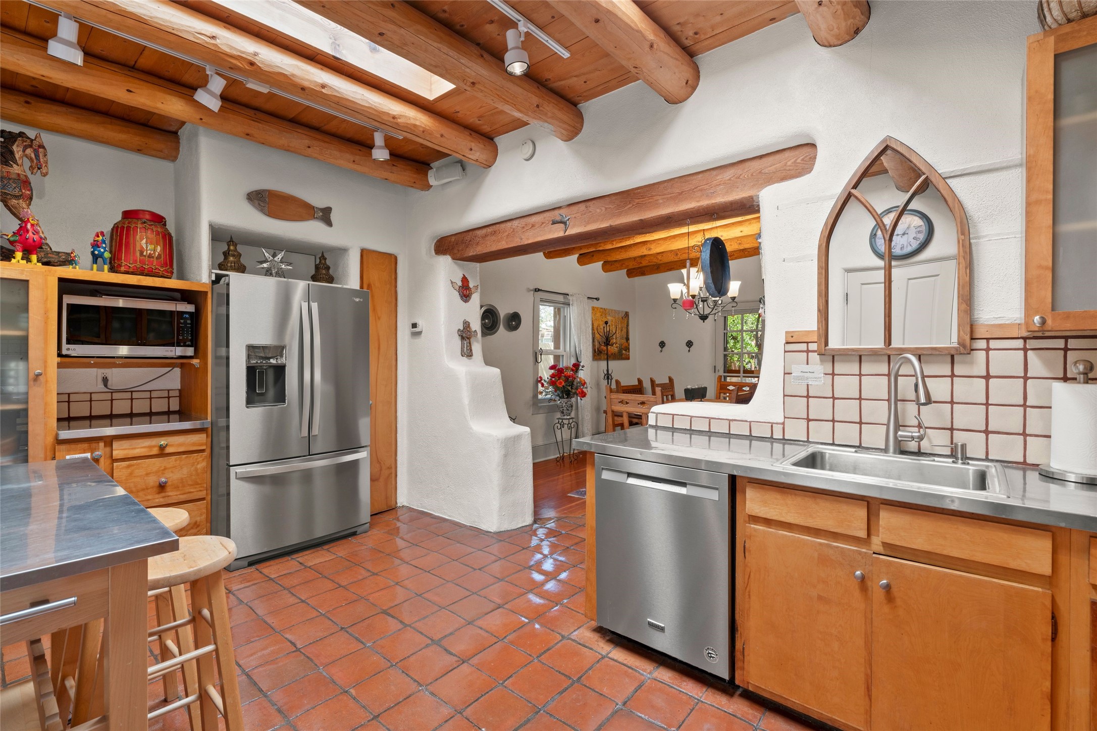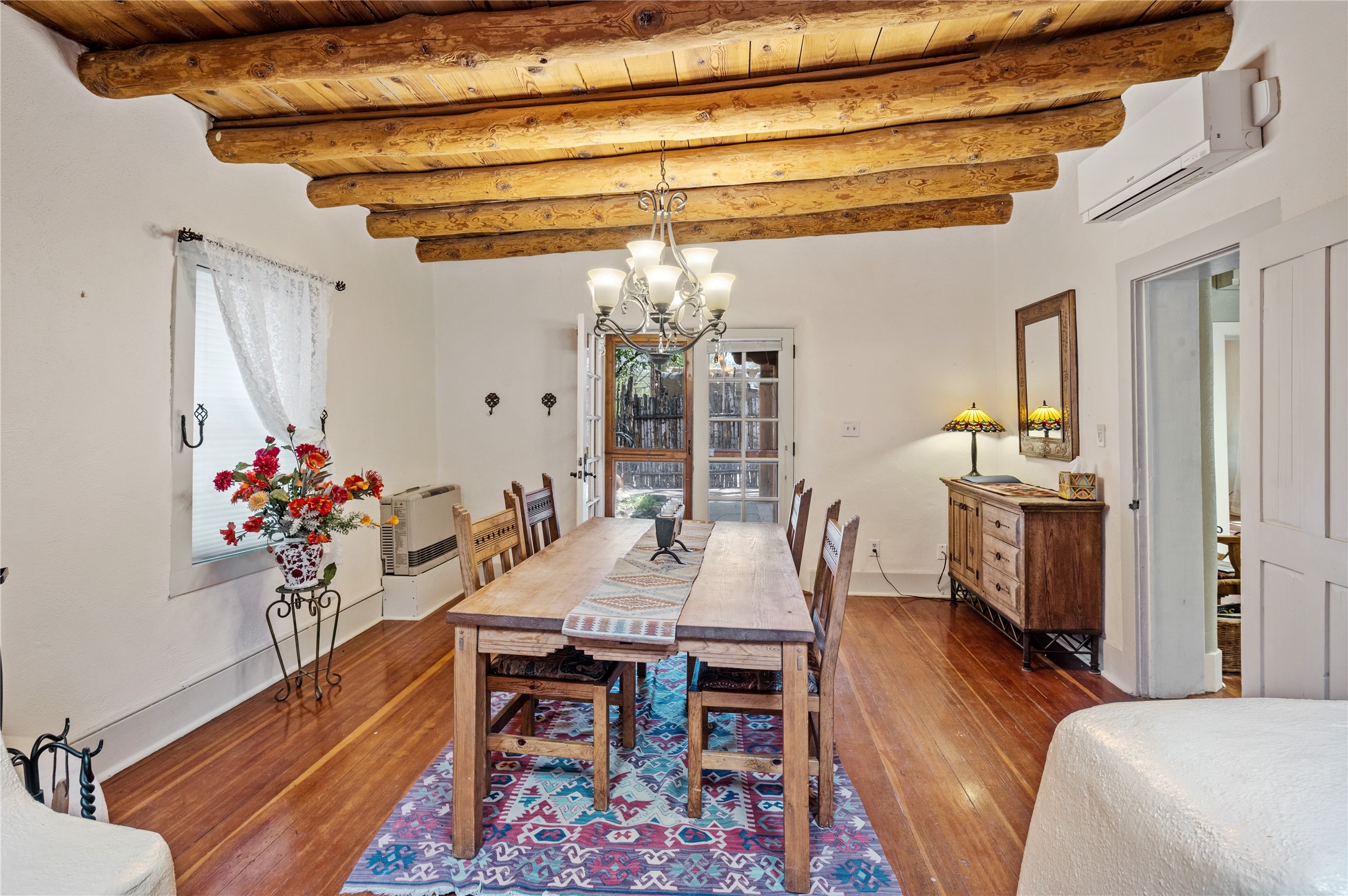Thoughtfully updated with many recent improvements, this charming home beautifully blends Southwest character with modern comfort. Gated parking provides security and convenience, while the home itself is tucked away on a private lane, offering tranquil surroundings in a prime location. Just a few-minute walk to Canyon Road and only 12 minutes on foot to the Plaza, with its coffee shops, restaurants, and galleries. Enter through a shaded front courtyard, perfect for entertaining or enjoying peaceful evenings, setting the tone for the Santa Fe style carried throughout the home. Inside, vaulted viga ceilings enhance the living room, which features a cozy wood-burning fireplace and skylights for natural light. Saltillo tile flooring adds to the traditional ambiance. The updated kitchen boasts stainless steel appliances, ample storage, and generous workspace. This 1654 square foot home, built in 1967 offers two bedrooms and two bathrooms. The spacious primary suite features decorative tilework and radiant heat in both the bedroom and ensuite bathroom for year-round comfort. Mini-split systems provide additional efficient heating and cooling. The second bedroom is light-filled and opens to the front patio--perfect for guests or a home office. This unique home is a rare find, combining timeless adobe charm with thoughtful updates in a peaceful, private setting. Schedule your private tour today.