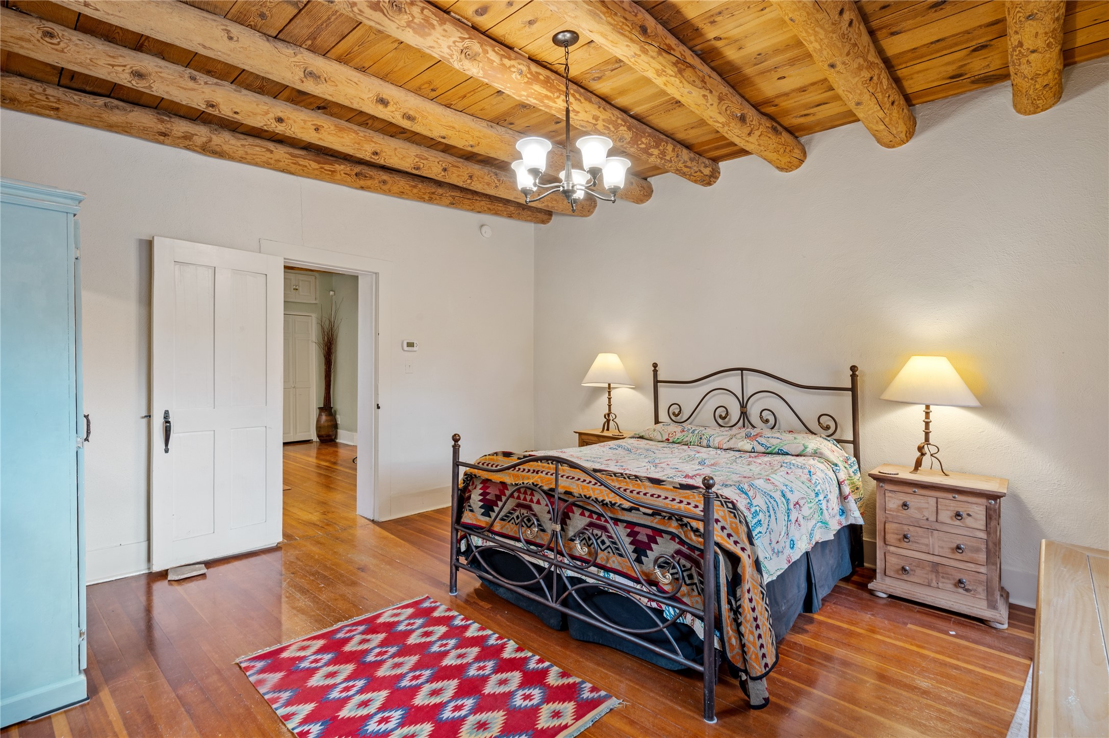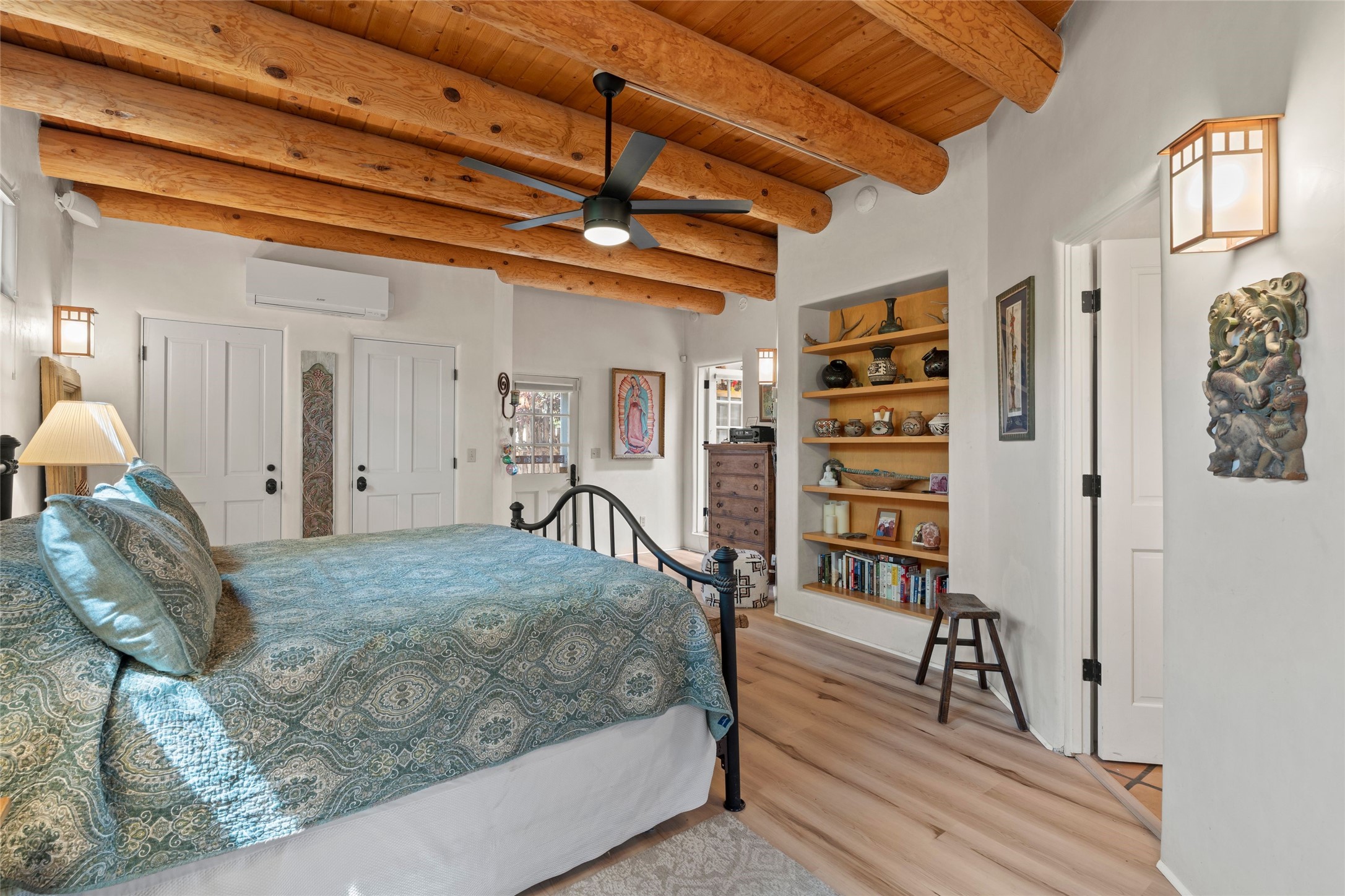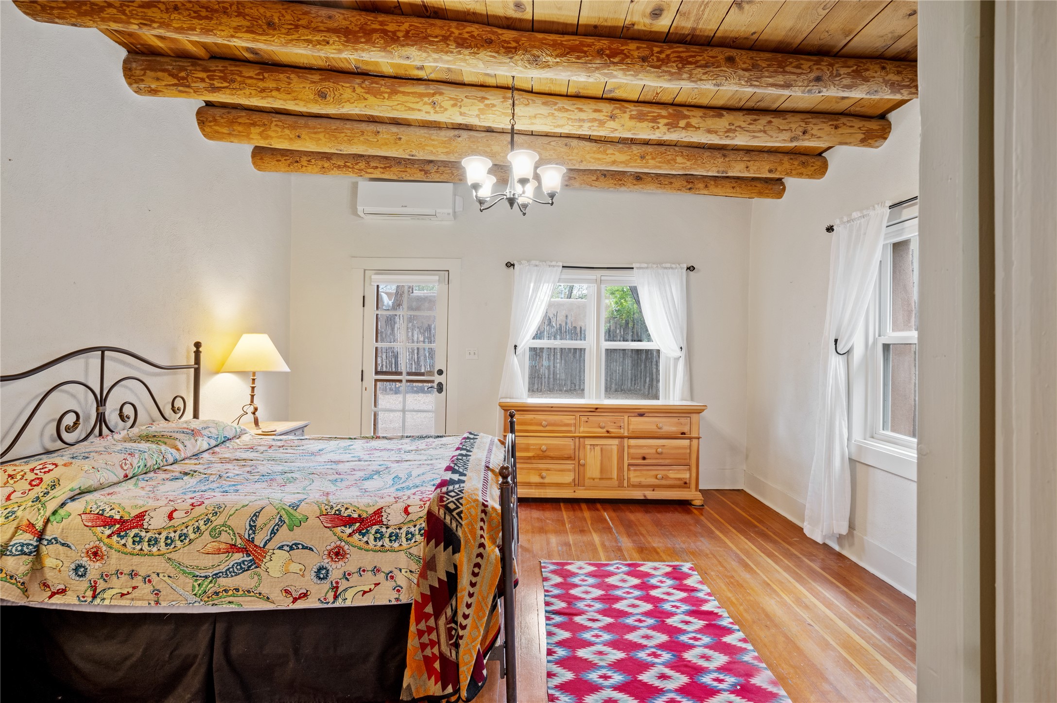 Thoughtfully updated with many recent improvements, this charming home beautifully blends Southwest character with modern comfort. Gated parking provides security and convenience, while the home itself is tucked away on a private lane, offering tranquil surroundings in a prime location. Just a few-minute walk to Canyon Road and only 12 minutes on foot to the Plaza, with its coffee shops, restaurants, and galleries. Enter through a shaded front courtyard, perfect for entertaining or enjoying peaceful evenings, setting the tone for the Santa Fe style carried throughout the home. Inside, vaulted viga ceilings enhance the living room, which features a cozy wood-burning fireplace and skylights for natural light. Saltillo tile flooring adds to the traditional ambiance. The updated kitchen boasts stainless steel appliances, ample storage, and generous workspace. This 1654 square foot home, built in 1967 offers two bedrooms and two bathrooms. The spacious primary suite features decorative tilework and radiant heat in both the bedroom and ensuite bathroom for year-round comfort. Mini-split systems provide additional efficient heating and cooling. The second bedroom is light-filled and opens to the front patio--perfect for guests or a home office. This unique home is a rare find, combining timeless adobe charm with thoughtful updates in a peaceful, private setting. Schedule your private tour today.
