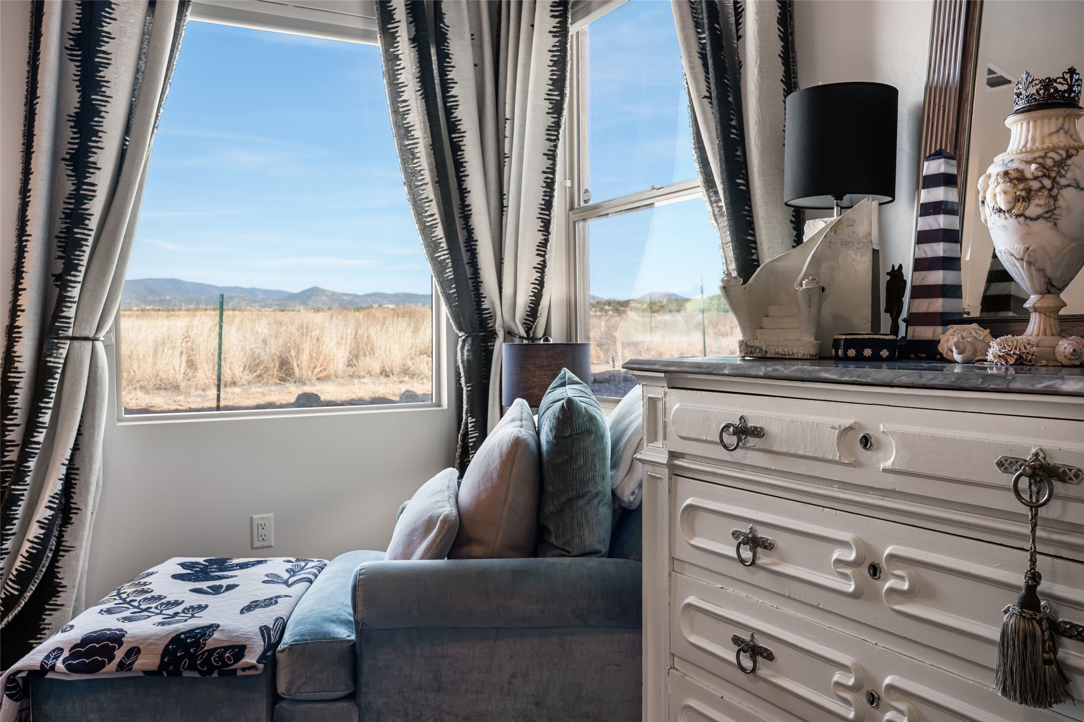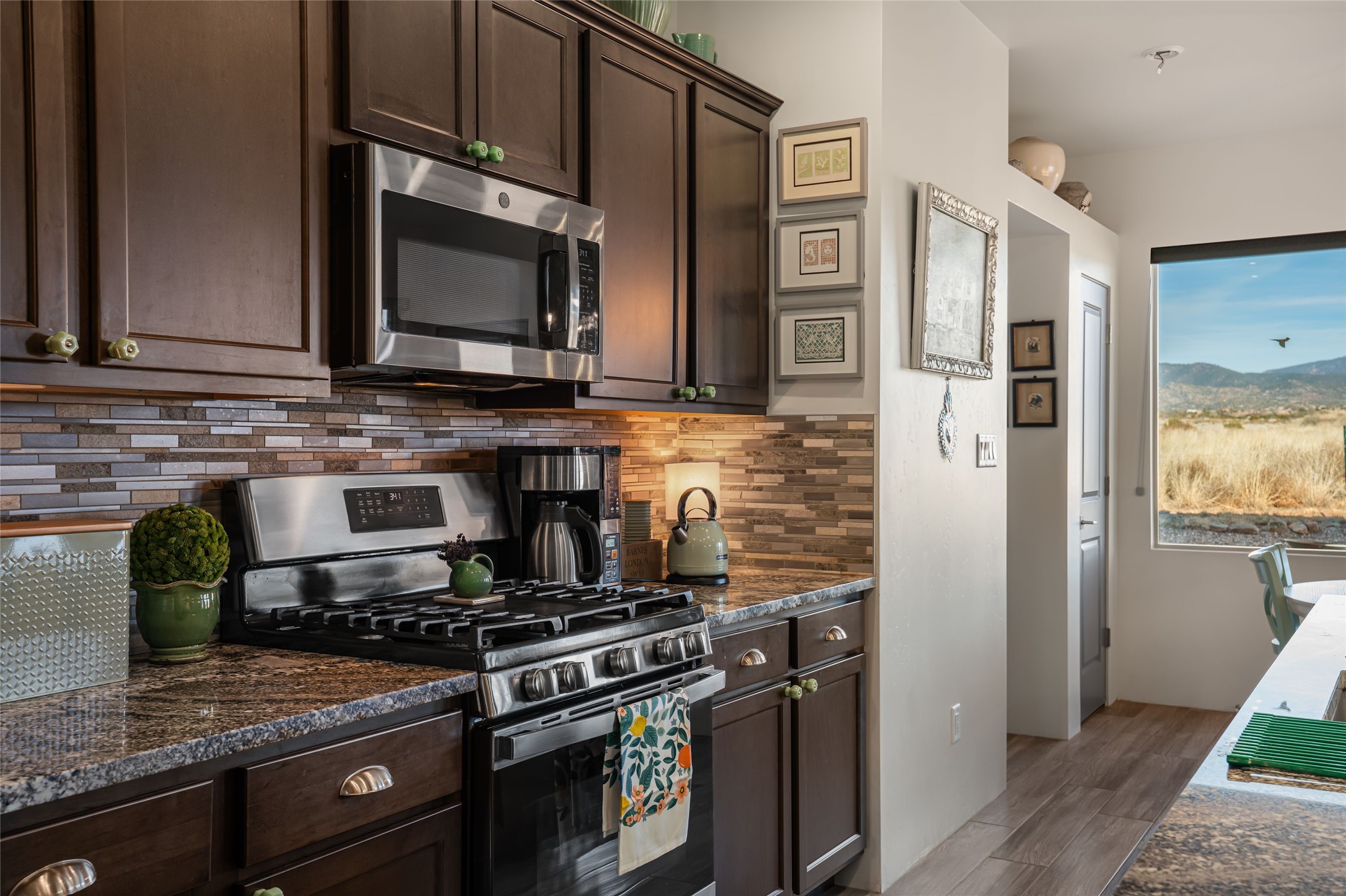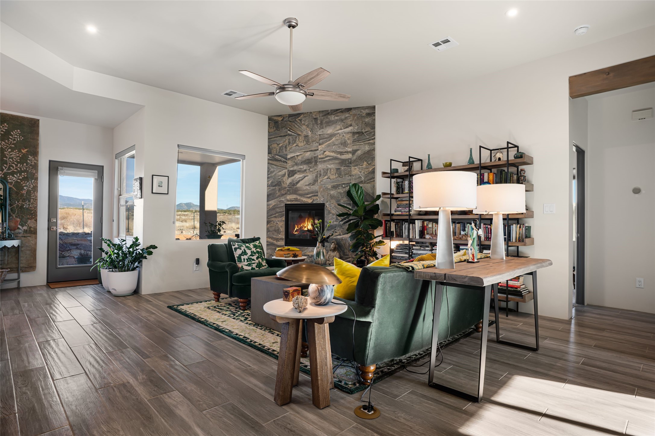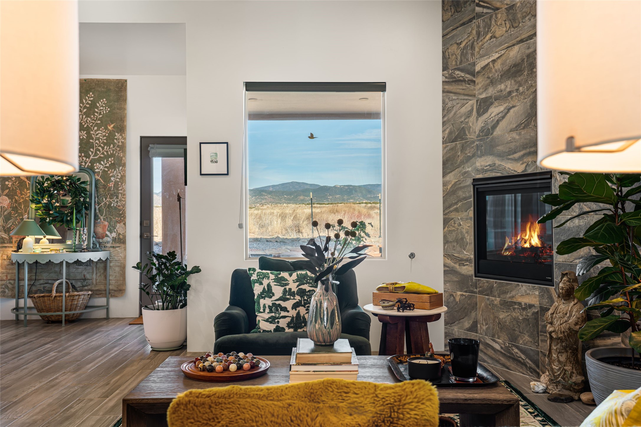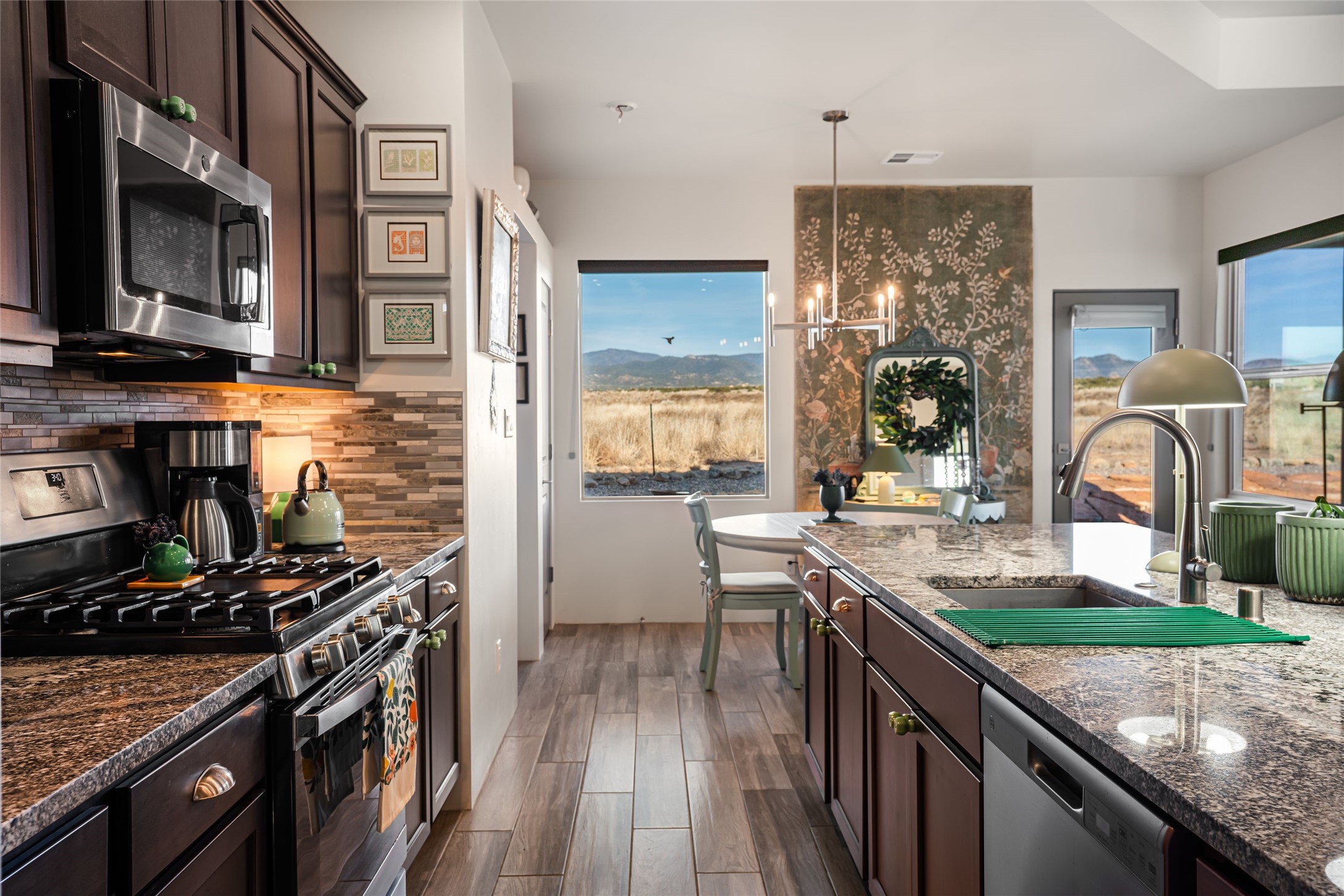 Located on one of the premier Oshara Village estate lots overlooking the green space to the South and the Sangre de Cristo Mountains to the East and only minutes away from Rancho Viejo's walking and biking trails, this almost new 3 bedroom, 2 bath home was completed spring of 2022 and is a HERS-rated green home through energy efficiency including AC, healthy materials, durability and sustainability. With clean soft contemporary lines, the main living space is open and enjoys a kiva gas fireplace, high ceilings, fantastic light, mountain views and easy access to the outdoor covered portal from which to enjoy sunrises, sunset colors and moonrises over the Sangres. The kitchen has excellent storage in the solid wood cabinets, plenty of prep room on generous granite counters and upgraded stainless appliances, including gas stove and farm sink. The laundry room offers good storage and leads directly into the two car garage. Excellent bedroom separation, the main bedroom is graciously sized, also looks out to the Sangres and has an enormous walk-in closet with plenty of hanging and shelving space. En suite bath with two sinks, granite counters and large walk-in shower. On the other side of the house, the second bedroom has more big mountain vistas, full guest bath adjacent and linen closet. The third bedroom's view is to the south with Sandia views and barn doors to close it off from the main living area, and makes a super media room, office or overflow guest room. The outdoor landscaping includes stone gabions to sculpturally define the space, easy to maintain perennials and conifers and invites the quail, hawks, ravens and roadrunners who live in the adjacent green space. Minutes to the community college, trails and shopping yet just about 15 minutes to the Plaza, this is a very special home, beautifully maintained and lovingly cared for.
