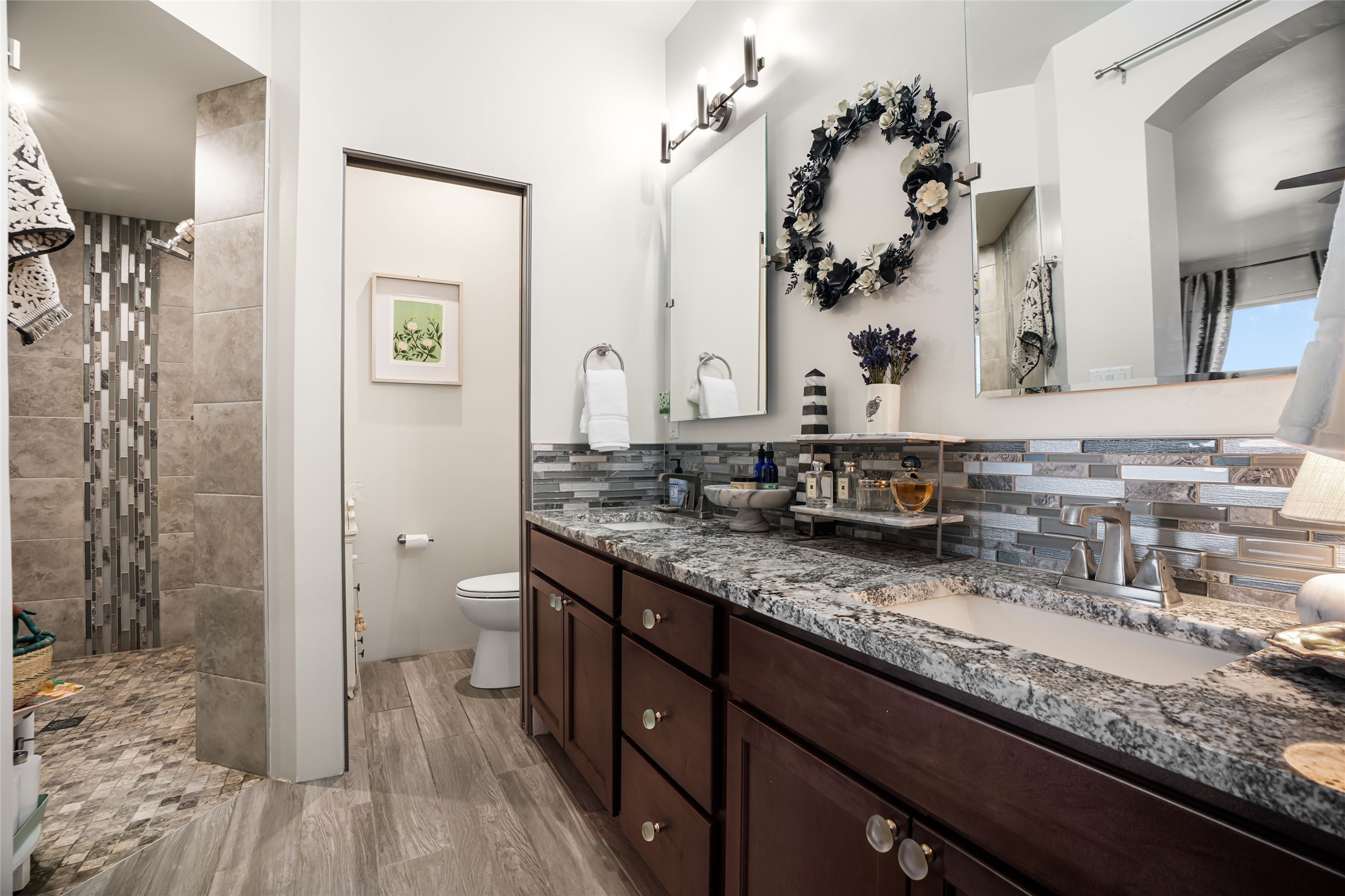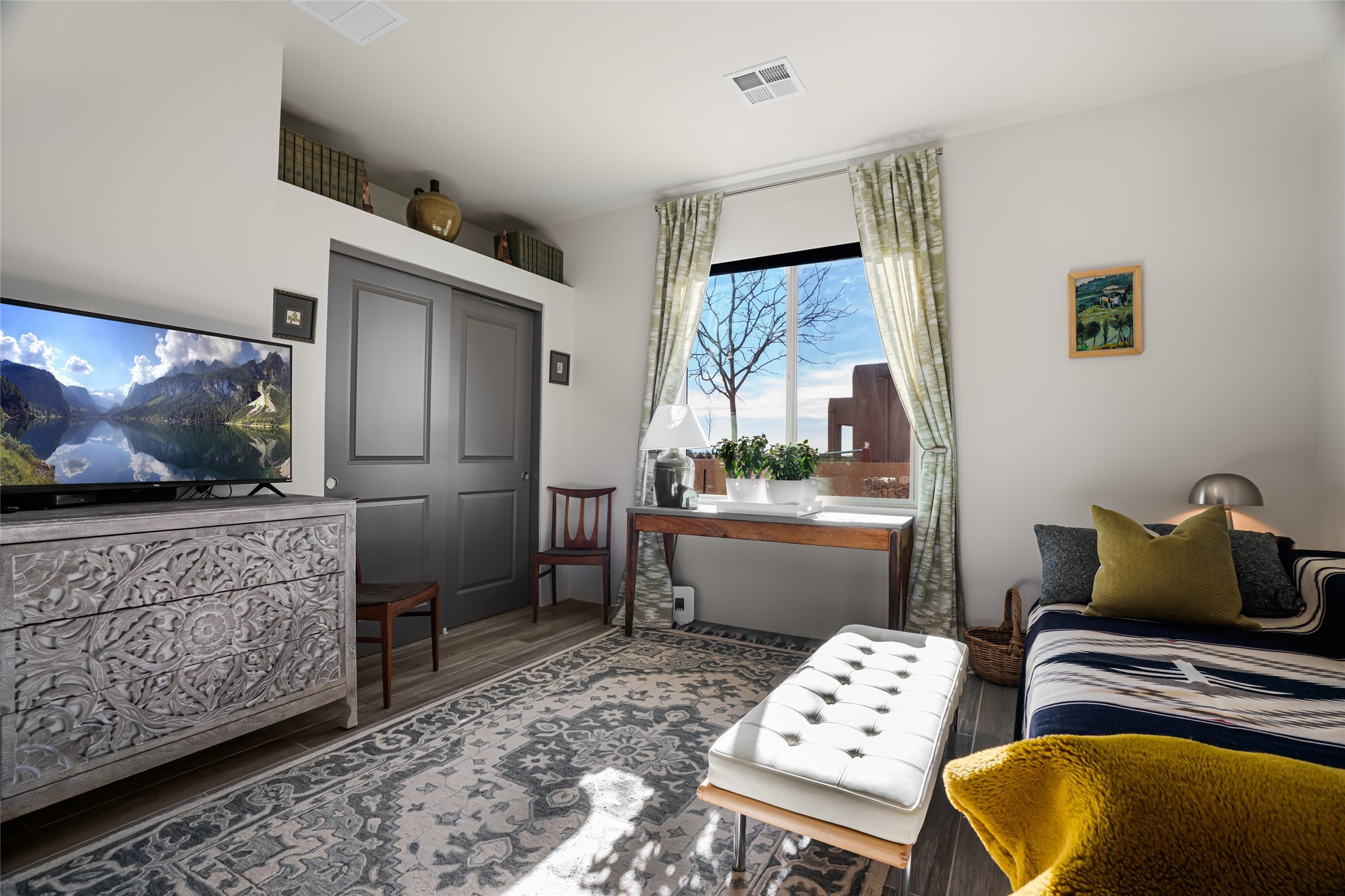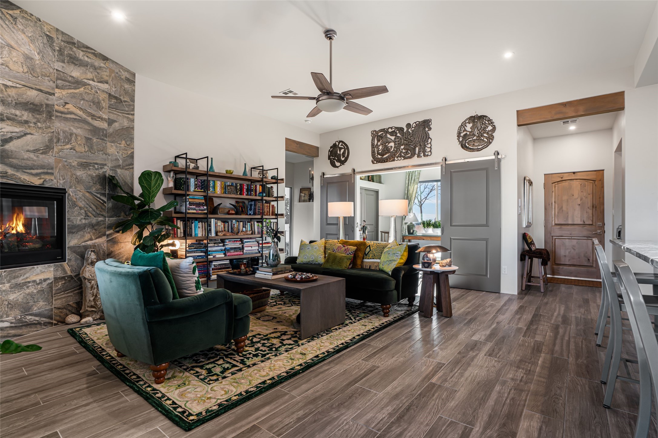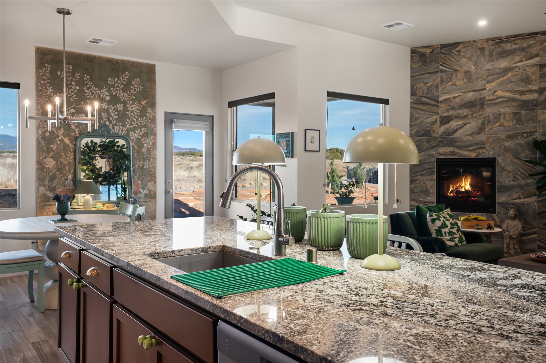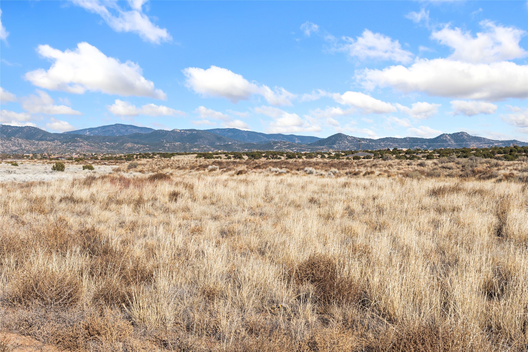Located on one of the premier Oshara Village estate lots overlooking the green space to the South and the Sangre de Cristo Mountains to the East and only minutes away from Rancho Viejo's walking and biking trails, this almost new 3 bedroom, 2 bath home was completed spring of 2022 and is a HERS-rated green home through energy efficiency including AC, healthy materials, durability and sustainability. With clean soft contemporary lines, the main living space is open and enjoys a kiva gas fireplace, high ceilings, fantastic light, mountain views and easy access to the outdoor covered portal from which to enjoy sunrises, sunset colors and moonrises over the Sangres. The kitchen has excellent storage in the solid wood cabinets, plenty of prep room on generous granite counters and upgraded stainless appliances, including gas stove and farm sink. The laundry room offers good storage and leads directly into the two car garage. Excellent bedroom separation, the main bedroom is graciously sized, also looks out to the Sangres and has an enormous walk-in closet with plenty of hanging and shelving space. En suite bath with two sinks, granite counters and large walk-in shower. On the other side of the house, the second bedroom has more big mountain vistas, full guest bath adjacent and linen closet. The third bedroom's view is to the south with Sandia views and barn doors to close it off from the main living area, and makes a super media room, office or overflow guest room. The outdoor landscaping includes stone gabions to sculpturally define the space, easy to maintain perennials and conifers and invites the quail, hawks, ravens and roadrunners who live in the adjacent green space. Minutes to the community college, trails and shopping yet just about 15 minutes to the Plaza, this is a very special home, beautifully maintained and lovingly cared for.