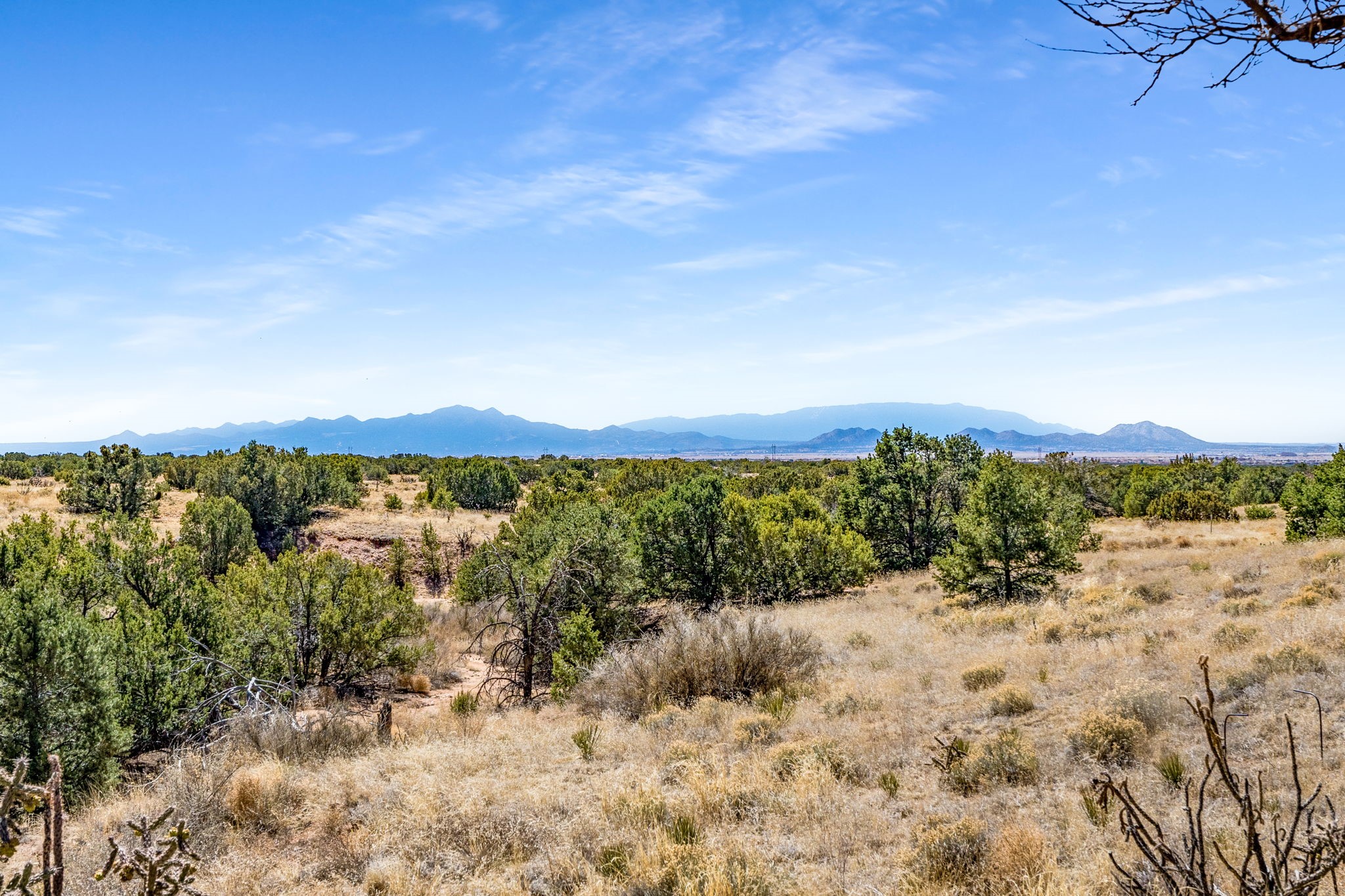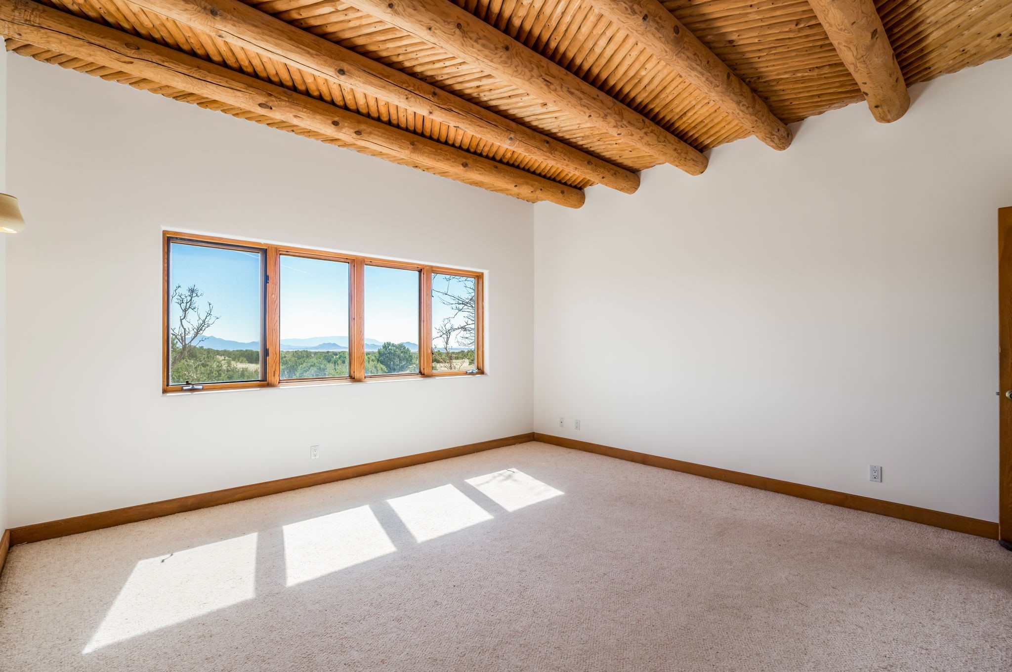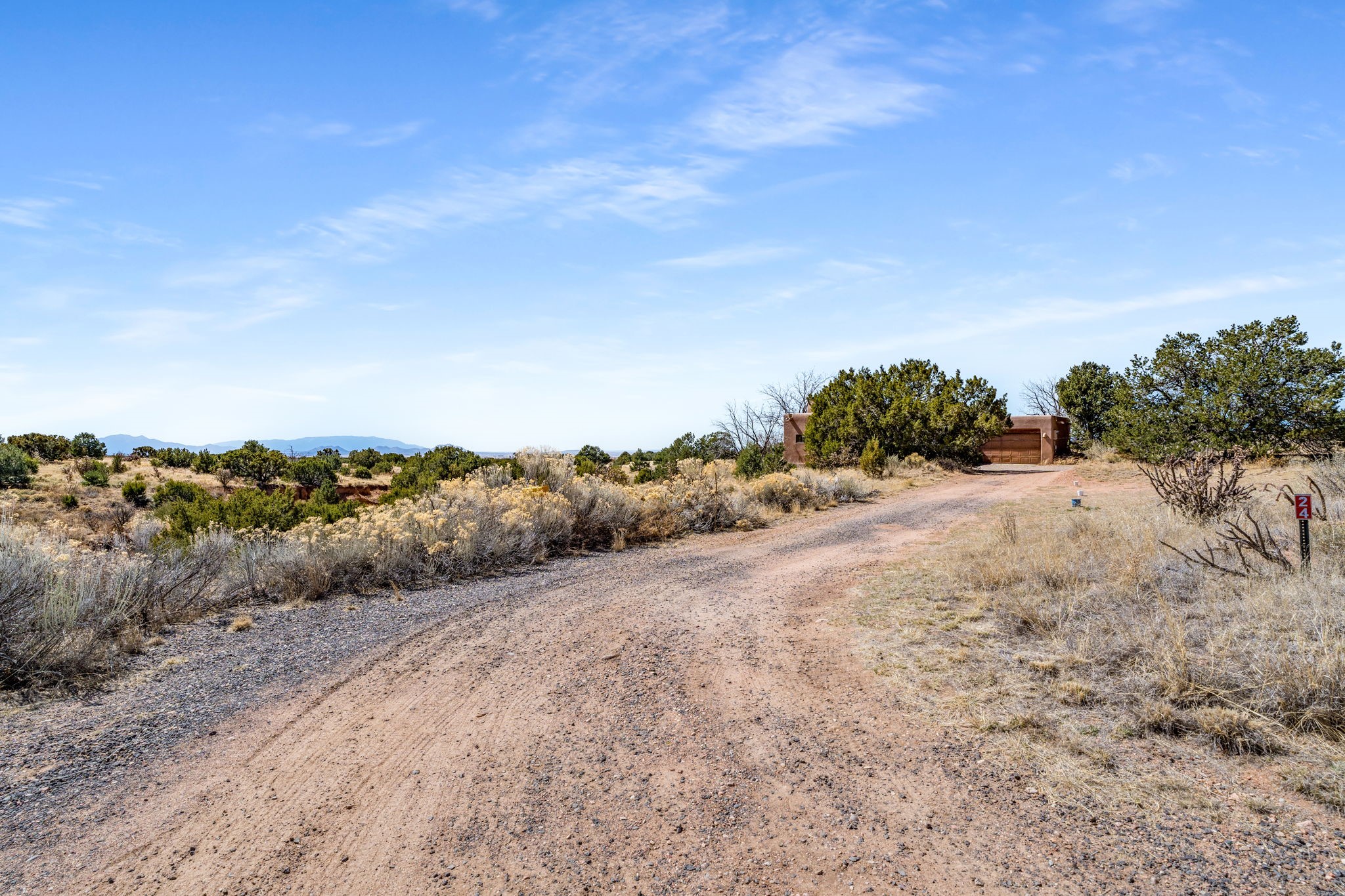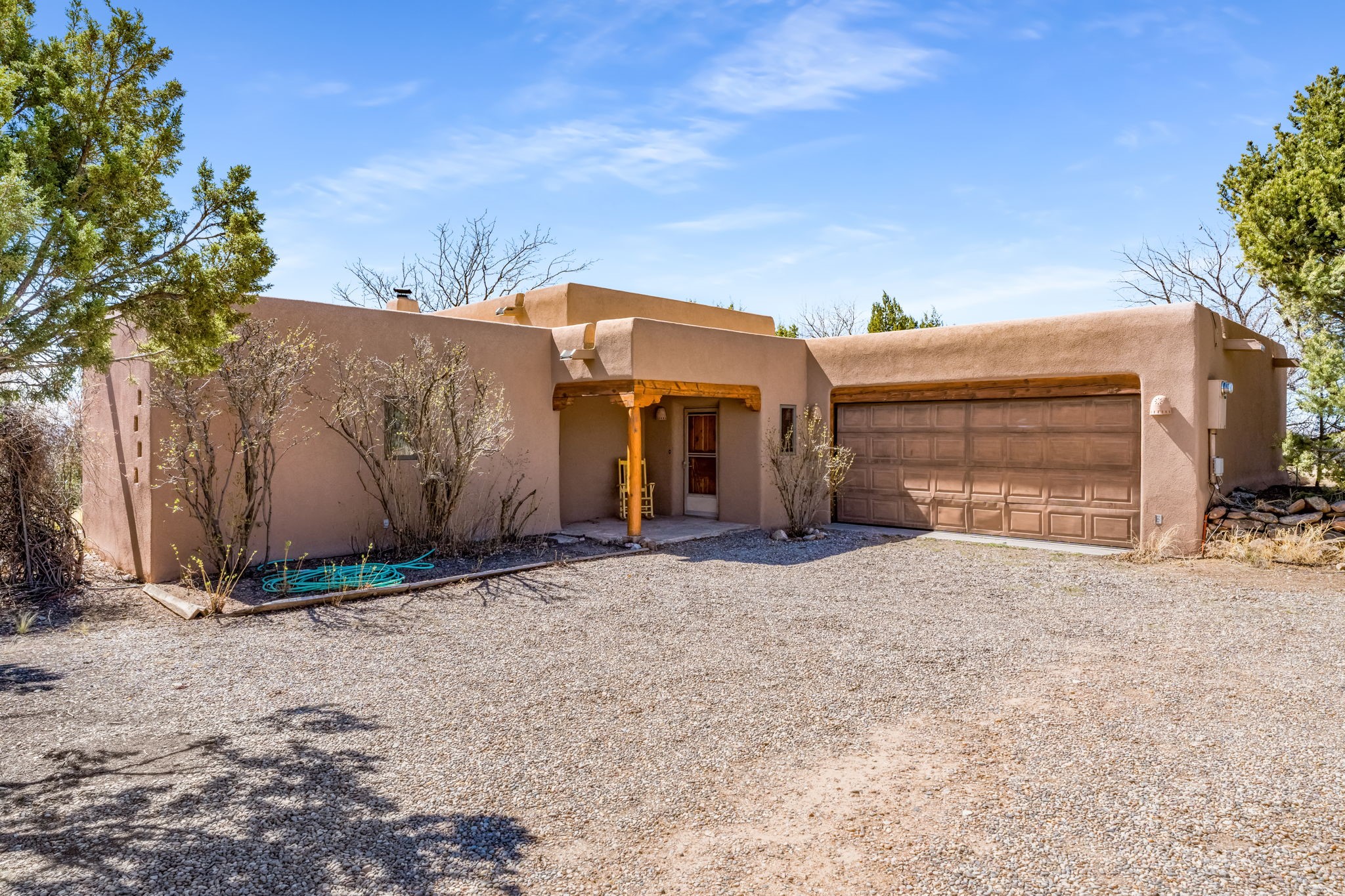 Peaceful natural beauty and classic Santa Fe style come together beautifully in this inviting home on 2.5 acres, only 15 to 20 minutes from downtown. With 1,978 square feet and a thoughtfully designed floor plan, the home offers both comfort and connection to the surrounding landscape. Deep windows stretching across the back wall frame stunning Sandia Mountain views and fill the open living, dining, and kitchen spaces with light. The living room is especially welcoming, with high ceilings, vigas over latillas, Saltillo tile floors, a corner kiva fireplace, and sliding doors that open to the lovely backyard. The bedroom layout is well planned, with two guest bedrooms and a full bath on one end of the home and a generous primary suite tucked privately on the other. A two-car attached, direct-entry garage adds convenience, while in-floor radiant heat, newer stucco, and a well-maintained roof provide peace of mind. With Sangre de Cristo Mountain views from the front and serene open space all around, this home offers the very best of country living with easy access to Santa Fe.