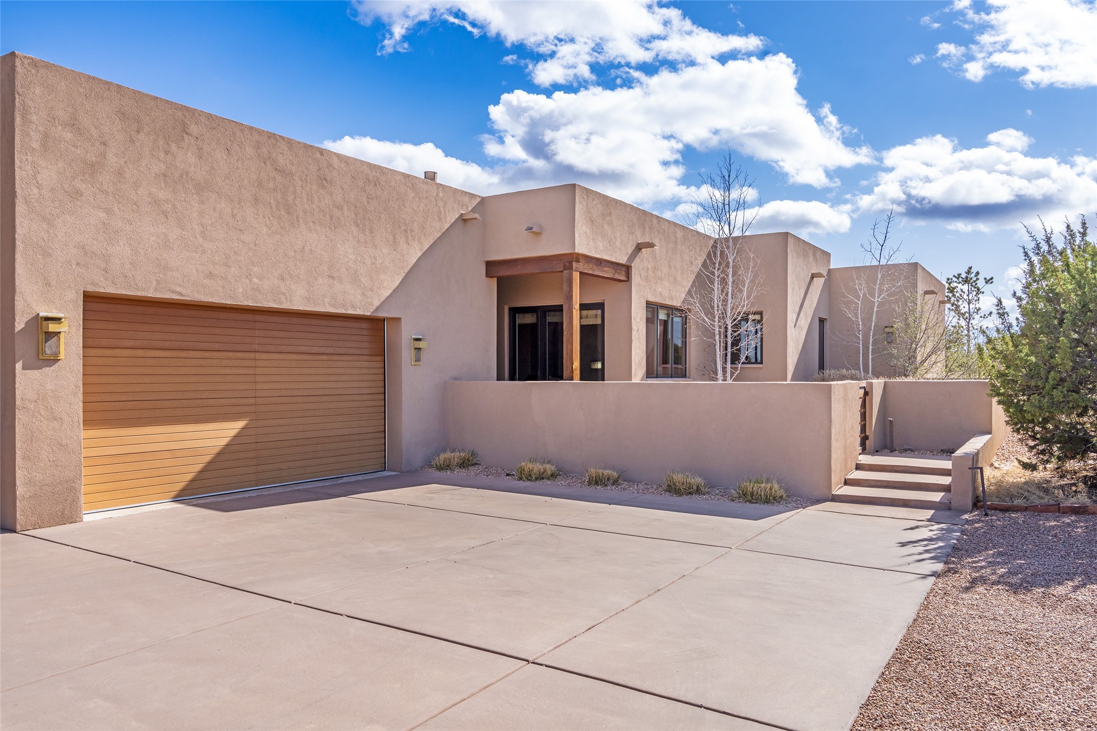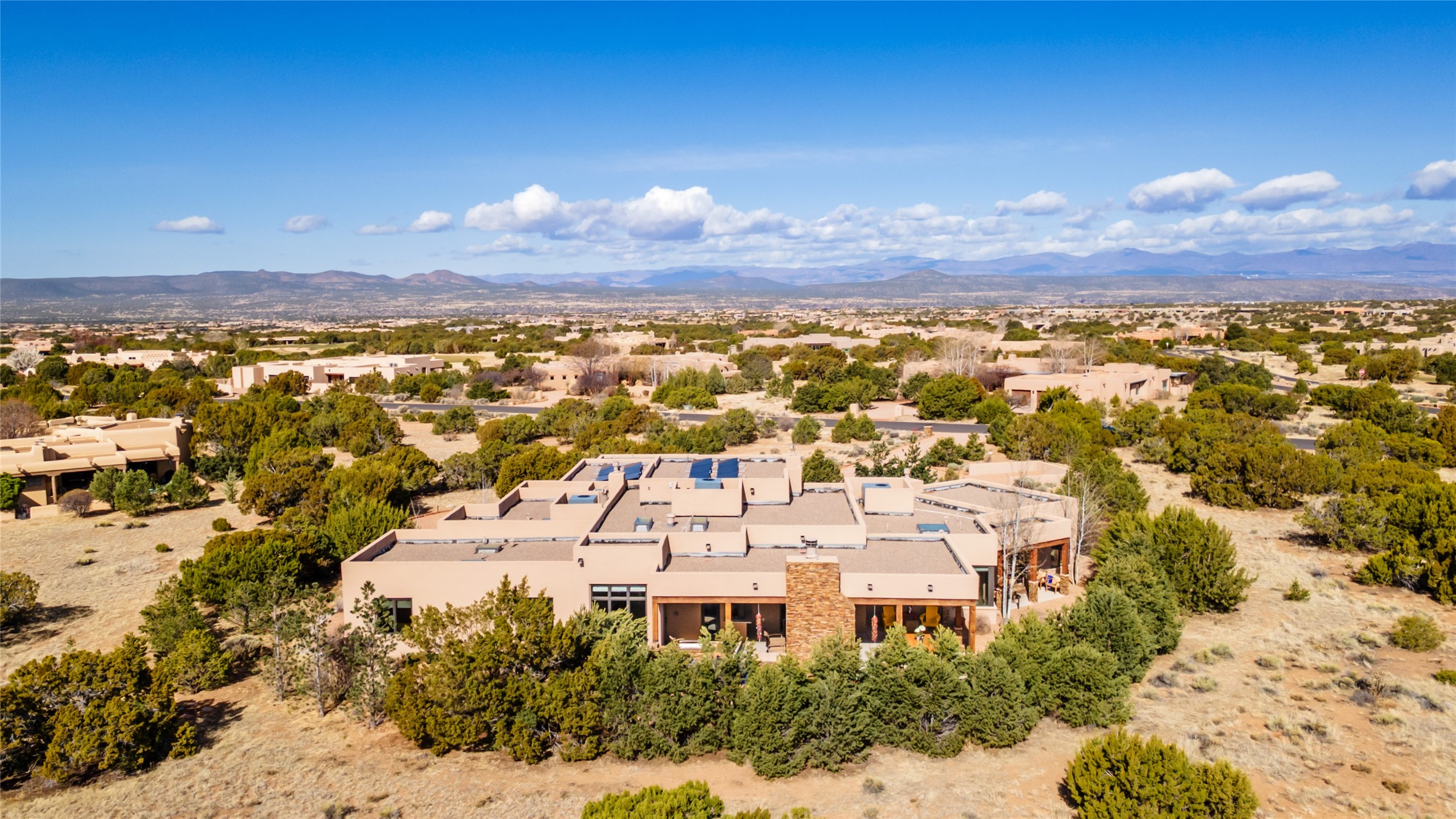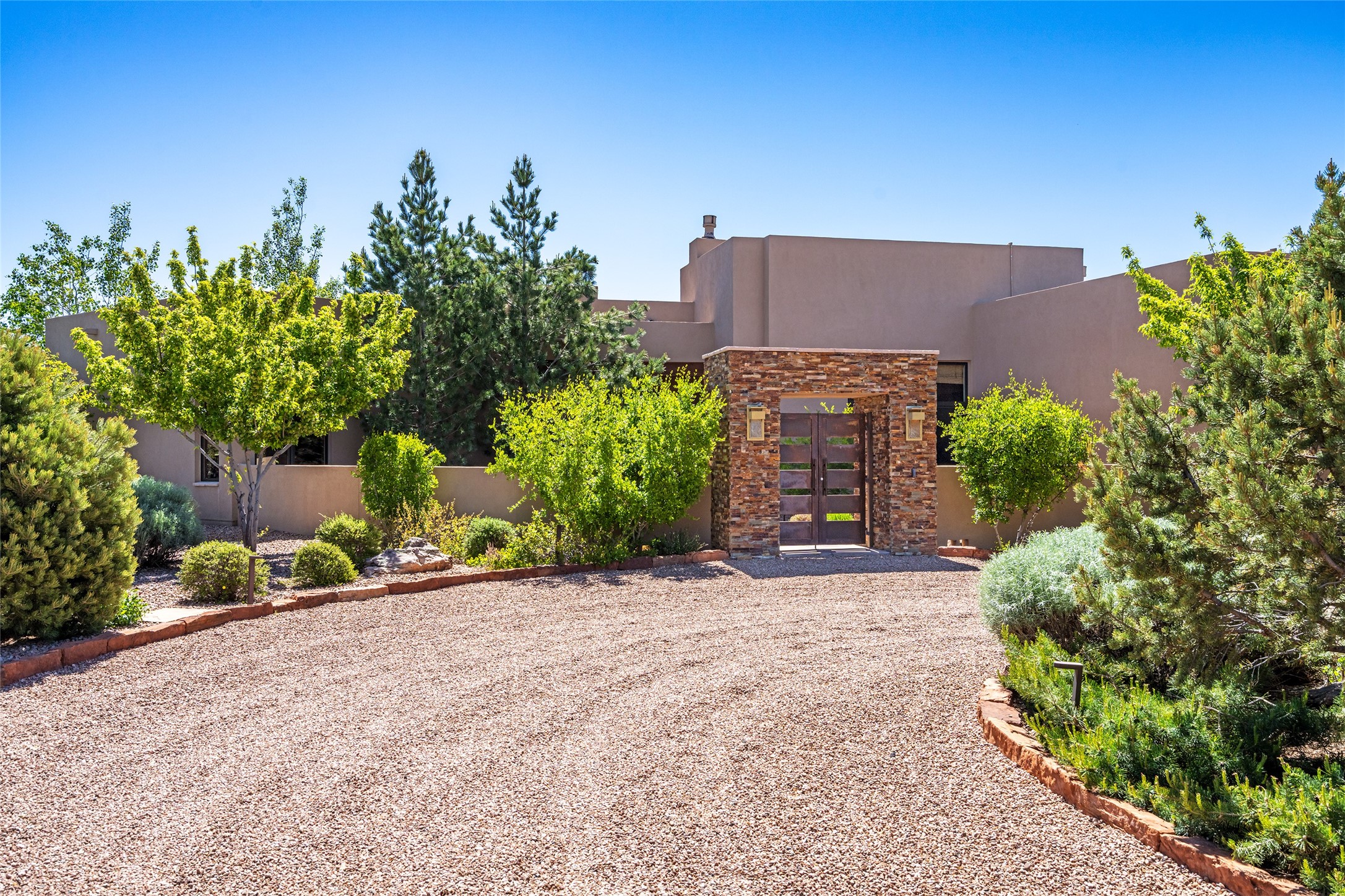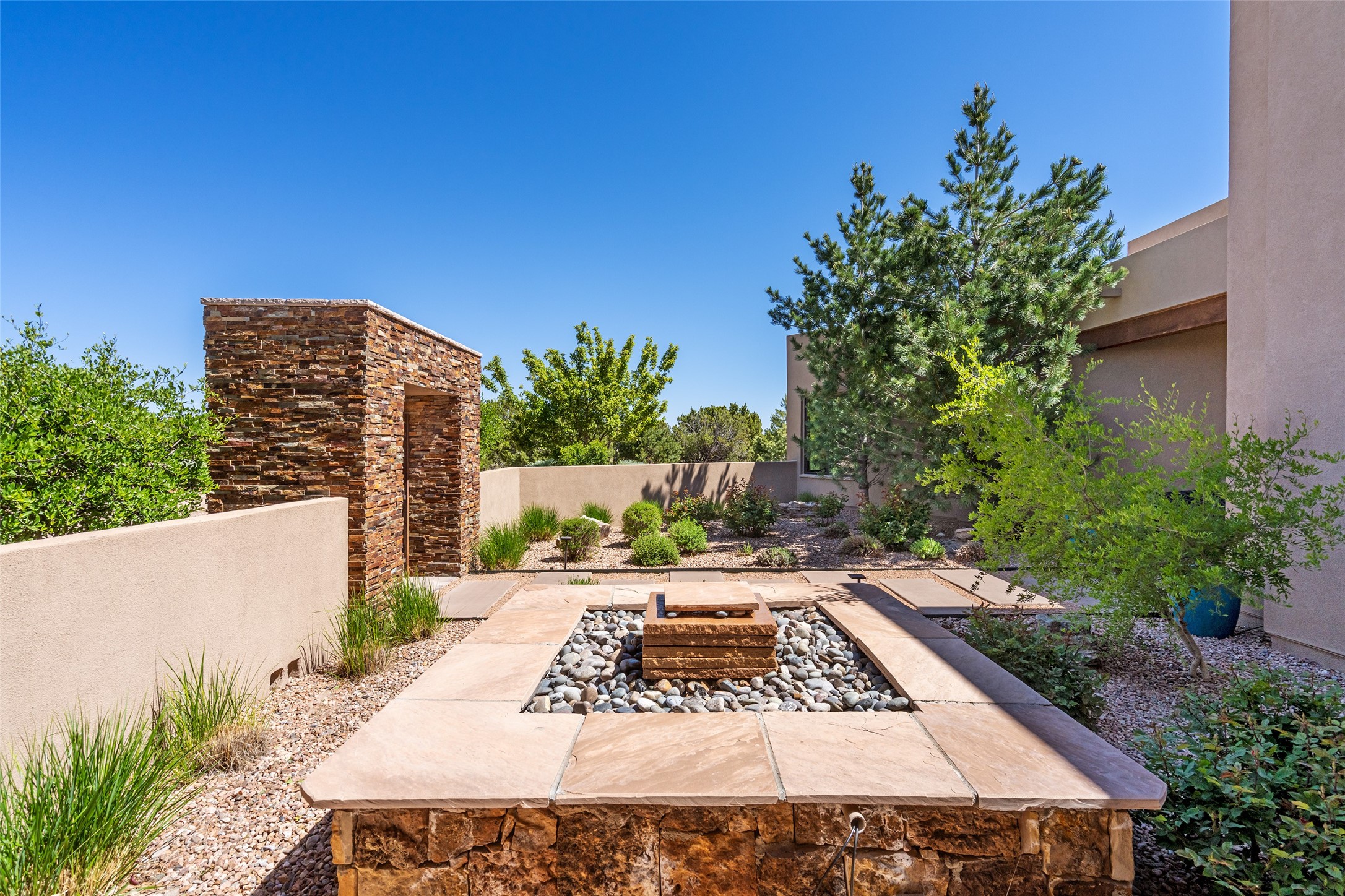 Discover a refined blend of timeless Southwestern charm and modern sophistication in this contemporary Pueblo-style home sited on 1.8+ serene acres with Jemez Mountain views. A private entry courtyard with a tranquil stone water feature welcomes you into beautifully appointed interiors featuring stone accents and high-end finishes throughout.At the heart of the home, the grand chef's kitchen is flooded with natural light from skylights and appointed with top-tier appliances, custom cabinetry and an open, entertainer-friendly layout gracefully flowing to the spacious living room, dining room and portal. The generous primary suite is a private retreat with a cozy gas fireplace, two walk-in closets, dedicated office space, a spa-inspired bath and direct access to its own portal. The well-separated guest wing includes two spacious bedrooms, each with en-suite baths for comfort and privacy. An additional large office/den with a separate entrance and private portal provides an ideal workspace or creative studio.Outdoor living is exceptional -- a spacious rear portal features a large fireplace, outdoor cooking, a pass-through to the wet bar and beverage center, a second water feature and ample room for al fresco dining and relaxation. Practical amenities include a three-car direct-entry garage and a roof-mounted Solar Pro System array. This property offers an unparalleled sanctuary for those seeking privacy, elegance and effortless indoor-outdoor living.