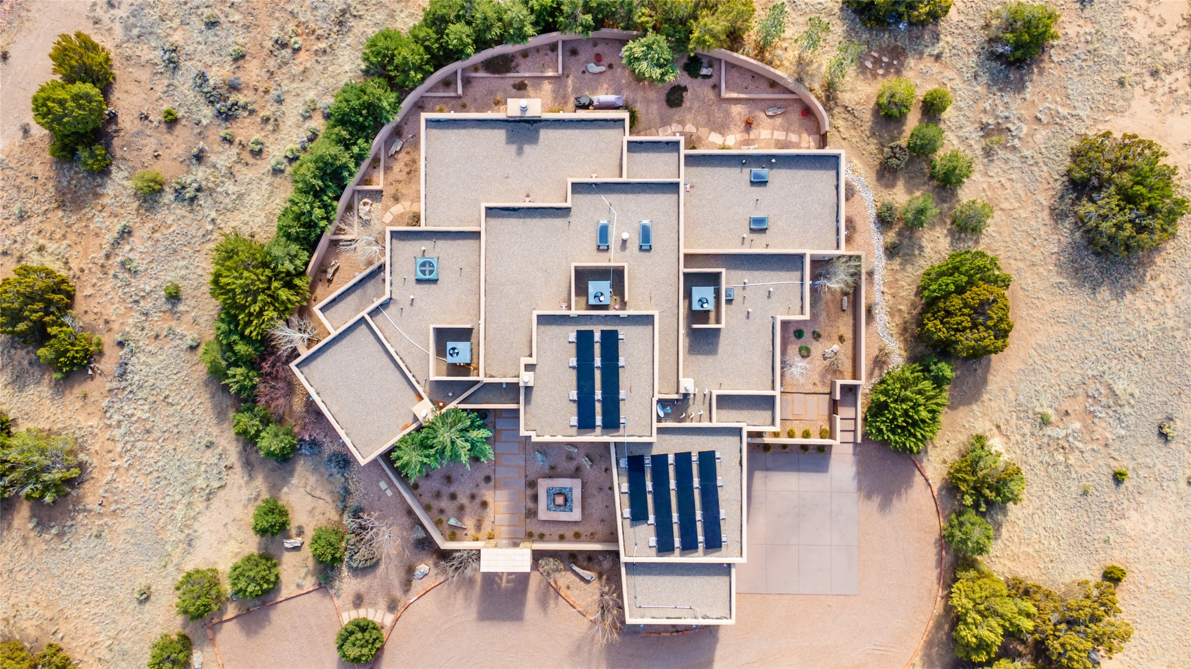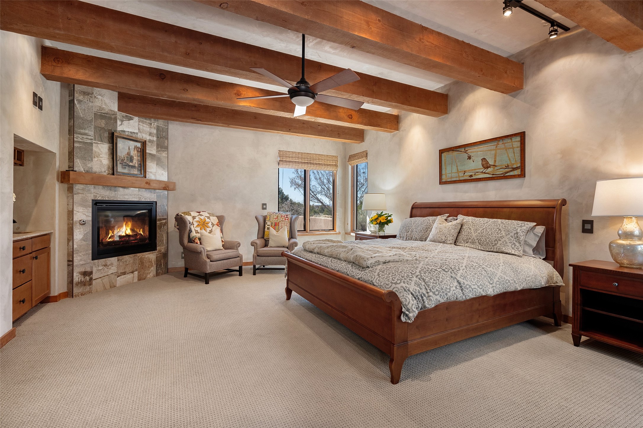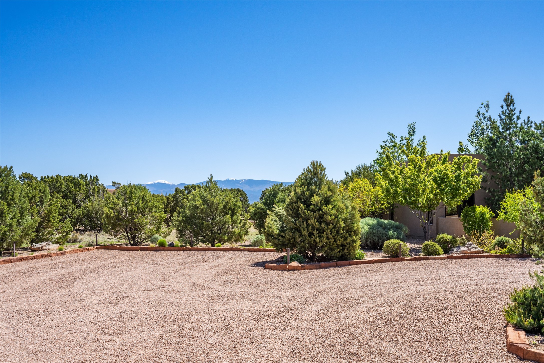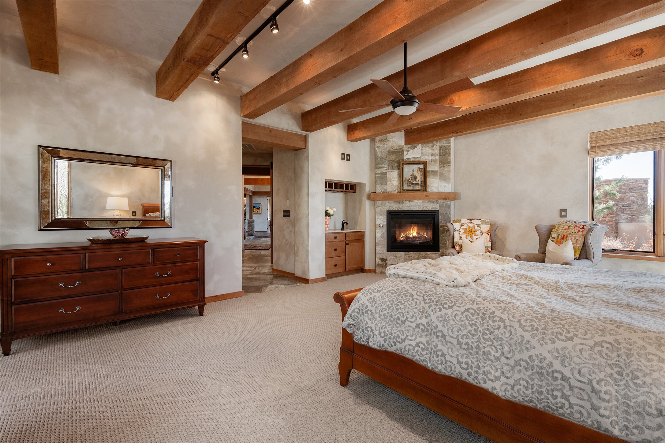 Discover a refined blend of timeless Southwestern charm and modern sophistication in this contemporary Pueblo-style home sited on 1.8+ serene acres with Jemez Mountain views. A private entry courtyard with a tranquil stone water feature welcomes you into beautifully appointed interiors featuring stone accents and high-end finishes throughout.At the heart of the home, the grand chef's kitchen is flooded with natural light from skylights and appointed with top-tier appliances, custom cabinetry and an open, entertainer-friendly layout gracefully flowing to the spacious living room, dining room and portal. The generous primary suite is a private retreat with a cozy gas fireplace, two walk-in closets, dedicated office space, a spa-inspired bath and direct access to its own portal. The well-separated guest wing includes two spacious bedrooms, each with en-suite baths for comfort and privacy. An additional large office/den with a separate entrance and private portal provides an ideal workspace or creative studio.Outdoor living is exceptional -- a spacious rear portal features a large fireplace, outdoor cooking, a pass-through to the wet bar and beverage center, a second water feature and ample room for al fresco dining and relaxation. Practical amenities include a three-car direct-entry garage and a roof-mounted Solar Pro System array. This property offers an unparalleled sanctuary for those seeking privacy, elegance and effortless indoor-outdoor living.