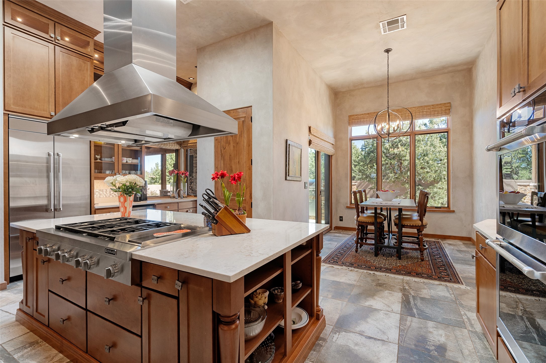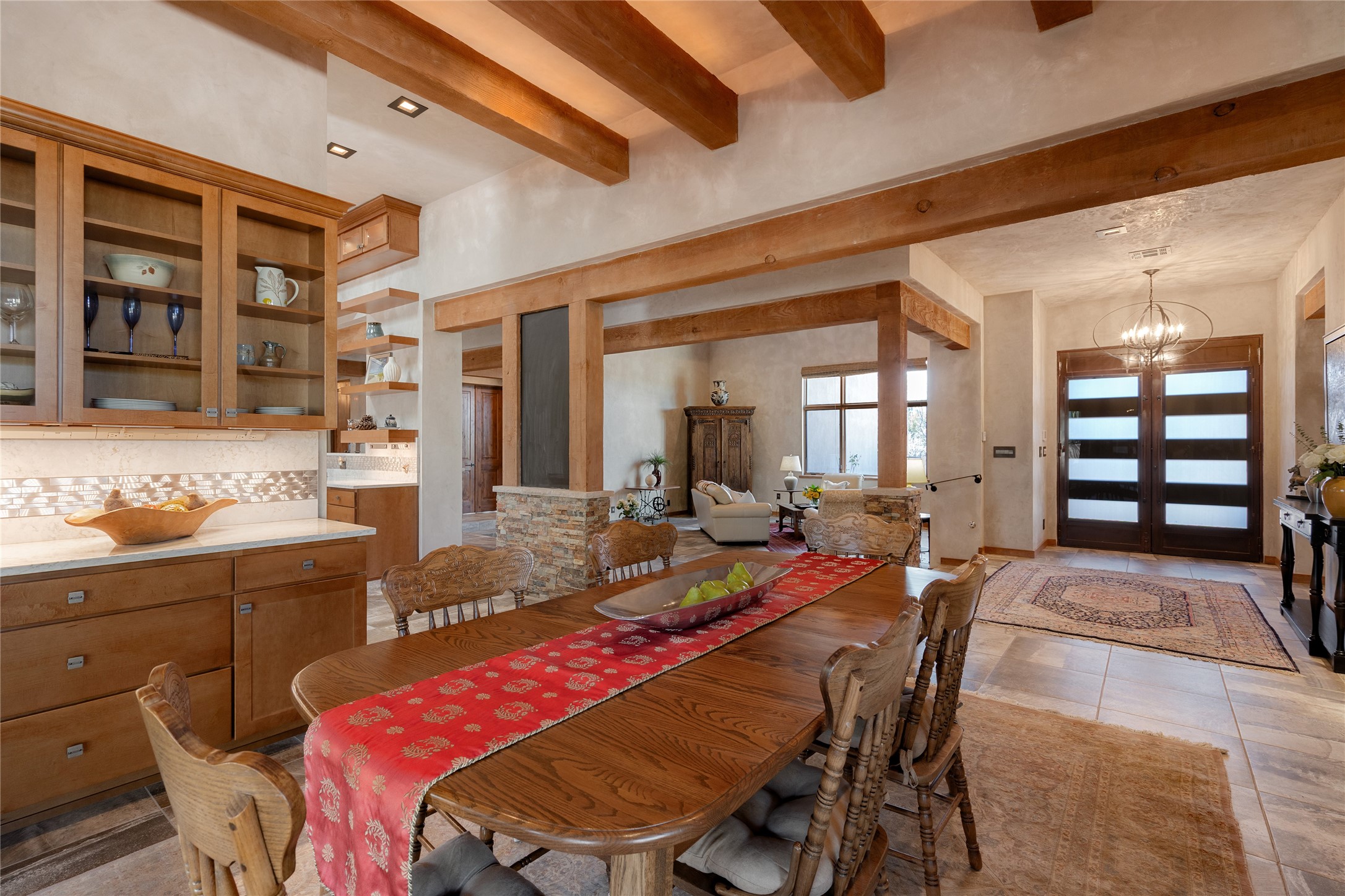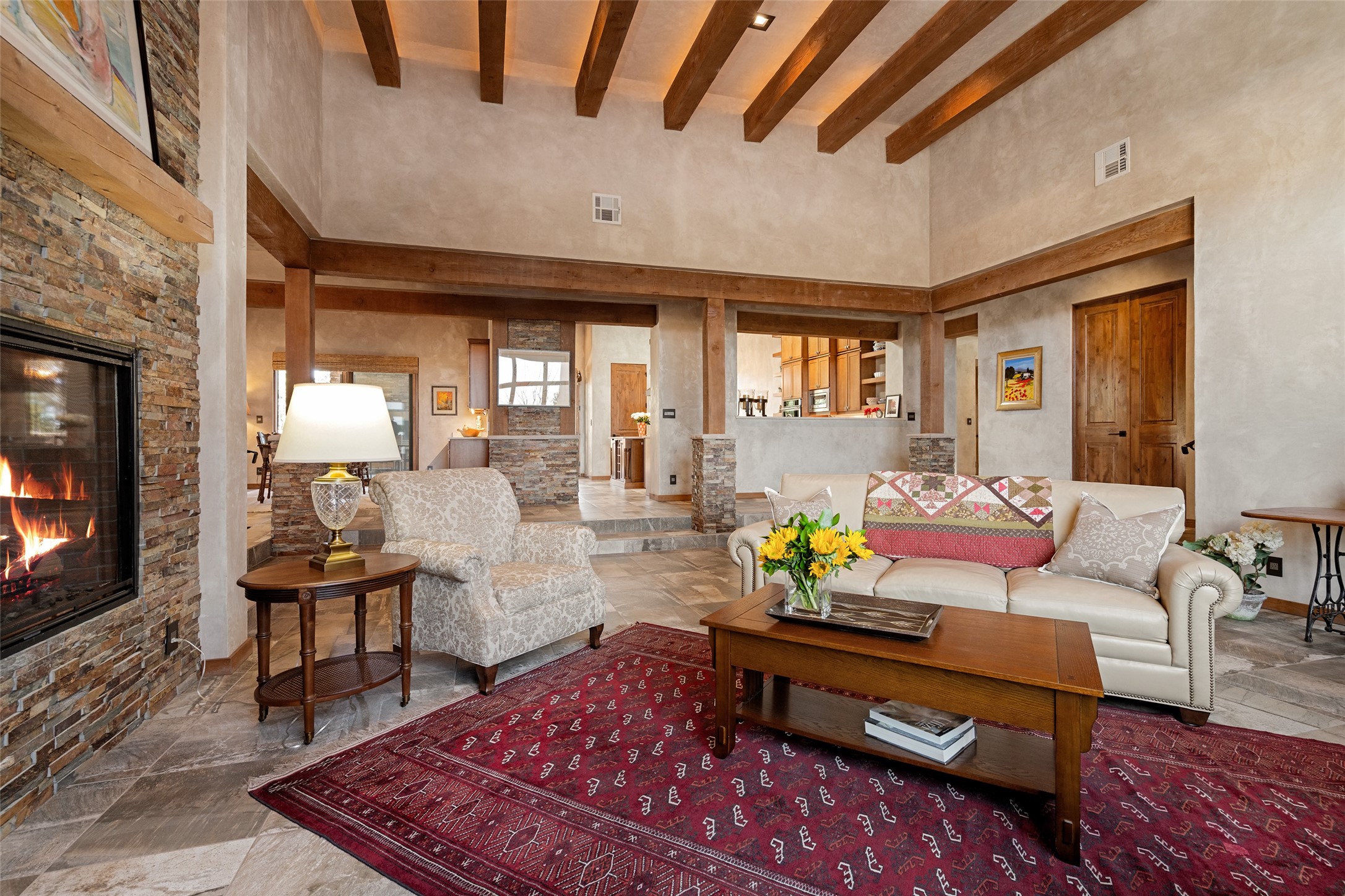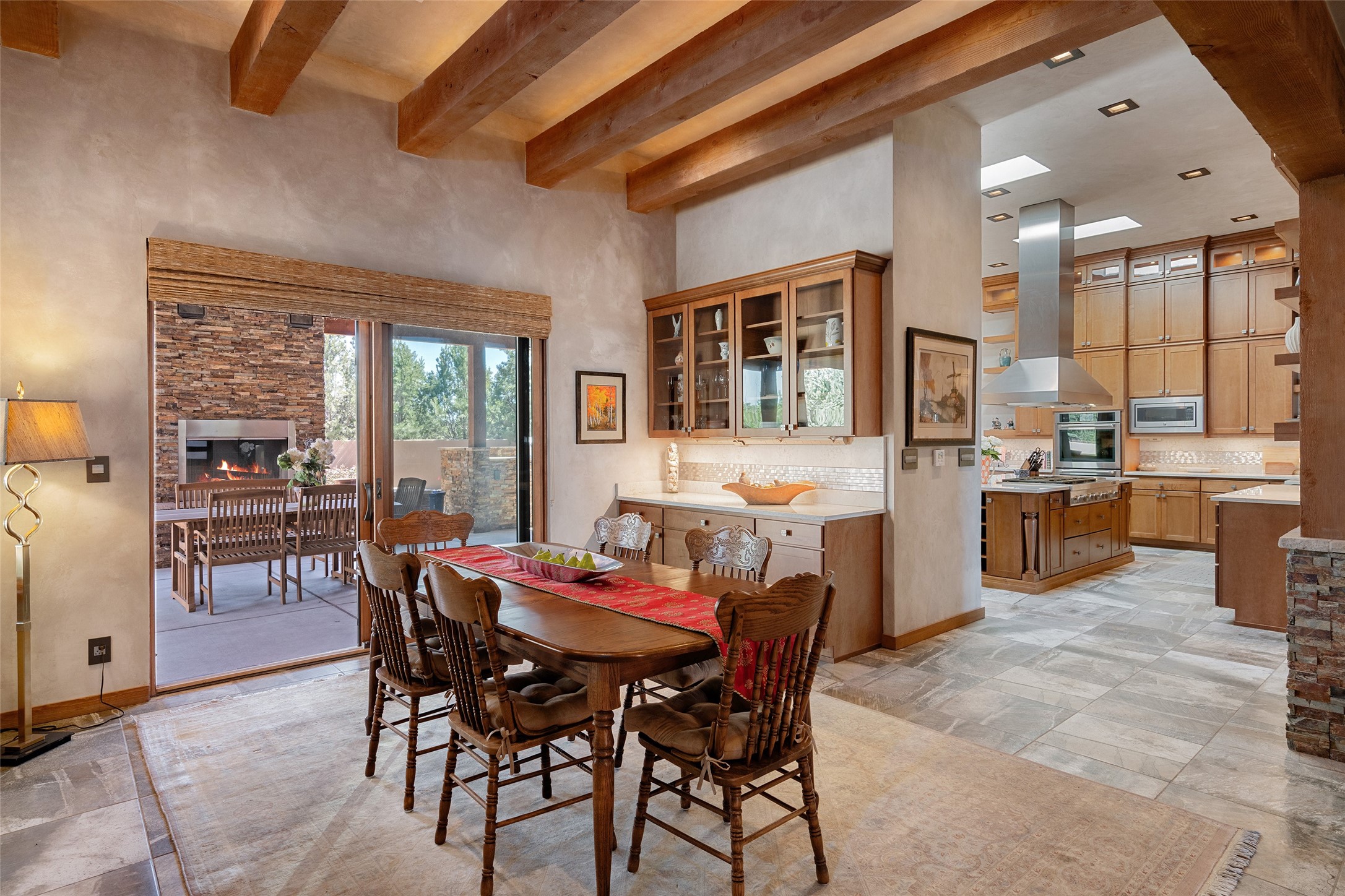 Discover a refined blend of timeless Southwestern charm and modern sophistication in this contemporary Pueblo-style home sited on 1.8+ serene acres with Jemez Mountain views. A private entry courtyard with a tranquil stone water feature welcomes you into beautifully appointed interiors featuring stone accents and high-end finishes throughout.At the heart of the home, the grand chef's kitchen is flooded with natural light from skylights and appointed with top-tier appliances, custom cabinetry and an open, entertainer-friendly layout gracefully flowing to the spacious living room, dining room and portal. The generous primary suite is a private retreat with a cozy gas fireplace, two walk-in closets, dedicated office space, a spa-inspired bath and direct access to its own portal. The well-separated guest wing includes two spacious bedrooms, each with en-suite baths for comfort and privacy. An additional large office/den with a separate entrance and private portal provides an ideal workspace or creative studio.Outdoor living is exceptional -- a spacious rear portal features a large fireplace, outdoor cooking, a pass-through to the wet bar and beverage center, a second water feature and ample room for al fresco dining and relaxation. Practical amenities include a three-car direct-entry garage and a roof-mounted Solar Pro System array. This property offers an unparalleled sanctuary for those seeking privacy, elegance and effortless indoor-outdoor living.
