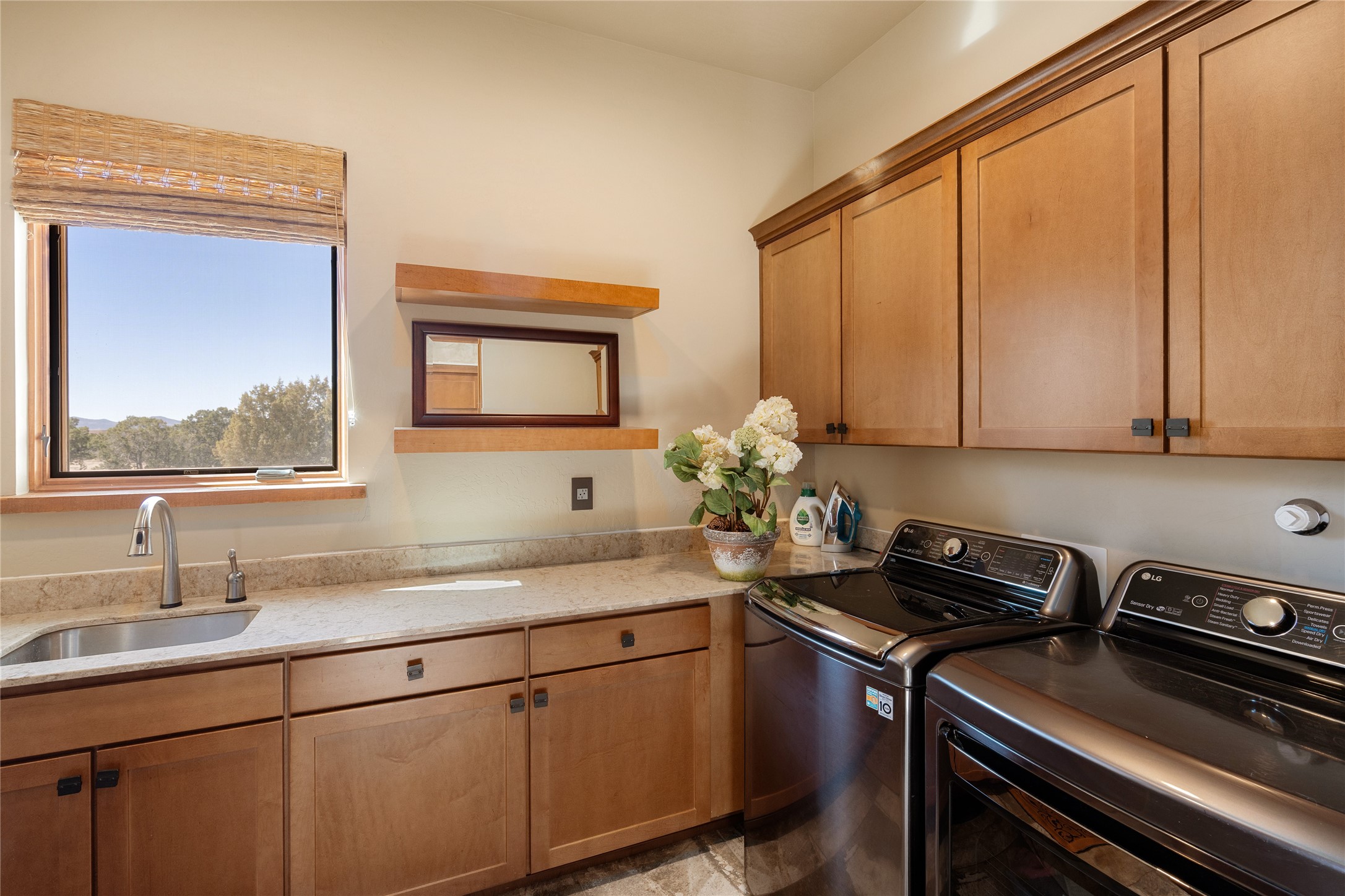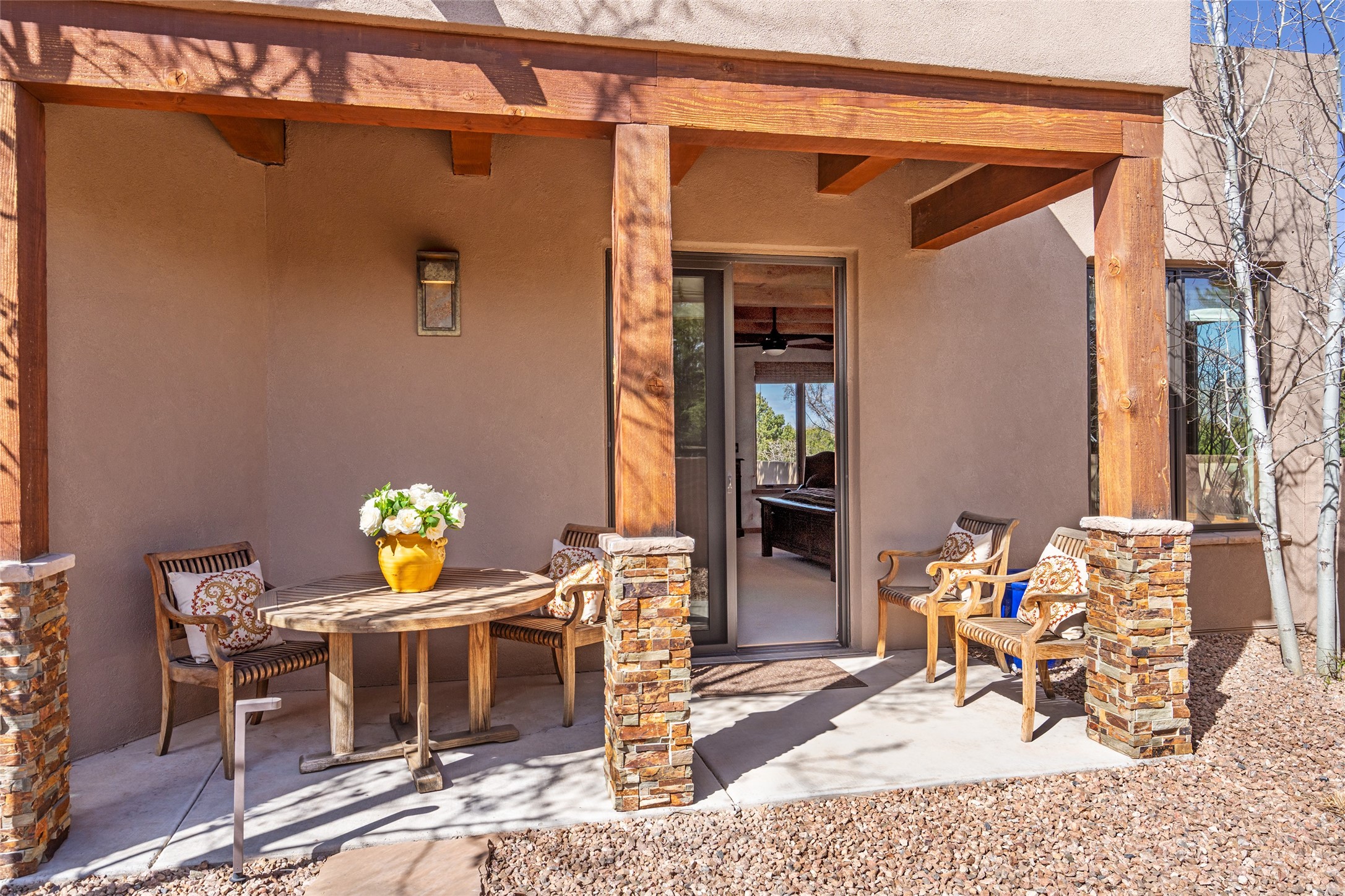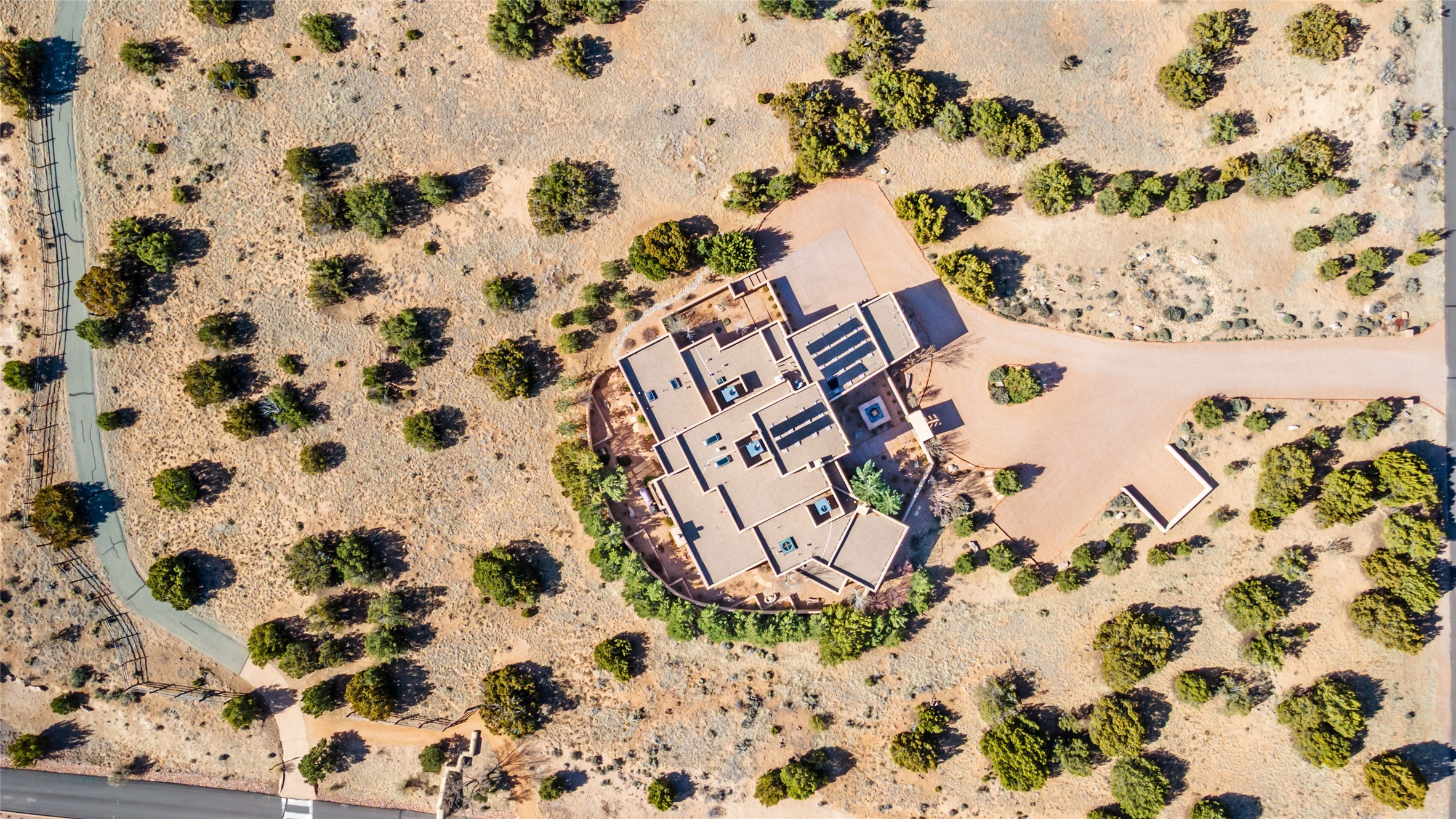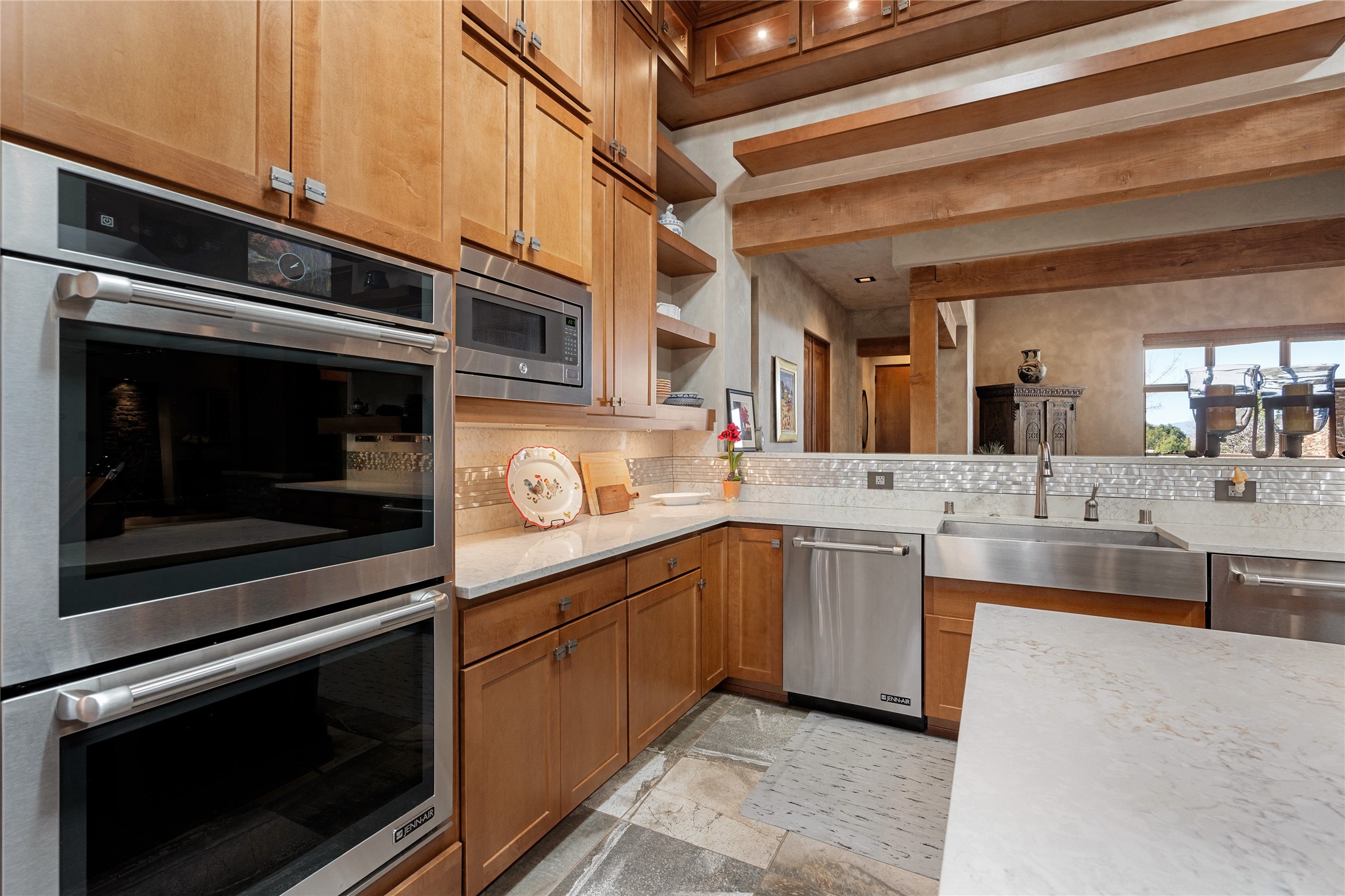 Discover a refined blend of timeless Southwestern charm and modern sophistication in this contemporary Pueblo-style home sited on 1.8+ serene acres with Jemez Mountain views. A private entry courtyard with a tranquil stone water feature welcomes you into beautifully appointed interiors featuring stone accents and high-end finishes throughout.At the heart of the home, the grand chef's kitchen is flooded with natural light from skylights and appointed with top-tier appliances, custom cabinetry and an open, entertainer-friendly layout gracefully flowing to the spacious living room, dining room and portal. The generous primary suite is a private retreat with a cozy gas fireplace, two walk-in closets, dedicated office space, a spa-inspired bath and direct access to its own portal. The well-separated guest wing includes two spacious bedrooms, each with en-suite baths for comfort and privacy. An additional large office/den with a separate entrance and private portal provides an ideal workspace or creative studio.Outdoor living is exceptional -- a spacious rear portal features a large fireplace, outdoor cooking, a pass-through to the wet bar and beverage center, a second water feature and ample room for al fresco dining and relaxation. Practical amenities include a three-car direct-entry garage and a roof-mounted Solar Pro System array. This property offers an unparalleled sanctuary for those seeking privacy, elegance and effortless indoor-outdoor living.