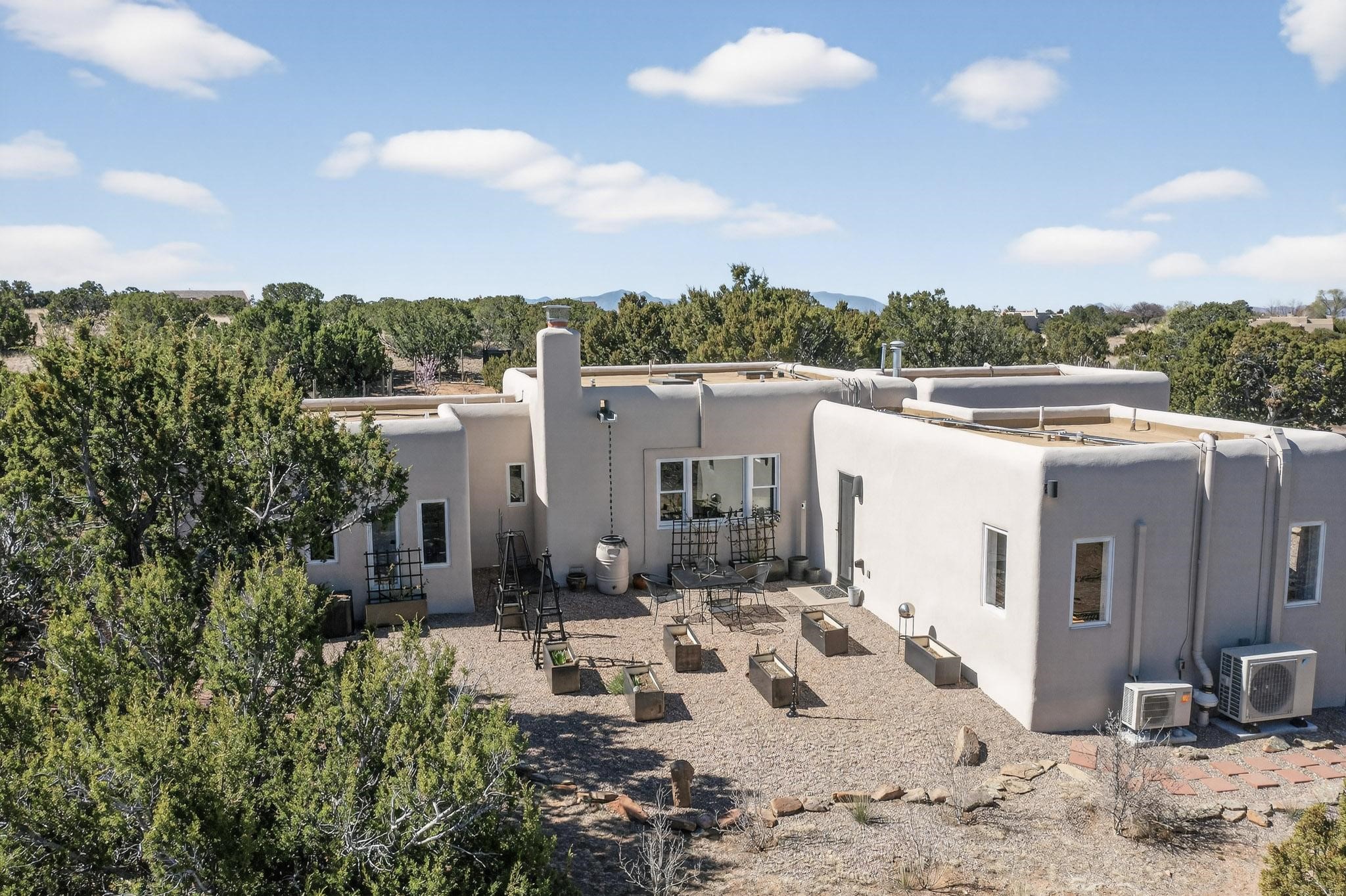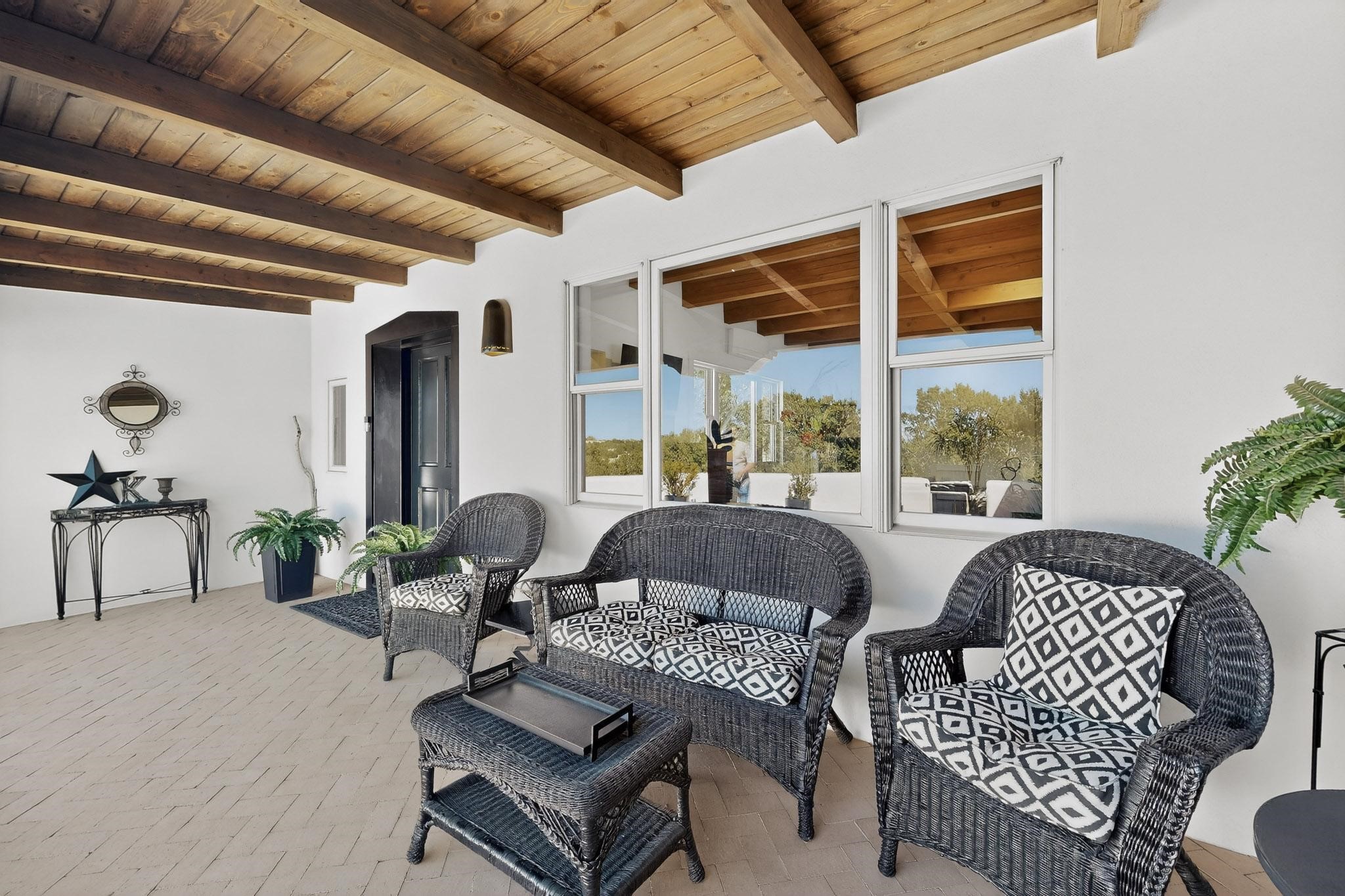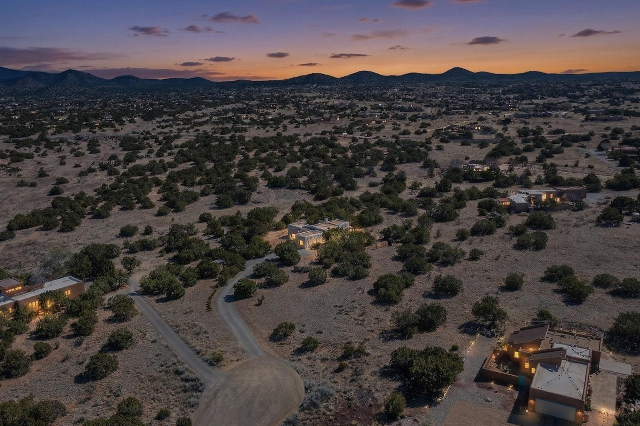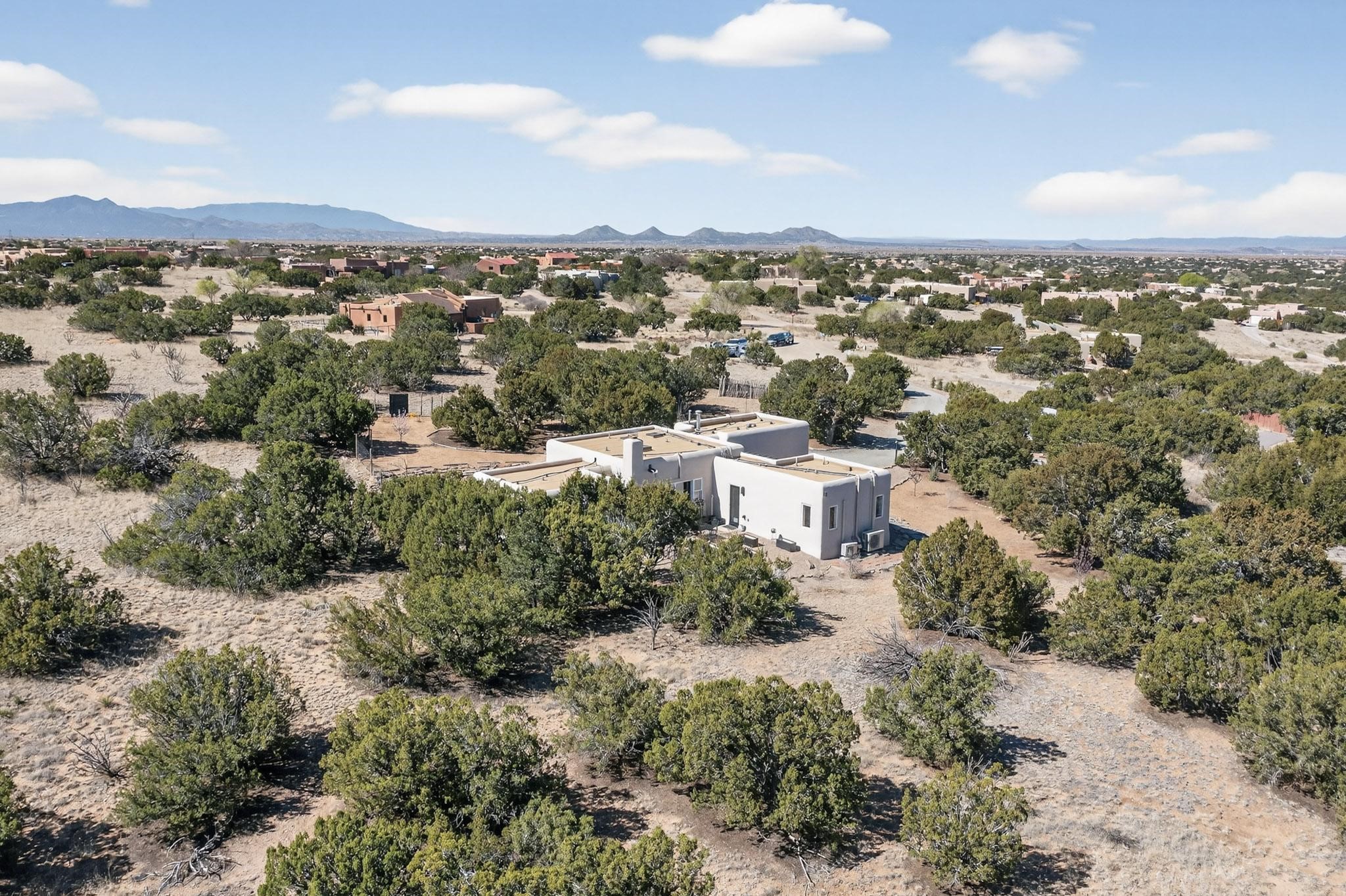 Welcome home to the Jewel of Eldorado with incredible VIEWS and privacy at the end of a long driveway. Imagine sitting on your private portal enjoying a glass of wine and taking in the beautiful mountain sunsets. This home has a split floor plan providing 2 primary suites all on one level! Enjoy and relax in your screened in back porch accessed from the house! The exterior boasts a newer roof, newer stucco (with warranties). The interior has been re-imagined while maintaining its character and has been lovingly maintained - all bathrooms, kitchen and laundry room countertops are soapstone. Original Tile de Santa Fe Flooring, solid wood beams and tongue and groove ceilings, and Talavera tile accents in all baths. 4 newer ductless mini splits, newer kitchen appliances, laundry room with additional floor to ceiling cabinetry, landscaping has enhanced hardscaping and planted trees, newer exterior gates and to top it off ... finished garage has a new ductless mini-split for studio or workshop comfort! Exterior shed, located at the end of a cul-de-sac and greenbelt, walled front courtyard patio. Property is elevated for privacy and views. No carpet, no laminate. Call listing broker for complete list of enhancements! The home is truly a gem rarely found and literally move-in ready!
