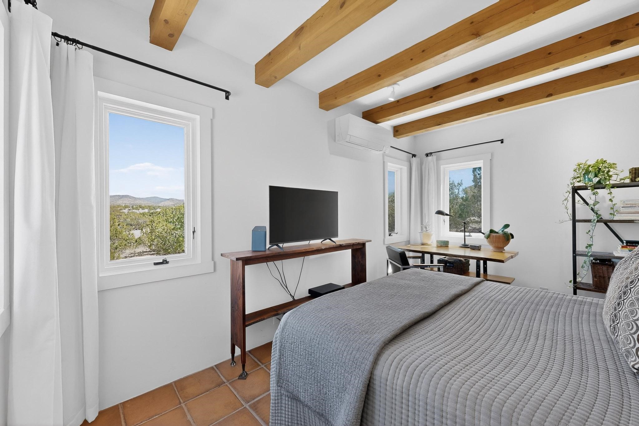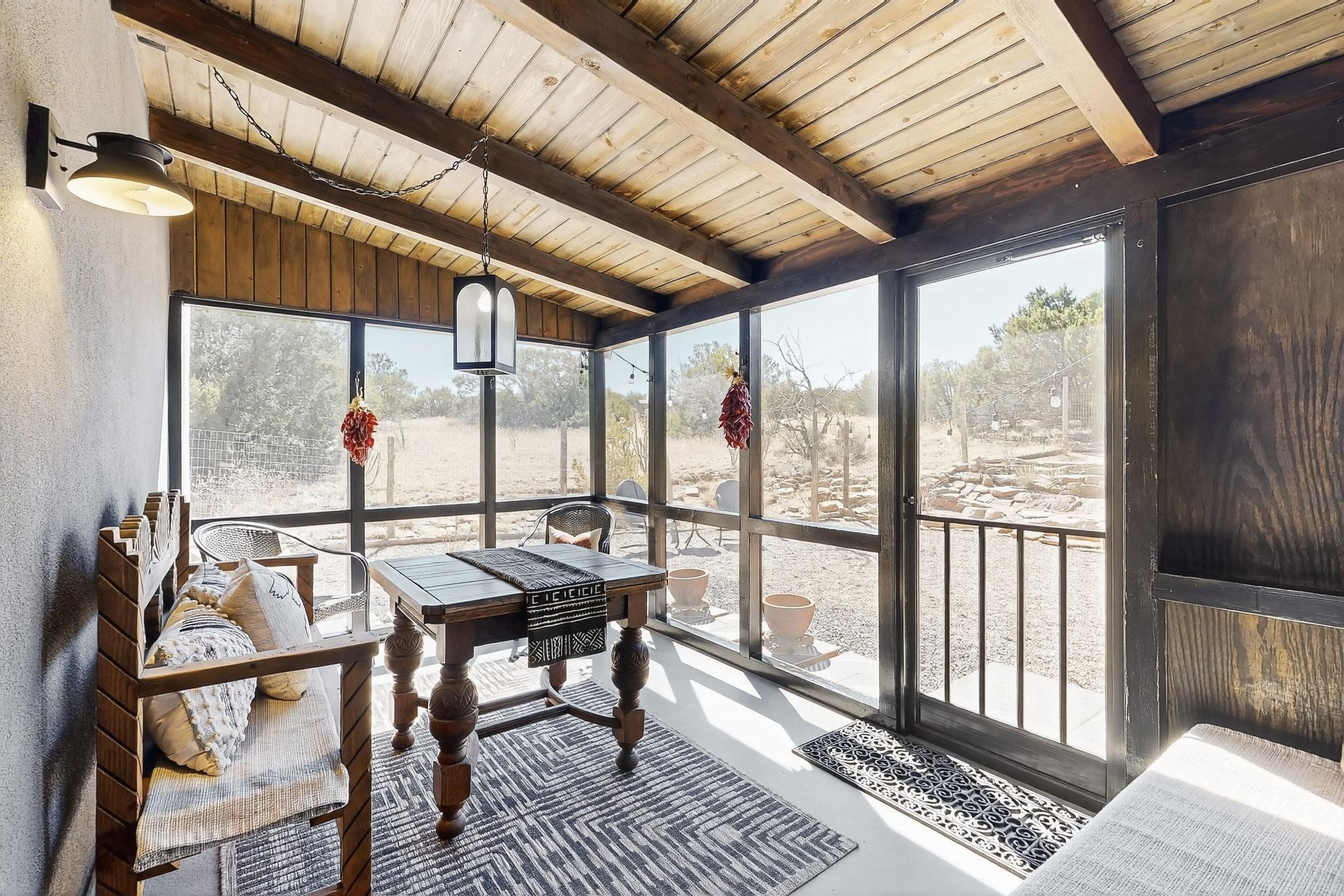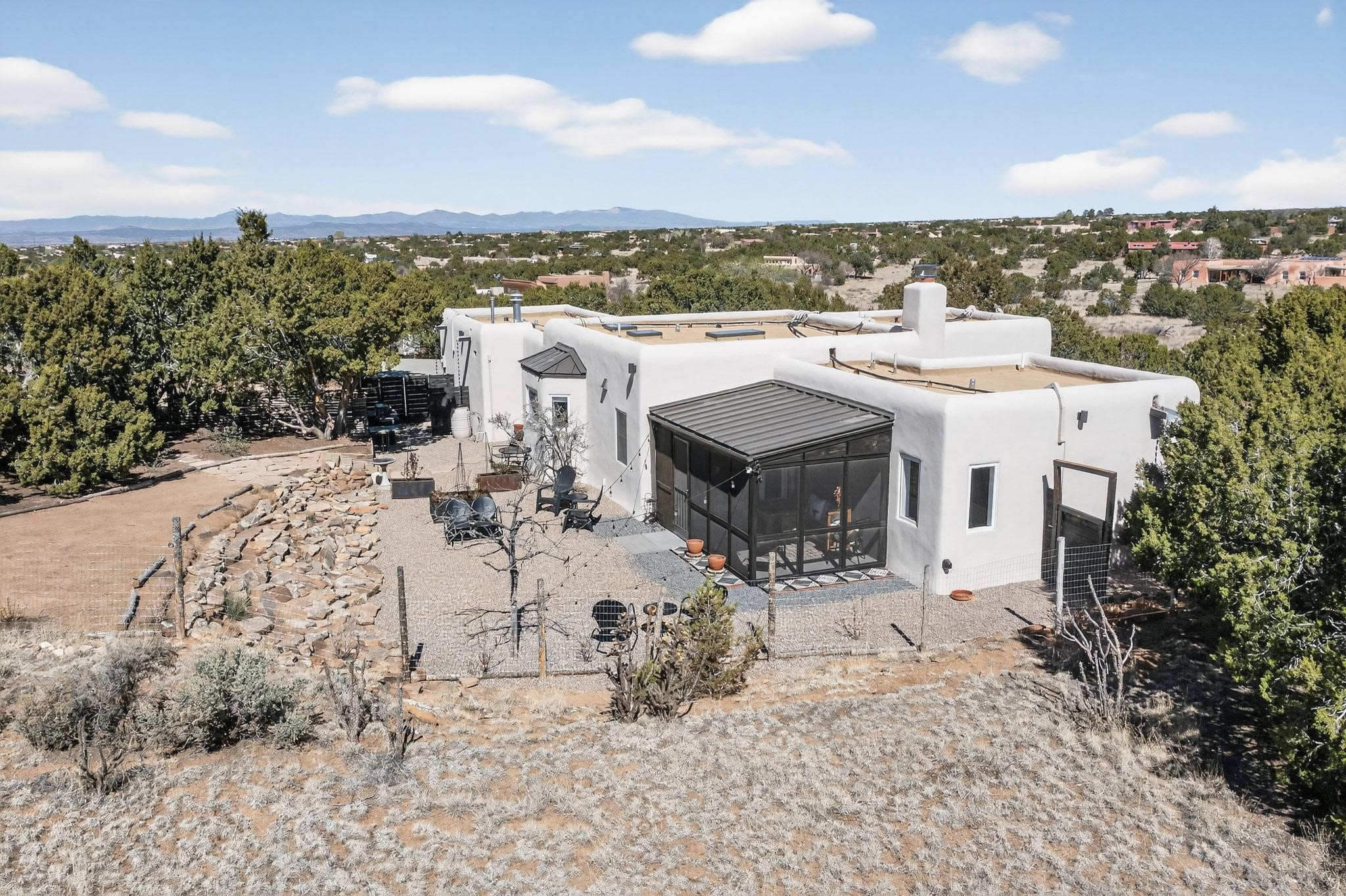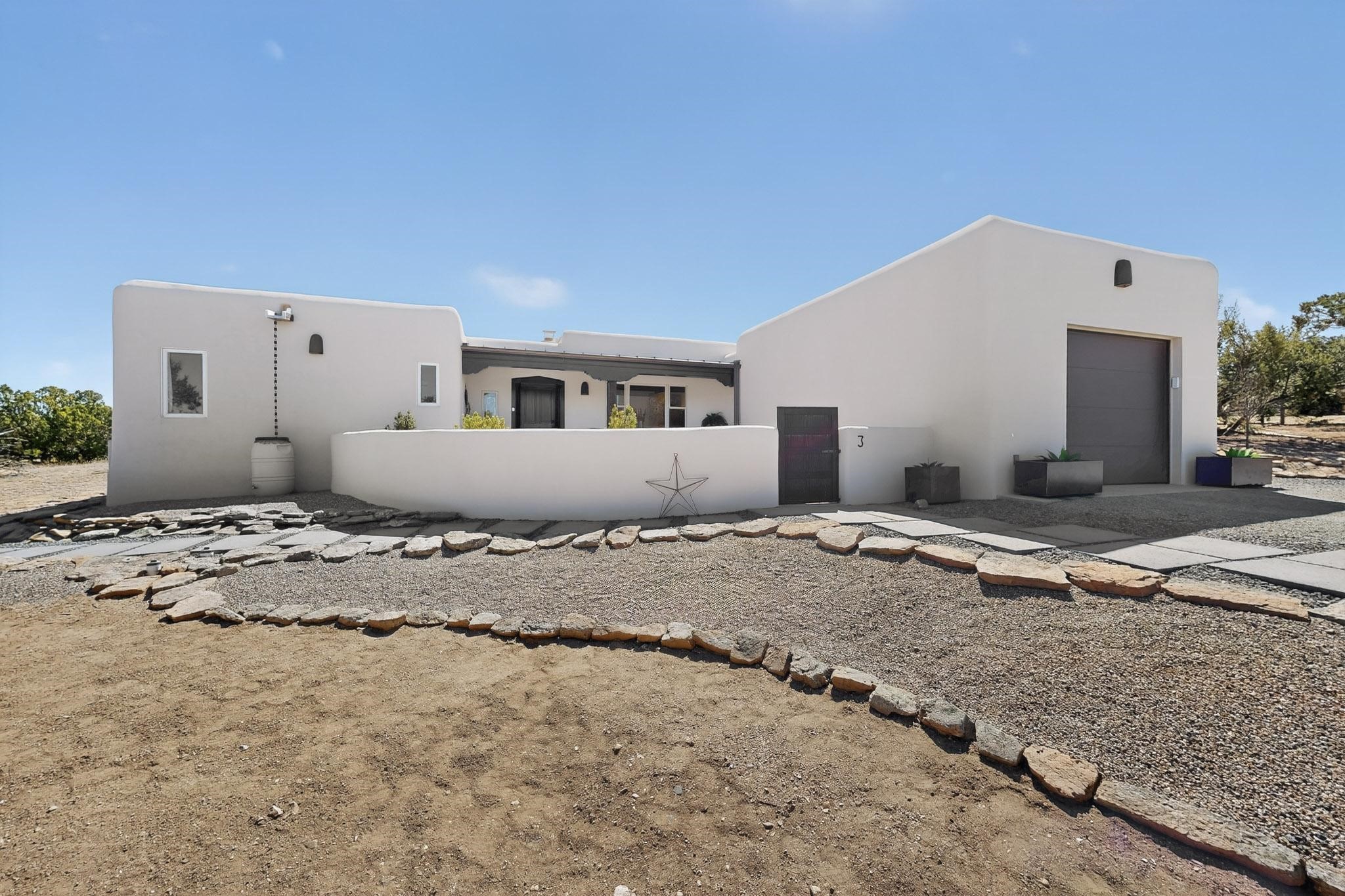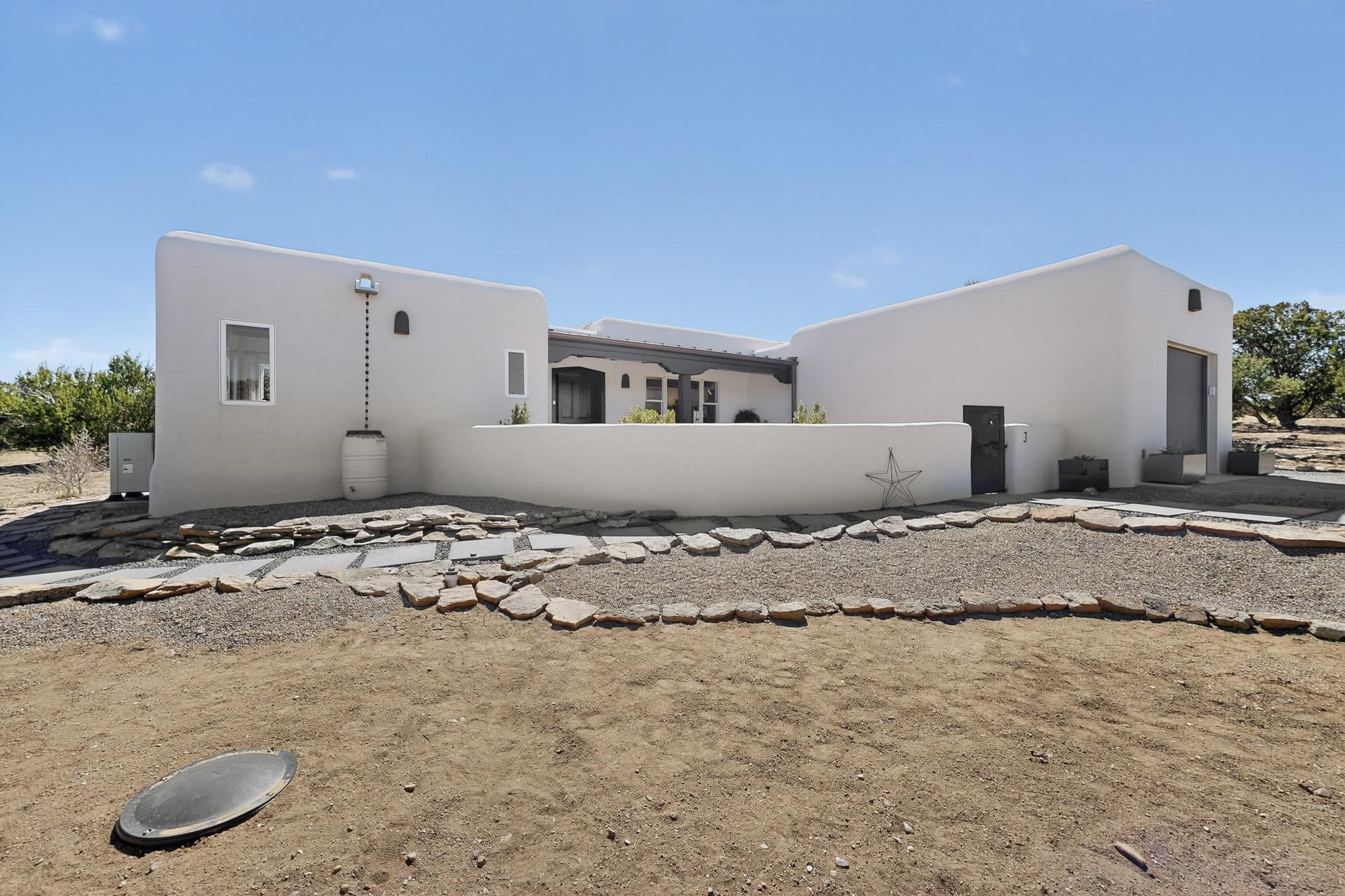 Welcome home to the Jewel of Eldorado with incredible VIEWS and privacy at the end of a long driveway. Imagine sitting on your private portal enjoying a glass of wine and taking in the beautiful mountain sunsets. This home has a split floor plan providing 2 primary suites all on one level! Enjoy and relax in your screened in back porch accessed from the house! The exterior boasts a newer roof, newer stucco (with warranties). The interior has been re-imagined while maintaining its character and has been lovingly maintained - all bathrooms, kitchen and laundry room countertops are soapstone. Original Tile de Santa Fe Flooring, solid wood beams and tongue and groove ceilings, and Talavera tile accents in all baths. 4 newer ductless mini splits, newer kitchen appliances, laundry room with additional floor to ceiling cabinetry, landscaping has enhanced hardscaping and planted trees, newer exterior gates and to top it off ... finished garage has a new ductless mini-split for studio or workshop comfort! Exterior shed, located at the end of a cul-de-sac and greenbelt, walled front courtyard patio. Property is elevated for privacy and views. No carpet, no laminate. Call listing broker for complete list of enhancements! The home is truly a gem rarely found and literally move-in ready!