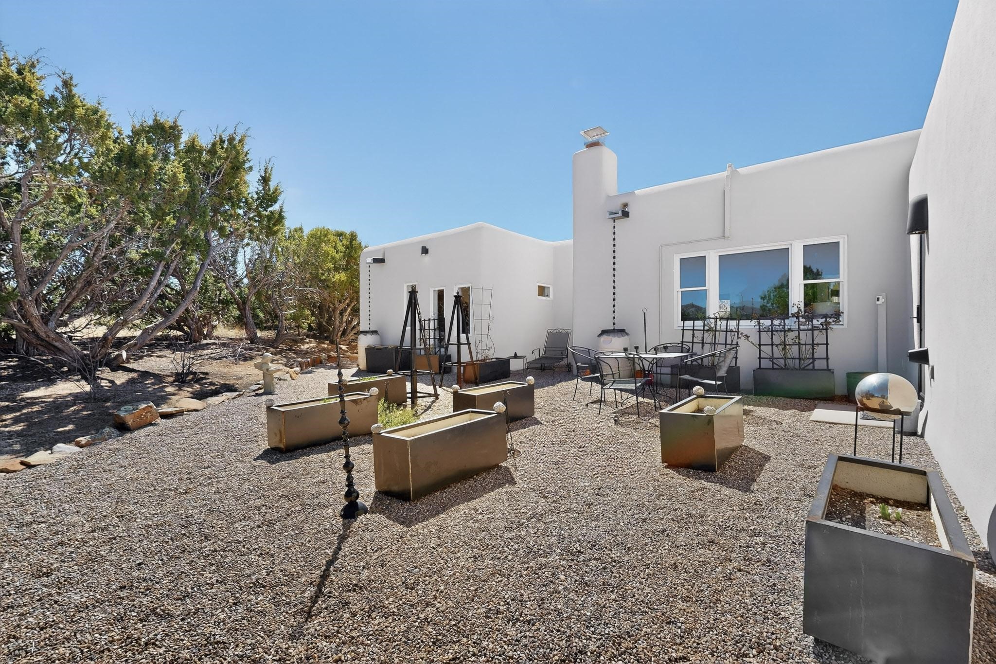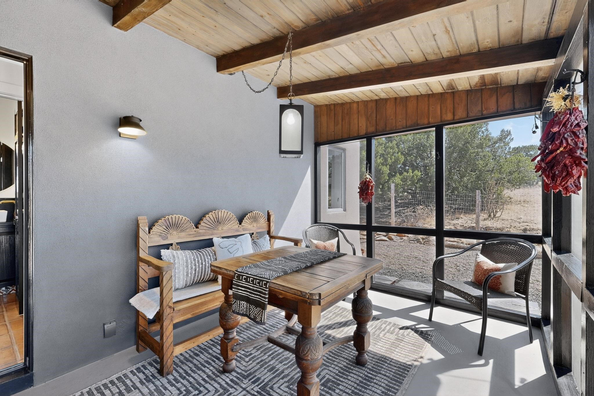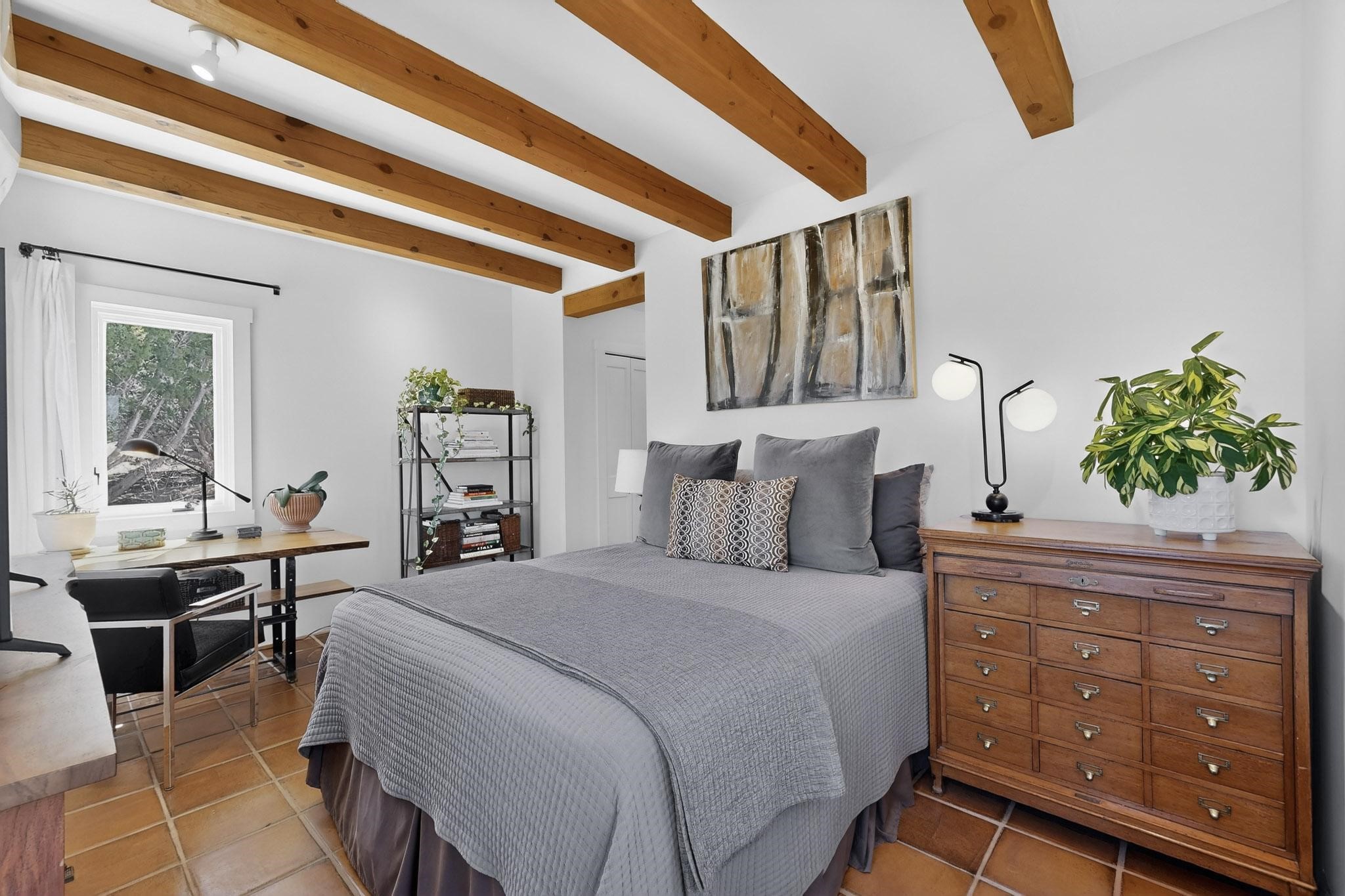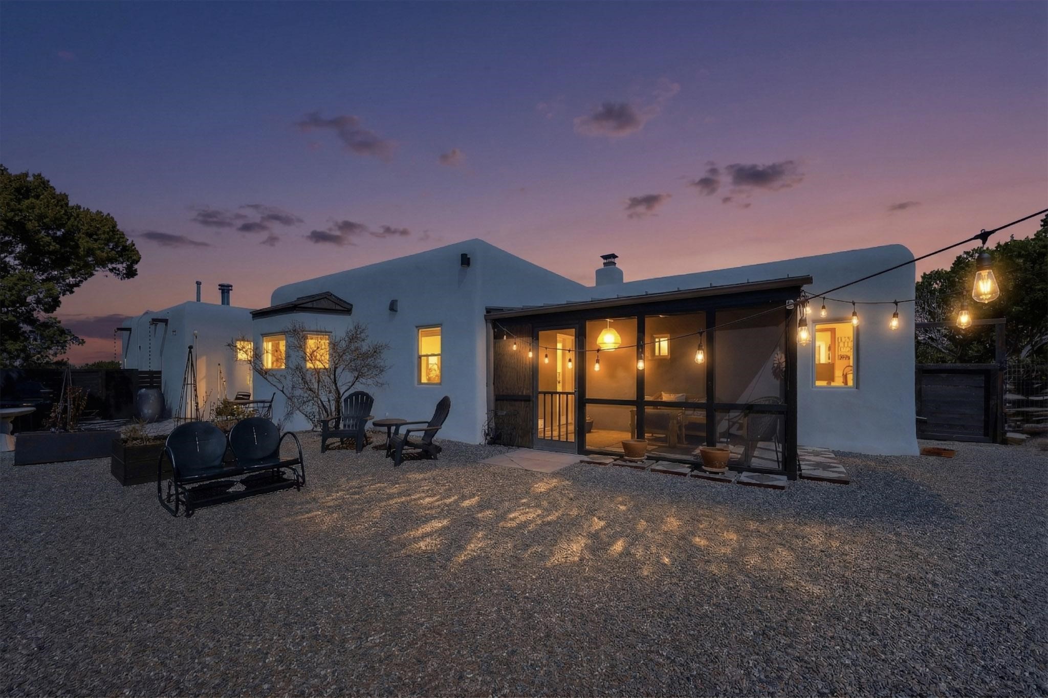 Welcome home to the Jewel of Eldorado with incredible VIEWS and privacy at the end of a long driveway. Imagine sitting on your private portal enjoying a glass of wine and taking in the beautiful mountain sunsets. This home has a split floor plan providing 2 primary suites all on one level! Enjoy and relax in your screened in back porch accessed from the house! The exterior boasts a newer roof, newer stucco (with warranties). The interior has been re-imagined while maintaining its character and has been lovingly maintained - all bathrooms, kitchen and laundry room countertops are soapstone. Original Tile de Santa Fe Flooring, solid wood beams and tongue and groove ceilings, and Talavera tile accents in all baths. 4 newer ductless mini splits, newer kitchen appliances, laundry room with additional floor to ceiling cabinetry, landscaping has enhanced hardscaping and planted trees, newer exterior gates and to top it off ... finished garage has a new ductless mini-split for studio or workshop comfort! Exterior shed, located at the end of a cul-de-sac and greenbelt, walled front courtyard patio. Property is elevated for privacy and views. No carpet, no laminate. Call listing broker for complete list of enhancements! The home is truly a gem rarely found and literally move-in ready!
