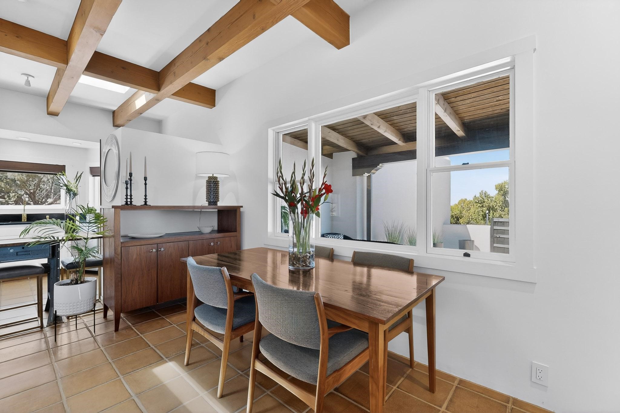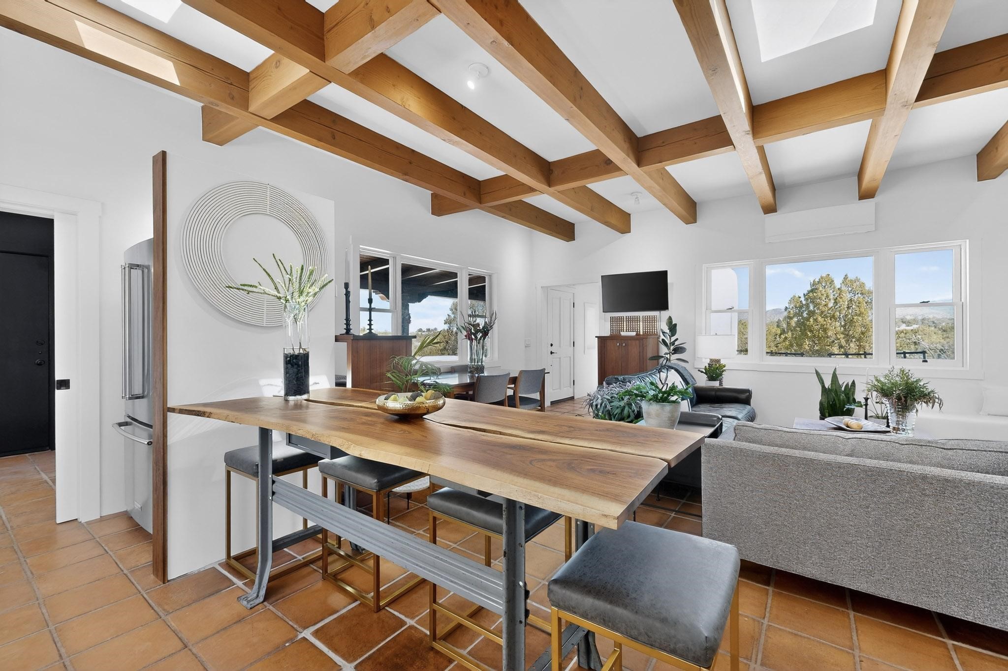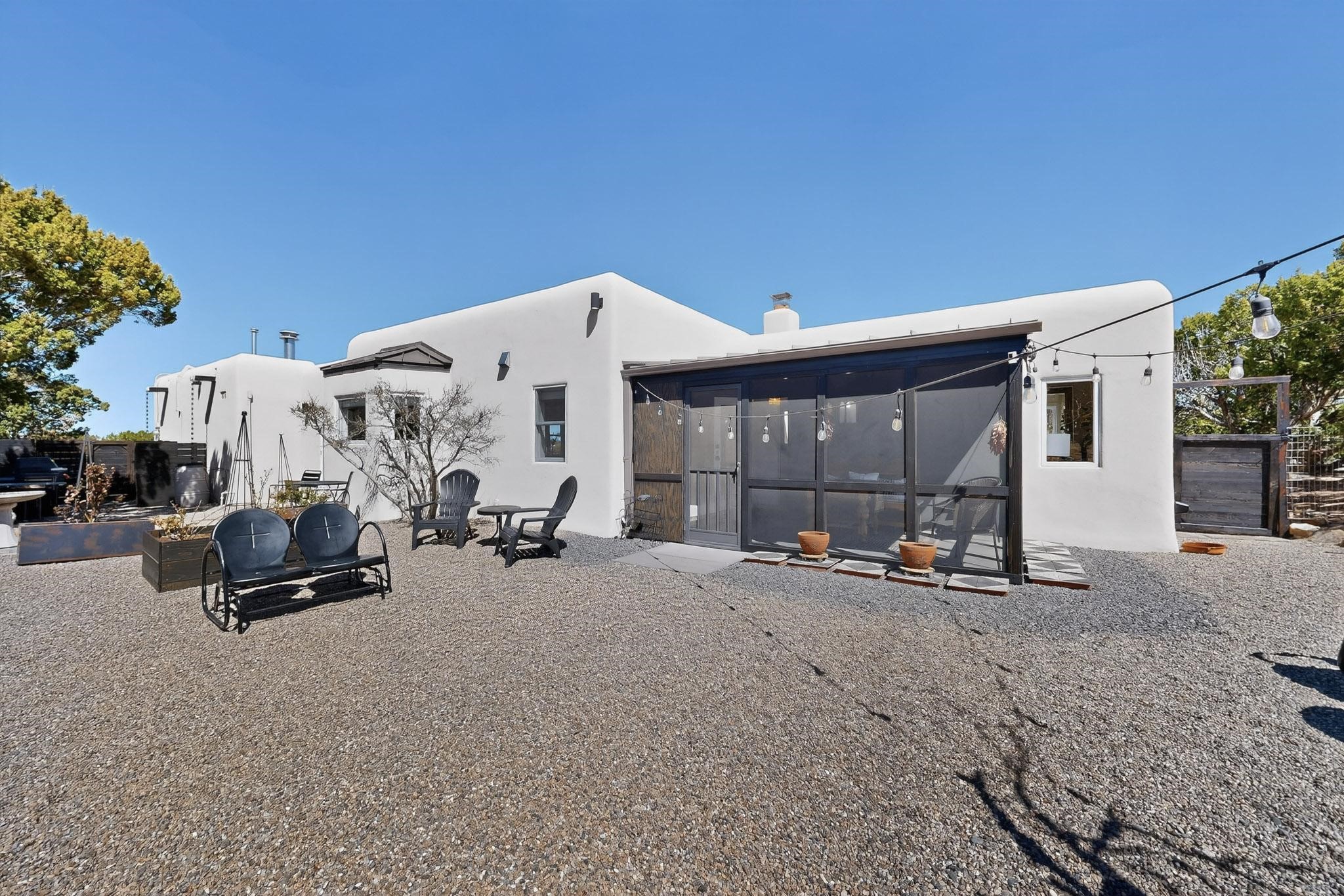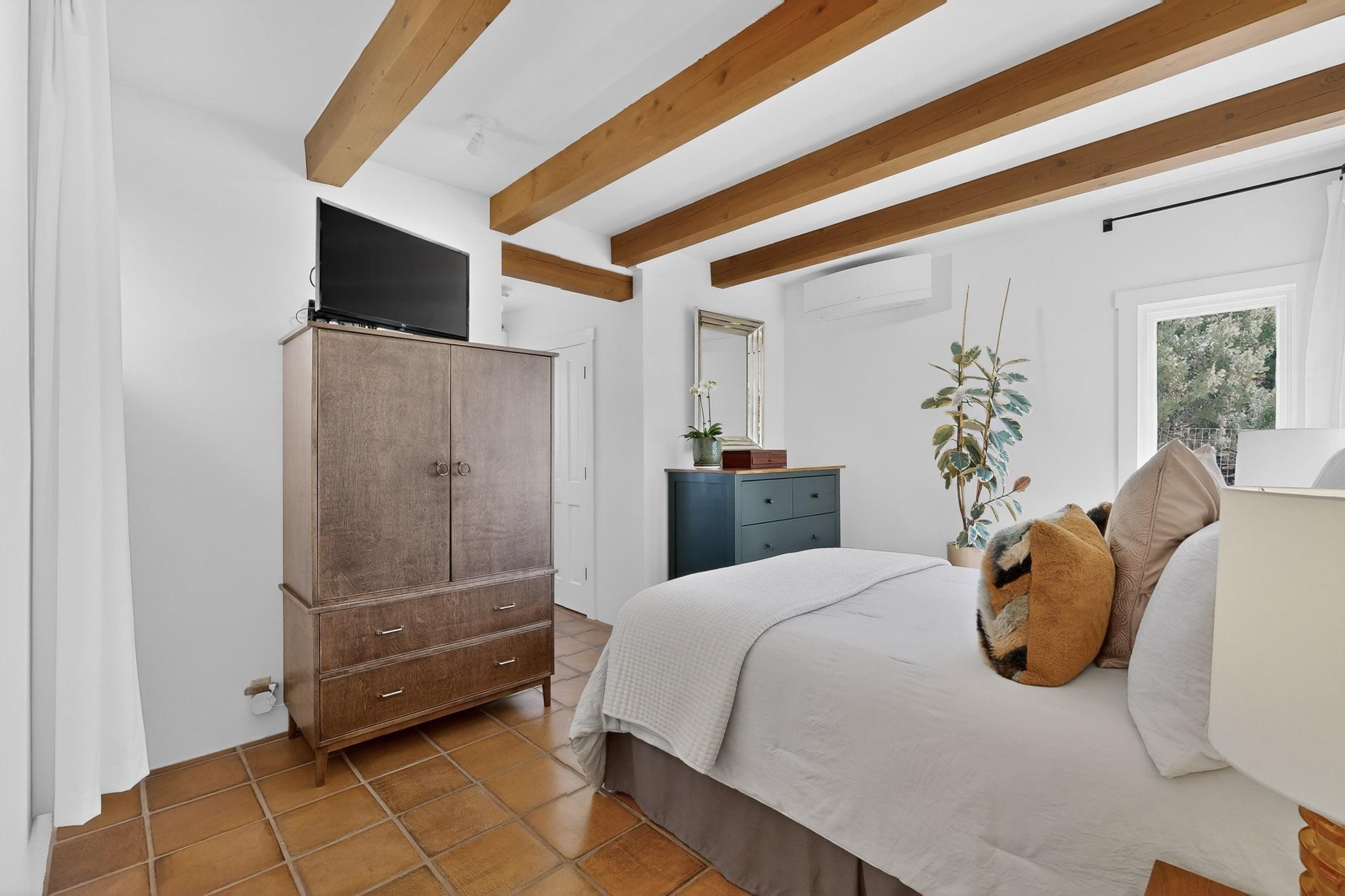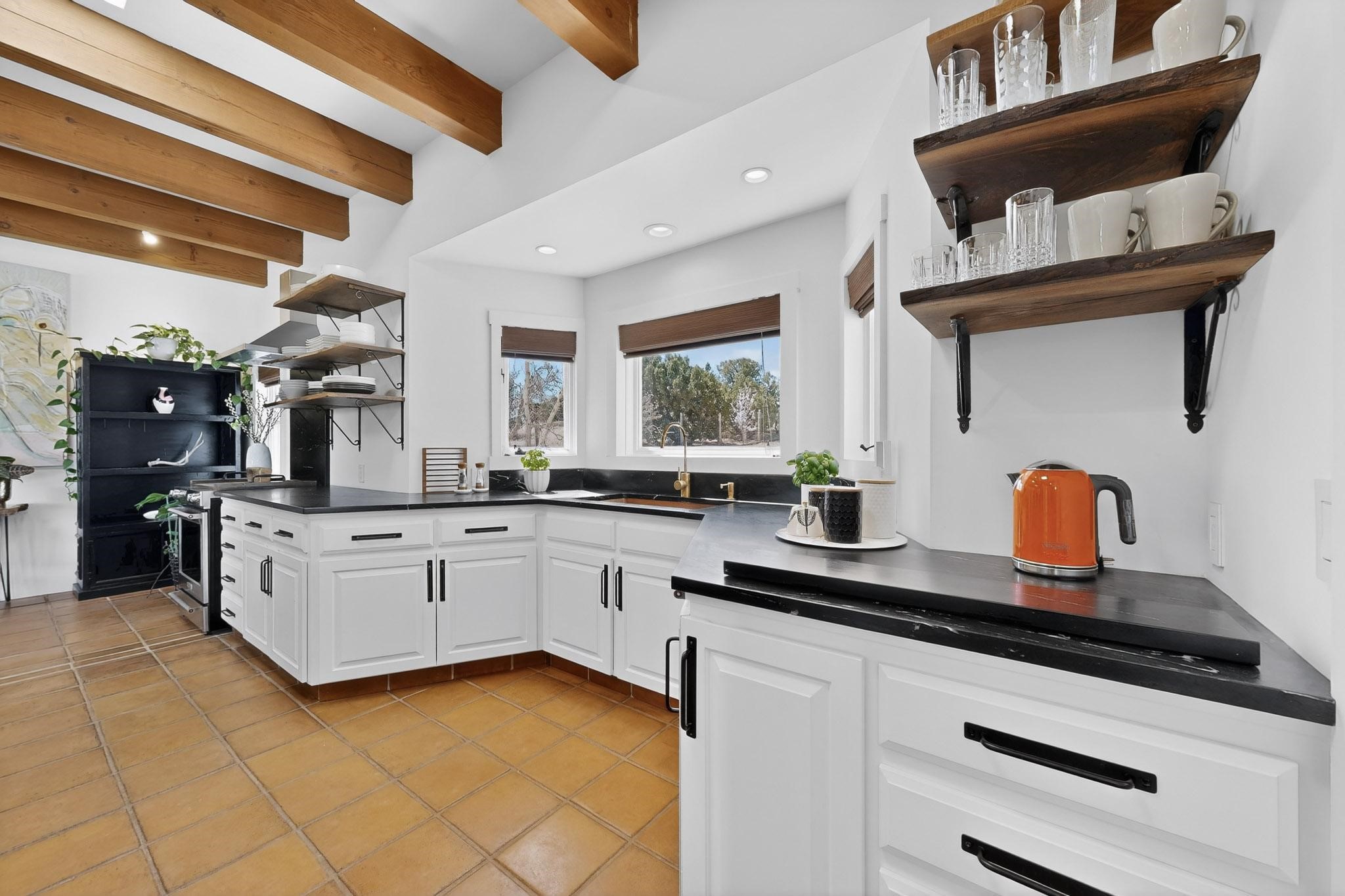 Welcome home to the Jewel of Eldorado with incredible VIEWS and privacy at the end of a long driveway. Imagine sitting on your private portal enjoying a glass of wine and taking in the beautiful mountain sunsets. This home has a split floor plan providing 2 primary suites all on one level! Enjoy and relax in your screened in back porch accessed from the house! The exterior boasts a newer roof, newer stucco (with warranties). The interior has been re-imagined while maintaining its character and has been lovingly maintained - all bathrooms, kitchen and laundry room countertops are soapstone. Original Tile de Santa Fe Flooring, solid wood beams and tongue and groove ceilings, and Talavera tile accents in all baths. 4 newer ductless mini splits, newer kitchen appliances, laundry room with additional floor to ceiling cabinetry, landscaping has enhanced hardscaping and planted trees, newer exterior gates and to top it off ... finished garage has a new ductless mini-split for studio or workshop comfort! Exterior shed, located at the end of a cul-de-sac and greenbelt, walled front courtyard patio. Property is elevated for privacy and views. No carpet, no laminate. Call listing broker for complete list of enhancements! The home is truly a gem rarely found and literally move-in ready!