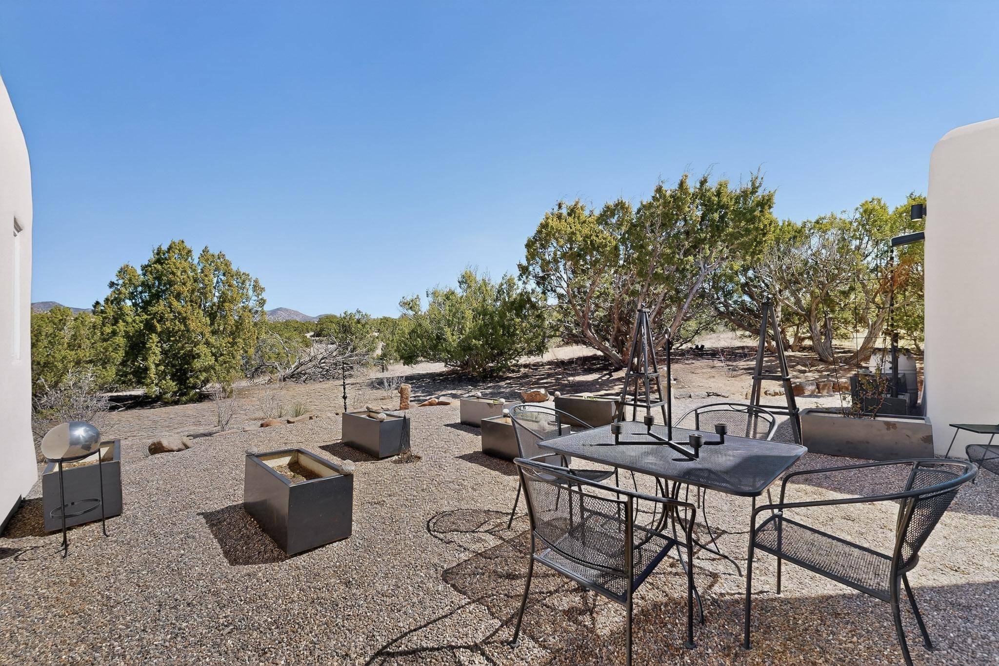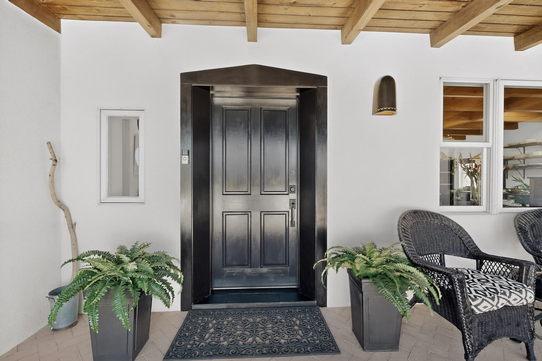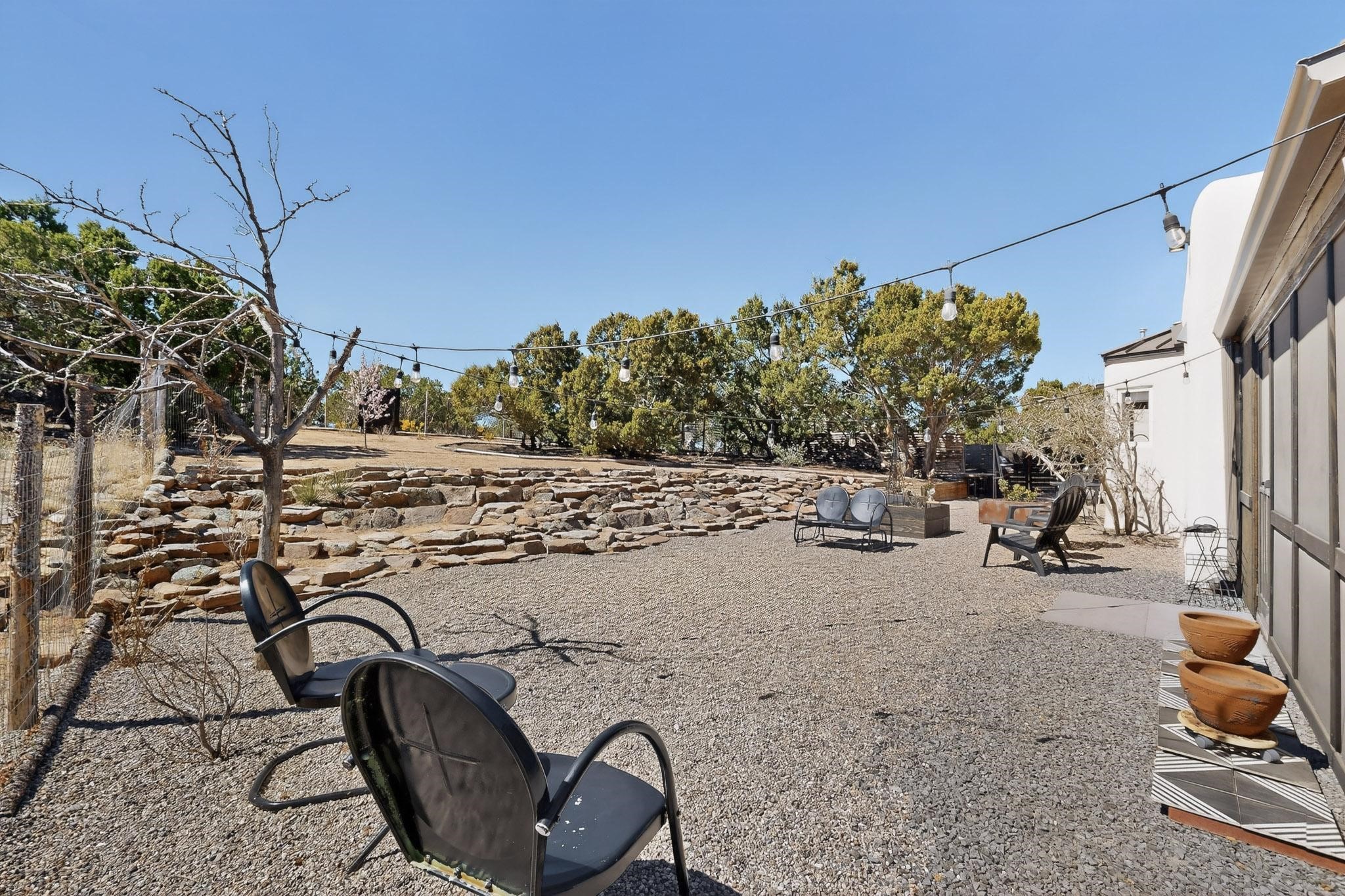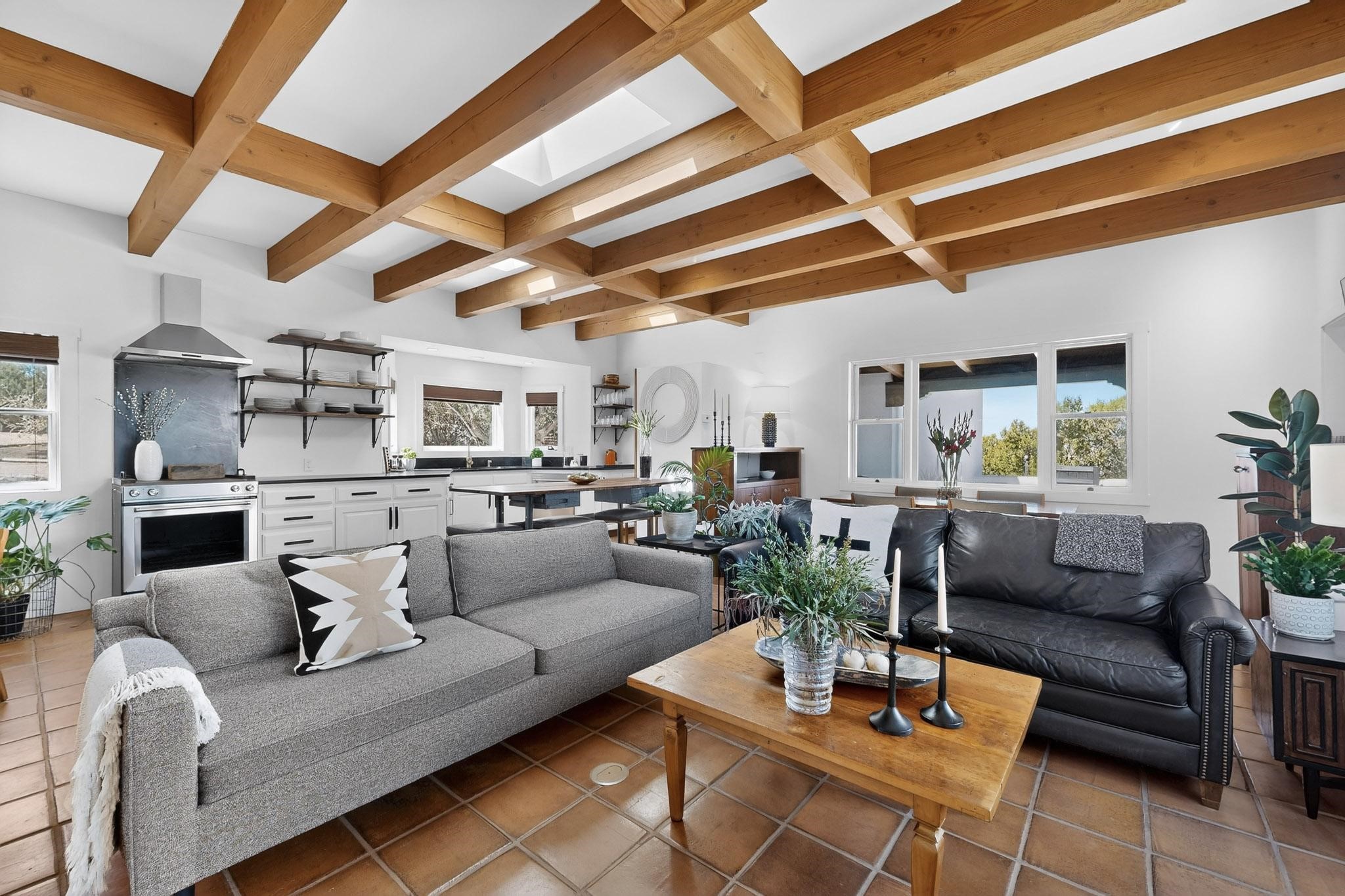Welcome home to the Jewel of Eldorado with incredible VIEWS and privacy at the end of a long driveway. Imagine sitting on your private portal enjoying a glass of wine and taking in the beautiful mountain sunsets. This home has a split floor plan providing 2 primary suites all on one level! Enjoy and relax in your screened in back porch accessed from the house! The exterior boasts a newer roof, newer stucco (with warranties). The interior has been re-imagined while maintaining its character and has been lovingly maintained - all bathrooms, kitchen and laundry room countertops are soapstone. Original Tile de Santa Fe Flooring, solid wood beams and tongue and groove ceilings, and Talavera tile accents in all baths. 4 newer ductless mini splits, newer kitchen appliances, laundry room with additional floor to ceiling cabinetry, landscaping has enhanced hardscaping and planted trees, newer exterior gates and to top it off ... finished garage has a new ductless mini-split for studio or workshop comfort! Exterior shed, located at the end of a cul-de-sac and greenbelt, walled front courtyard patio. Property is elevated for privacy and views. No carpet, no laminate. Call listing broker for complete list of enhancements! The home is truly a gem rarely found and literally move-in ready!