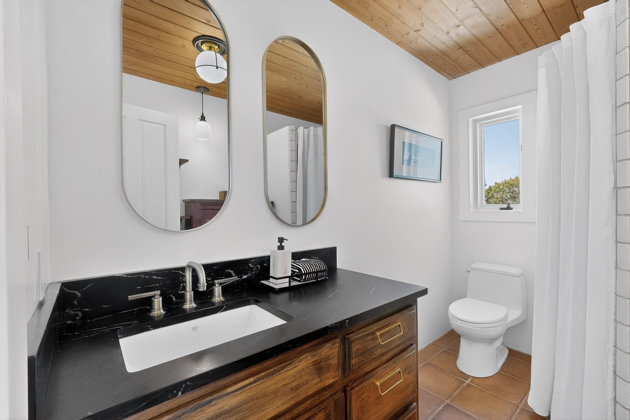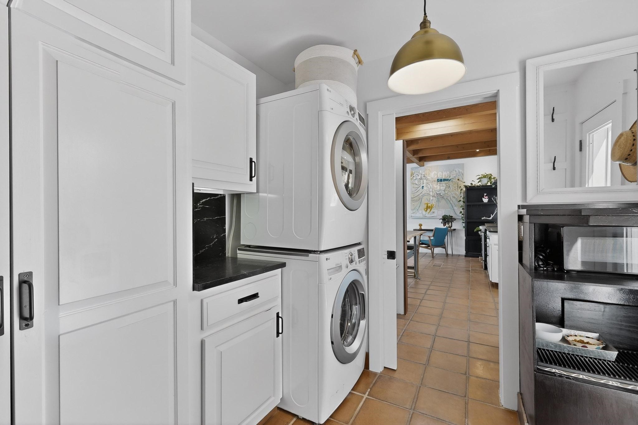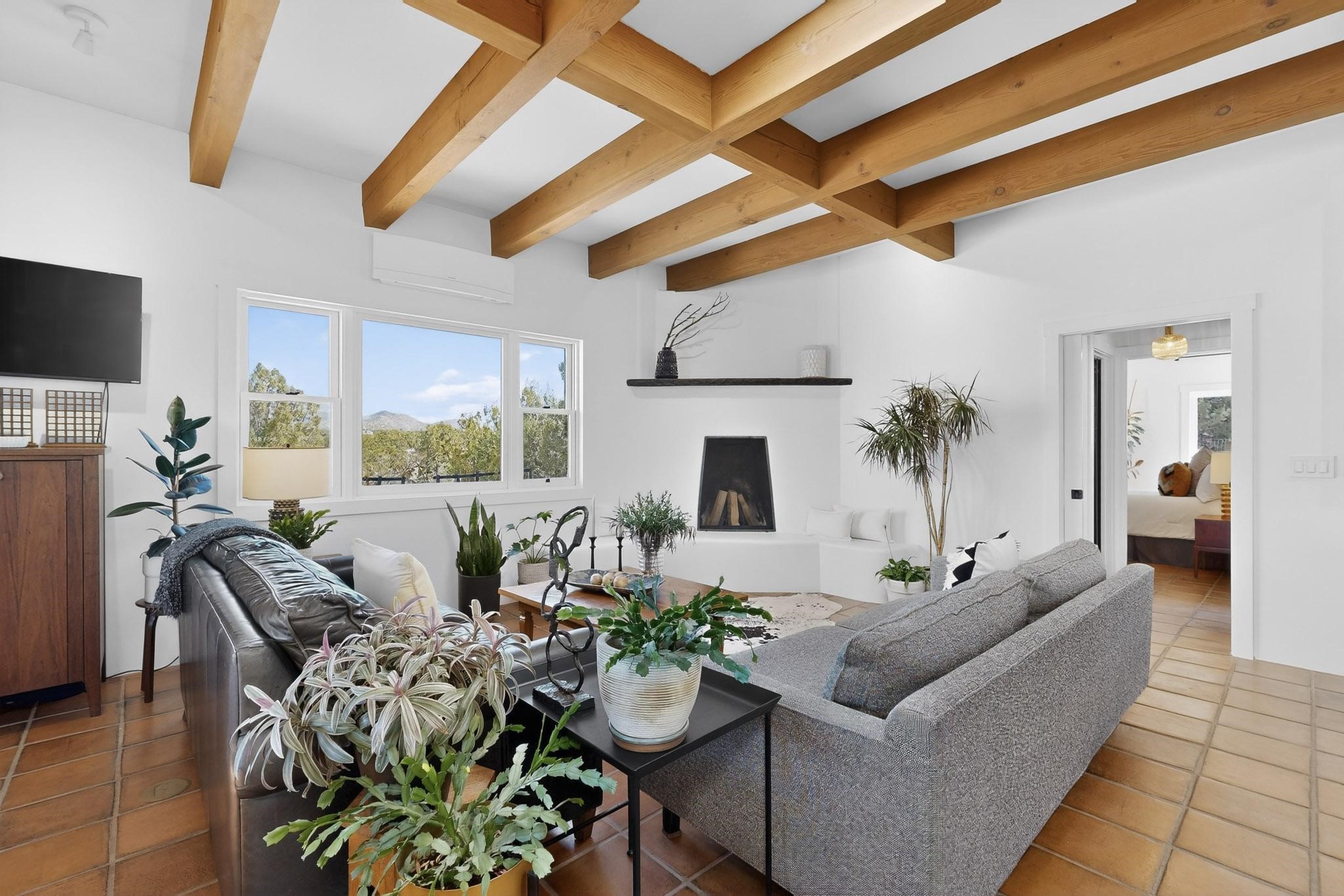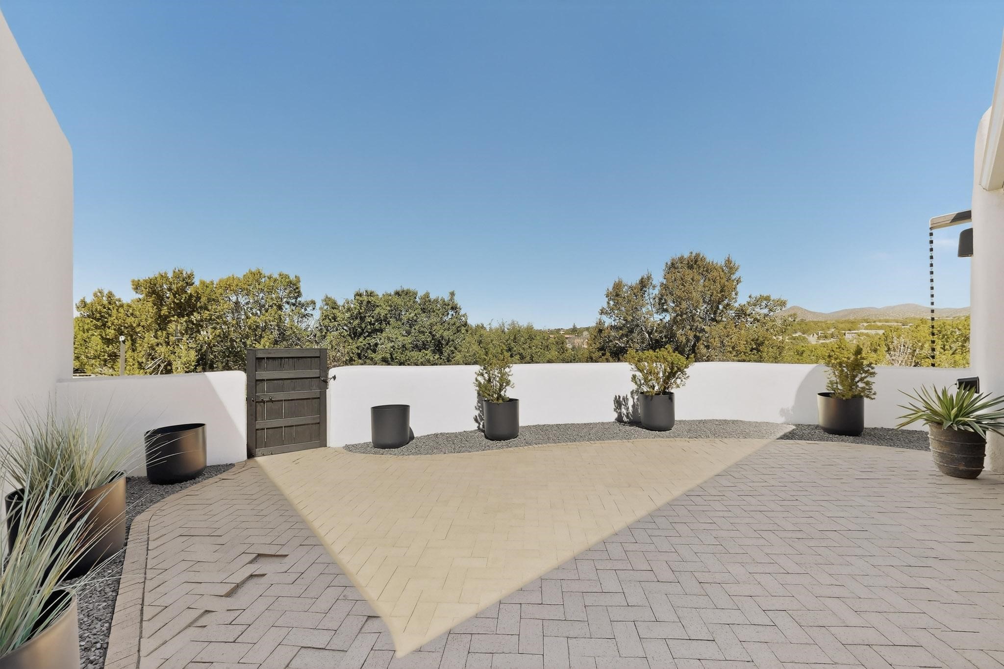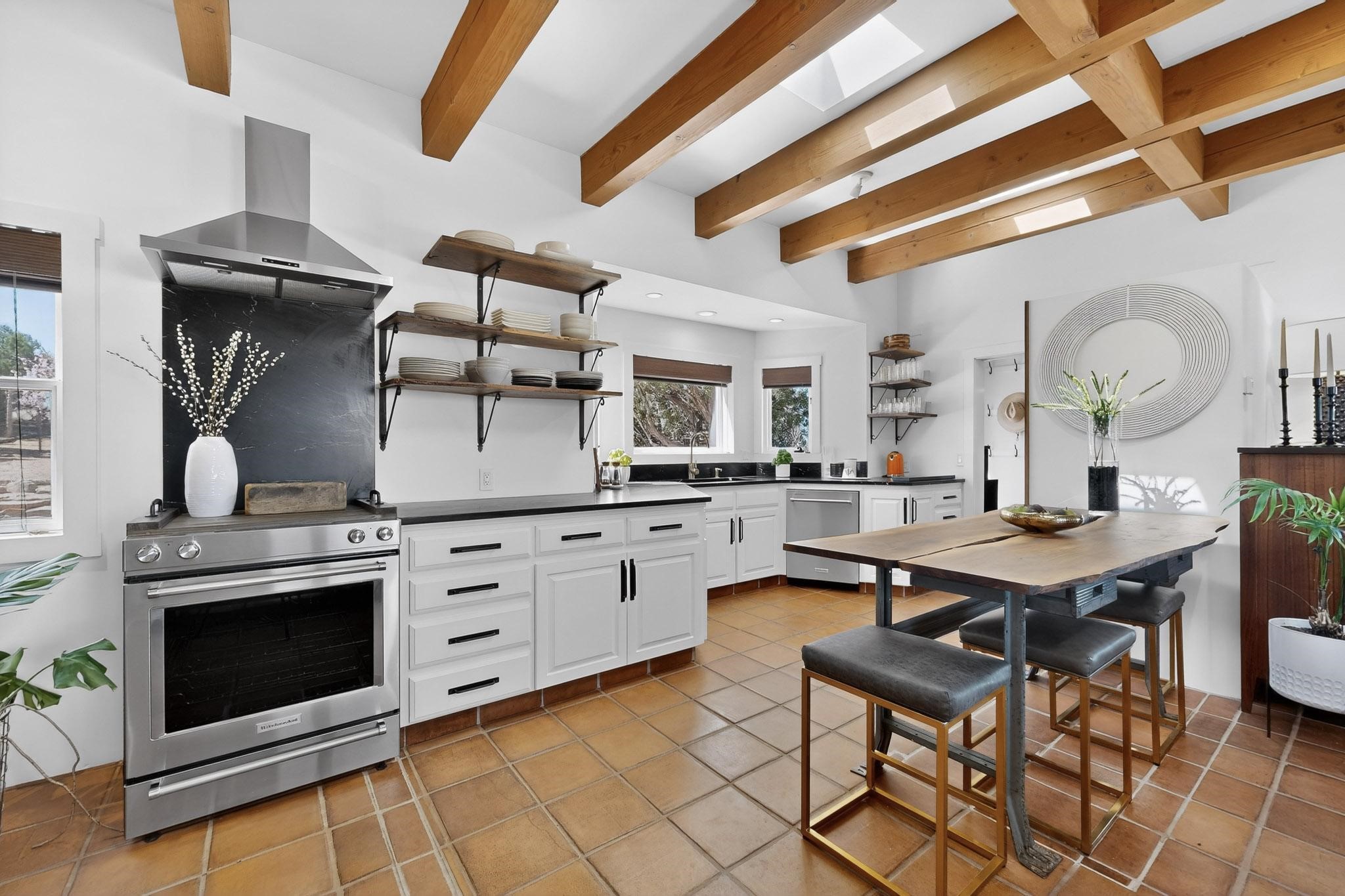 Welcome home to the Jewel of Eldorado with incredible VIEWS and privacy at the end of a long driveway. Imagine sitting on your private portal enjoying a glass of wine and taking in the beautiful mountain sunsets. This home has a split floor plan providing 2 primary suites all on one level! Enjoy and relax in your screened in back porch accessed from the house! The exterior boasts a newer roof, newer stucco (with warranties). The interior has been re-imagined while maintaining its character and has been lovingly maintained - all bathrooms, kitchen and laundry room countertops are soapstone. Original Tile de Santa Fe Flooring, solid wood beams and tongue and groove ceilings, and Talavera tile accents in all baths. 4 newer ductless mini splits, newer kitchen appliances, laundry room with additional floor to ceiling cabinetry, landscaping has enhanced hardscaping and planted trees, newer exterior gates and to top it off ... finished garage has a new ductless mini-split for studio or workshop comfort! Exterior shed, located at the end of a cul-de-sac and greenbelt, walled front courtyard patio. Property is elevated for privacy and views. No carpet, no laminate. Call listing broker for complete list of enhancements! The home is truly a gem rarely found and literally move-in ready!