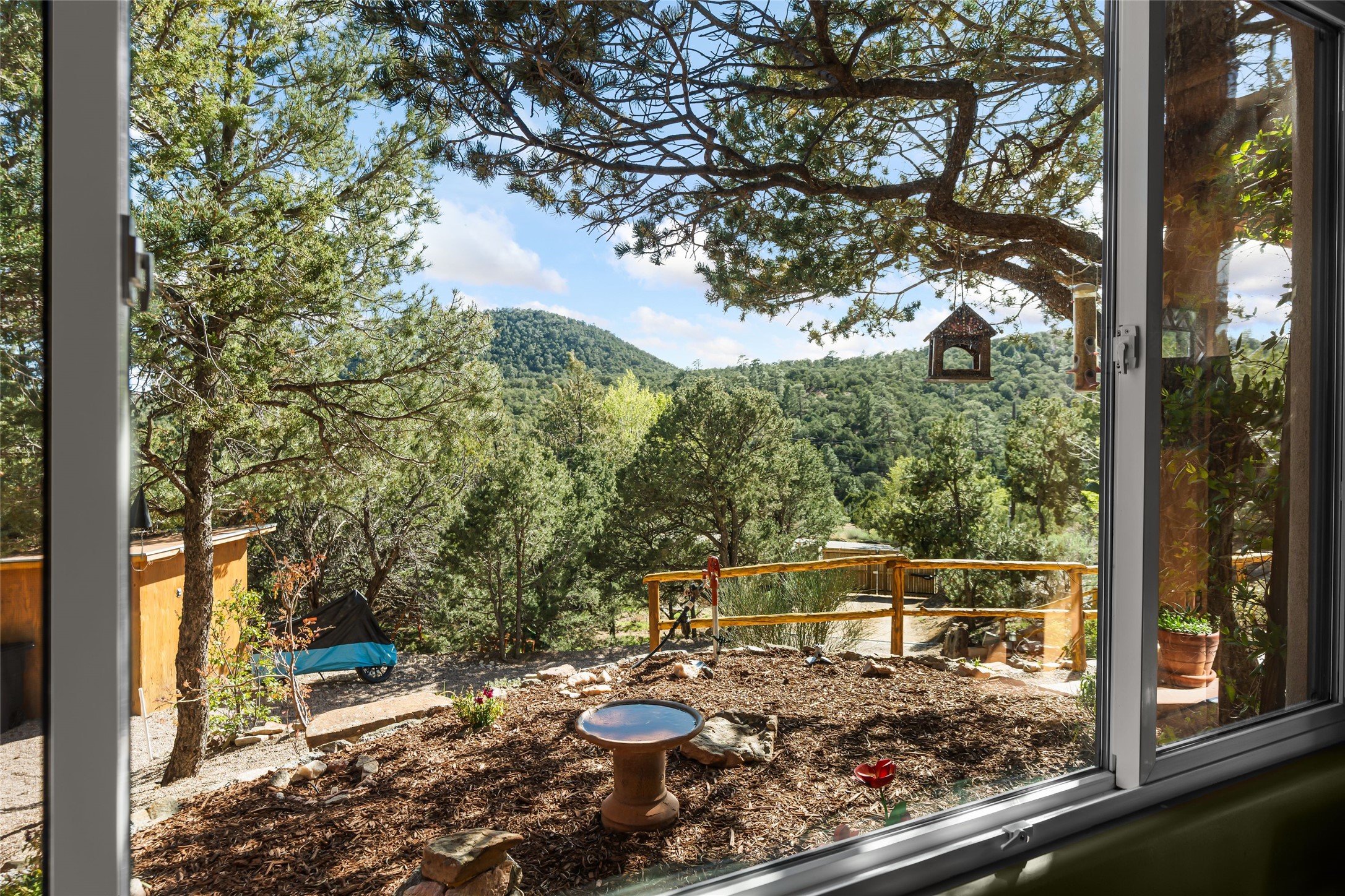 Fairy tale setting for this much loved home tucked into the woods AND offering exceptionally beautiful panoramic long views. Gorgeous wall of sophisticated rock work and beautifully maintained gardens welcome you. This home is a warm, traditional, updated and upbeat treasure. The home is two story with an expansive mountain view from the living room which offers traditional vigas and a wood burning fireplace and opens into the dining area and kitchen for an open concept with a walled courtyard easily accessible from dining/kitchen area. Lower level has one bedroom, full bath, living room,kitchen,dining room,walled courtyard. Upstairs has 2 bedrooms with 3/4 bath and second story has accessibility to a created exterior ground level sitting area with big views. Main bedroom offers a fireplace, expansive closet and walled exterior deck with inspiring mountain views. Drip system in place. Septic system in 2016. Nest system operating home functions including drip system. Over the recent years, the owners have updated appliances, replaced windows/doors, maintained roof, created level useable exterior areas, and completed new stucco in 2025. There is a storage shed for odds and ends. No garage. The property has street facing automatic gate for privacy. One acre with a private well. 5 miles from Zia Road. We welcome you to come visit!