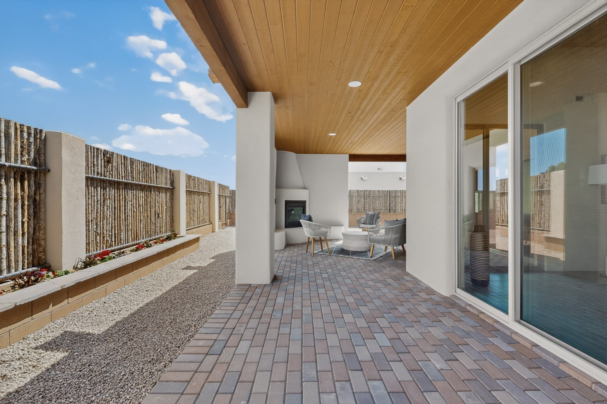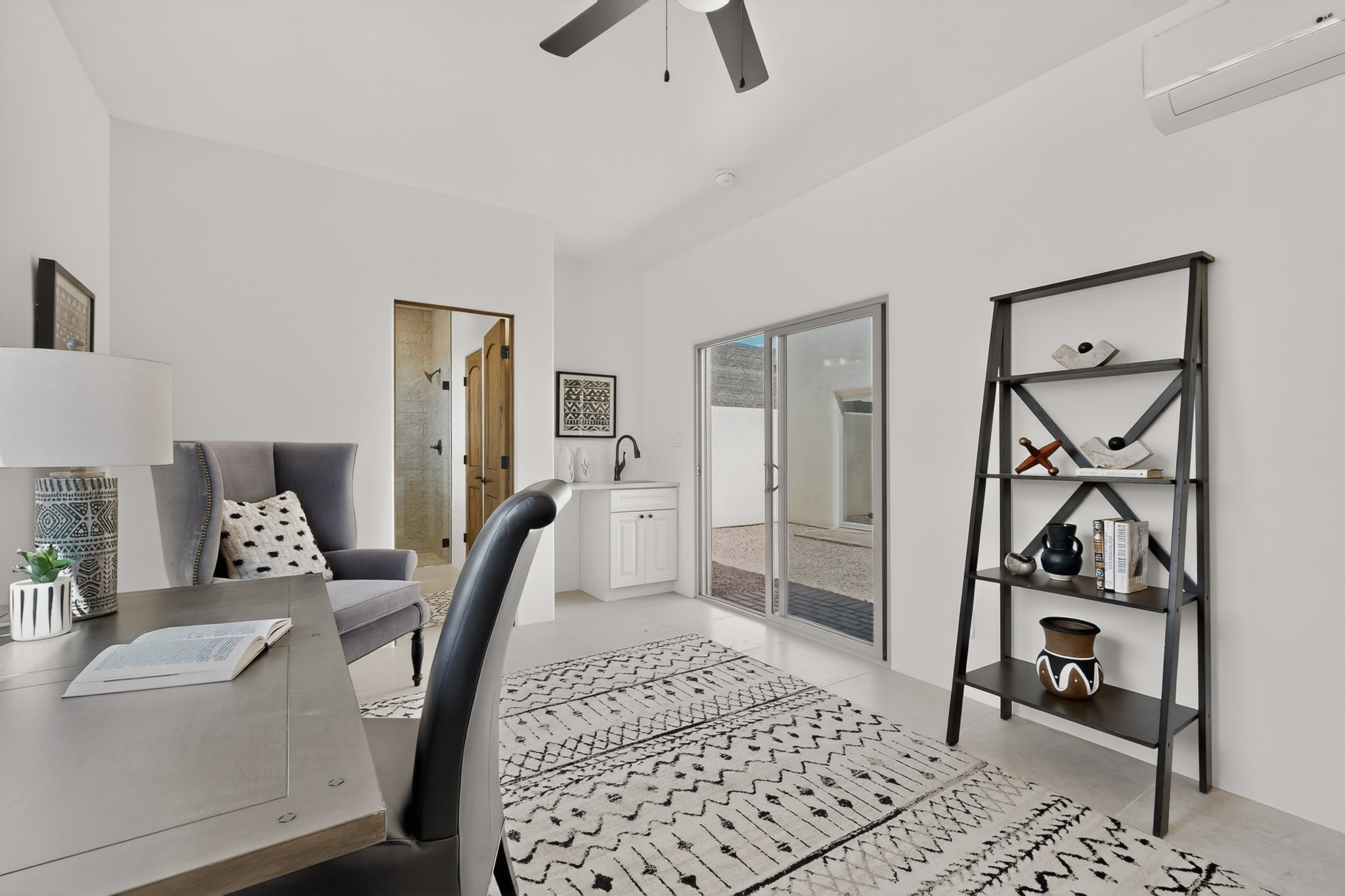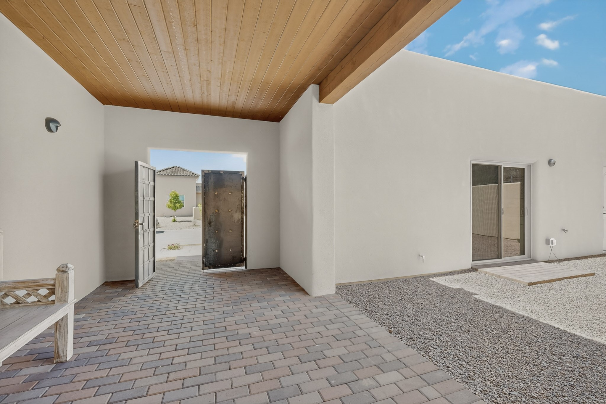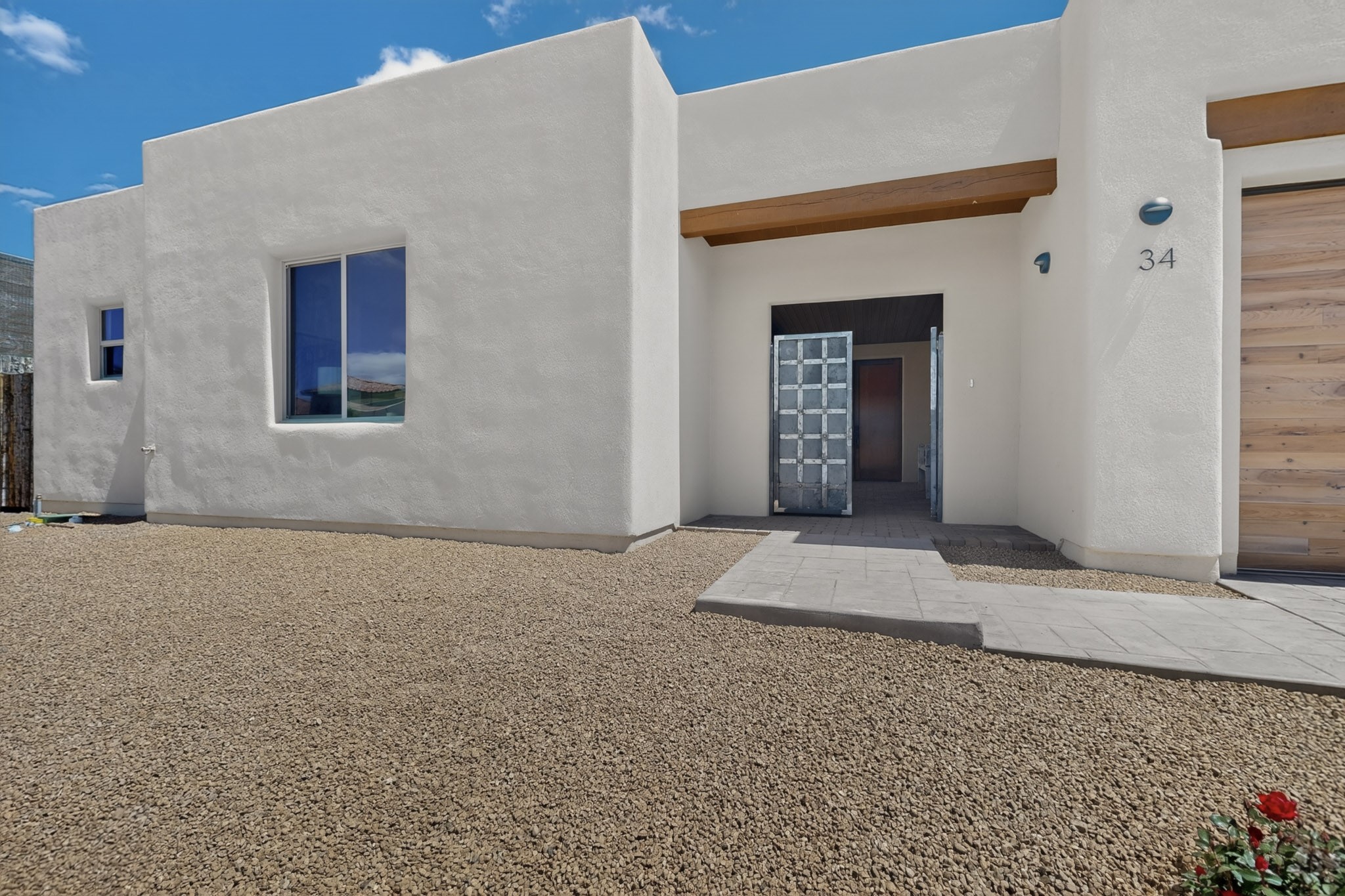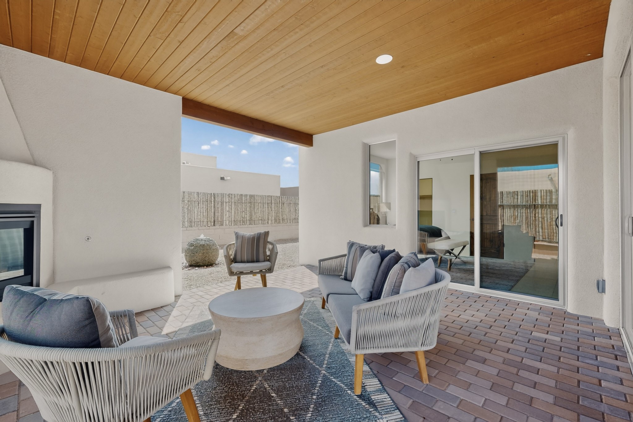 Sited on a quiet lot in Phase 4 of the La Pradera Subdivision this delightful Zaguanita Plan with its rich and sophisticated colors is entered through a lockable double wrought iron gate into a covered entry (a "Zaguan") with brick pavers and an open private courtyard. On your left is a separate living unit featuring a bedroom, three-quarter bath, independent HVAC, tankless water heater, tiled shower, white cabinets with grey quartz countertops, sink, and under-counter fridge. The main entry leads to the formal entry with a lighted nicho and boveda ceiling. To the left is the owner's suite with a barn door entry to the owner's suite bath with a large walk-in shower with euro-style shower fixtures and an overhead rain shower head. Two large closets are separated by a commode closet. Directly ahead of the entrance is the open living room with walnut stained beams and T&G planking offset with grey quartz countertops, a kiva fireplace and an open kitchen with an oversized counter. The kitchen and guest bedroom both open out to a covered portal that has a gas-fired kiva fireplace and brick pavers. To the right is the guest bedroom bath that can also serve as a powder room. The open kitchen has white cabinets. All floors are tiled with light gray porcelain planks. The exterior is a contemporary design with a TPO roof. The driveway is a colored stamped concrete design, and the insulated 3-car garage includes an epoxy-coated floor.
