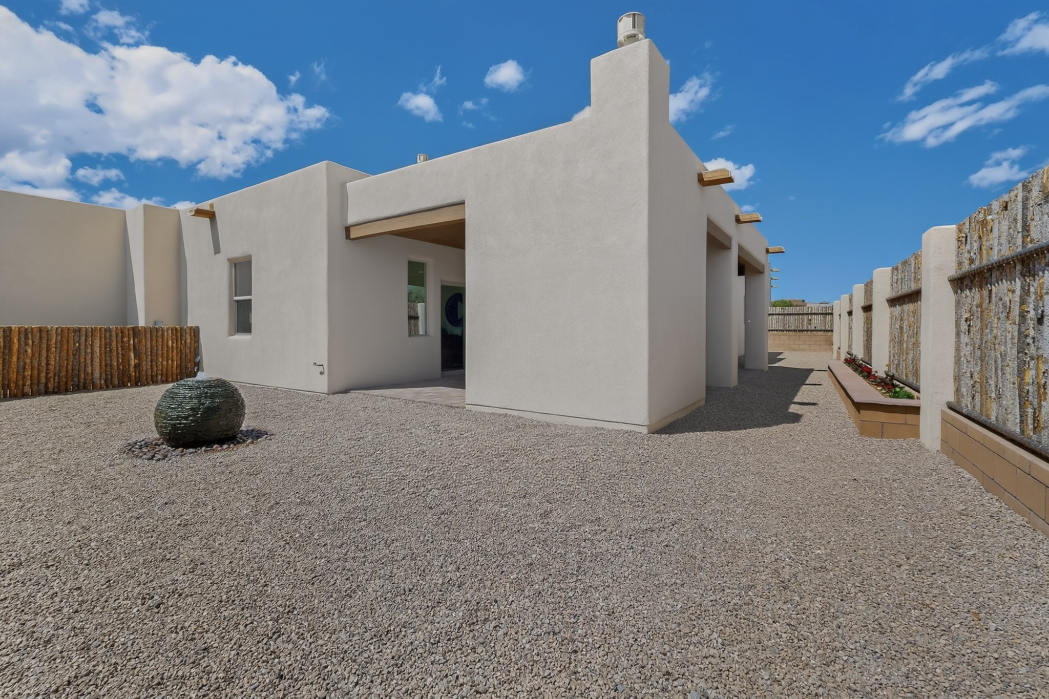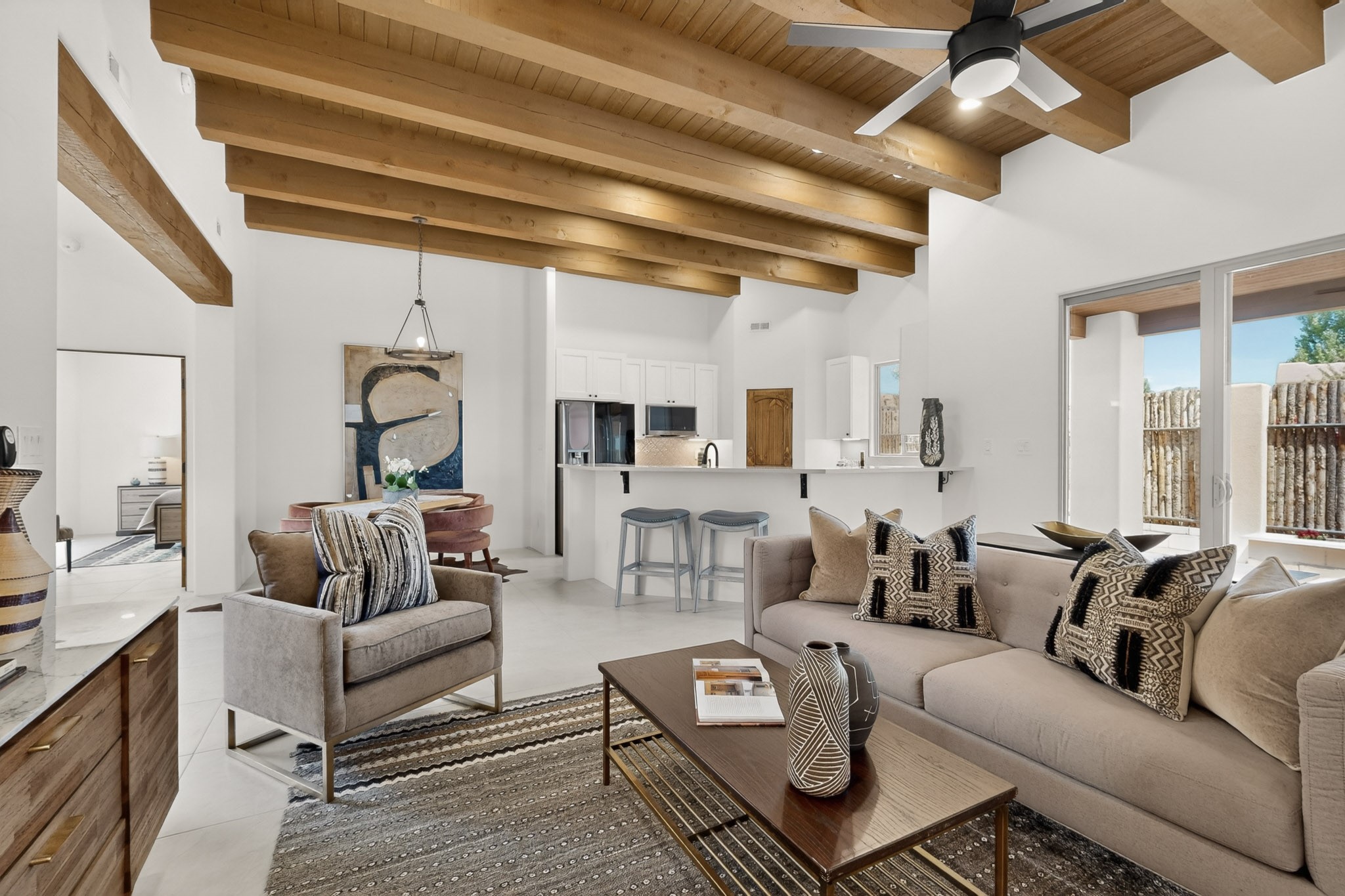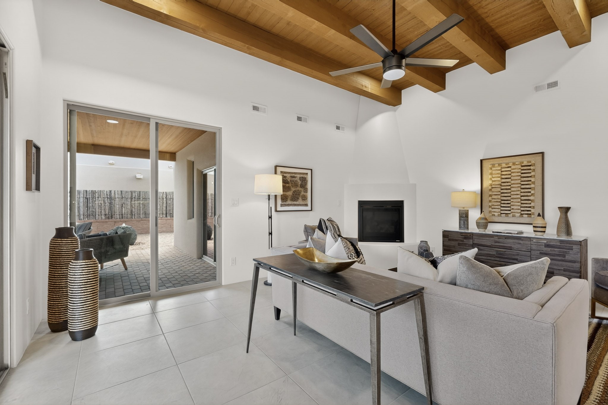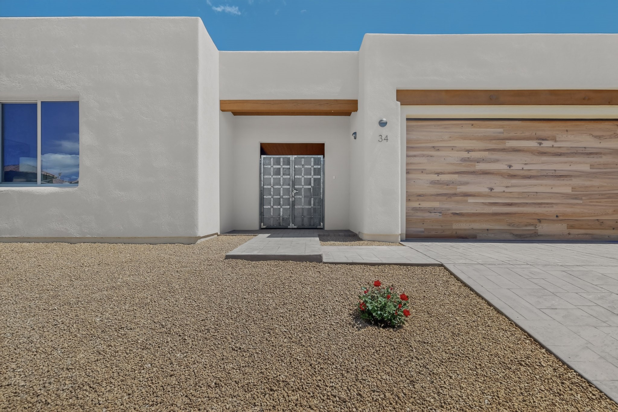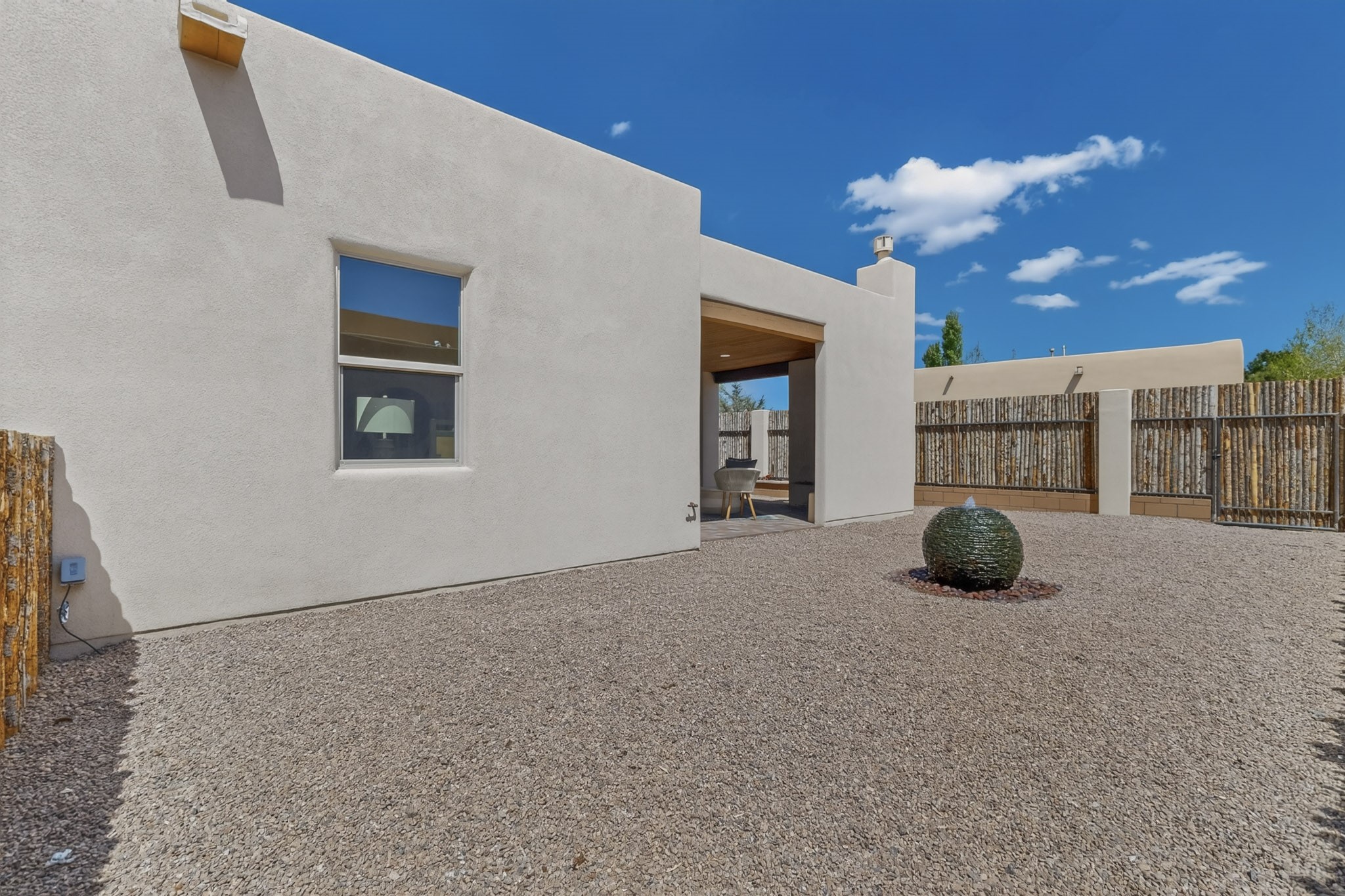 Sited on a quiet lot in Phase 4 of the La Pradera Subdivision this delightful Zaguanita Plan with its rich and sophisticated colors is entered through a lockable double wrought iron gate into a covered entry (a "Zaguan") with brick pavers and an open private courtyard. On your left is a separate living unit featuring a bedroom, three-quarter bath, independent HVAC, tankless water heater, tiled shower, white cabinets with grey quartz countertops, sink, and under-counter fridge. The main entry leads to the formal entry with a lighted nicho and boveda ceiling. To the left is the owner's suite with a barn door entry to the owner's suite bath with a large walk-in shower with euro-style shower fixtures and an overhead rain shower head. Two large closets are separated by a commode closet. Directly ahead of the entrance is the open living room with walnut stained beams and T&G planking offset with grey quartz countertops, a kiva fireplace and an open kitchen with an oversized counter. The kitchen and guest bedroom both open out to a covered portal that has a gas-fired kiva fireplace and brick pavers. To the right is the guest bedroom bath that can also serve as a powder room. The open kitchen has white cabinets. All floors are tiled with light gray porcelain planks. The exterior is a contemporary design with a TPO roof. The driveway is a colored stamped concrete design, and the insulated 3-car garage includes an epoxy-coated floor.