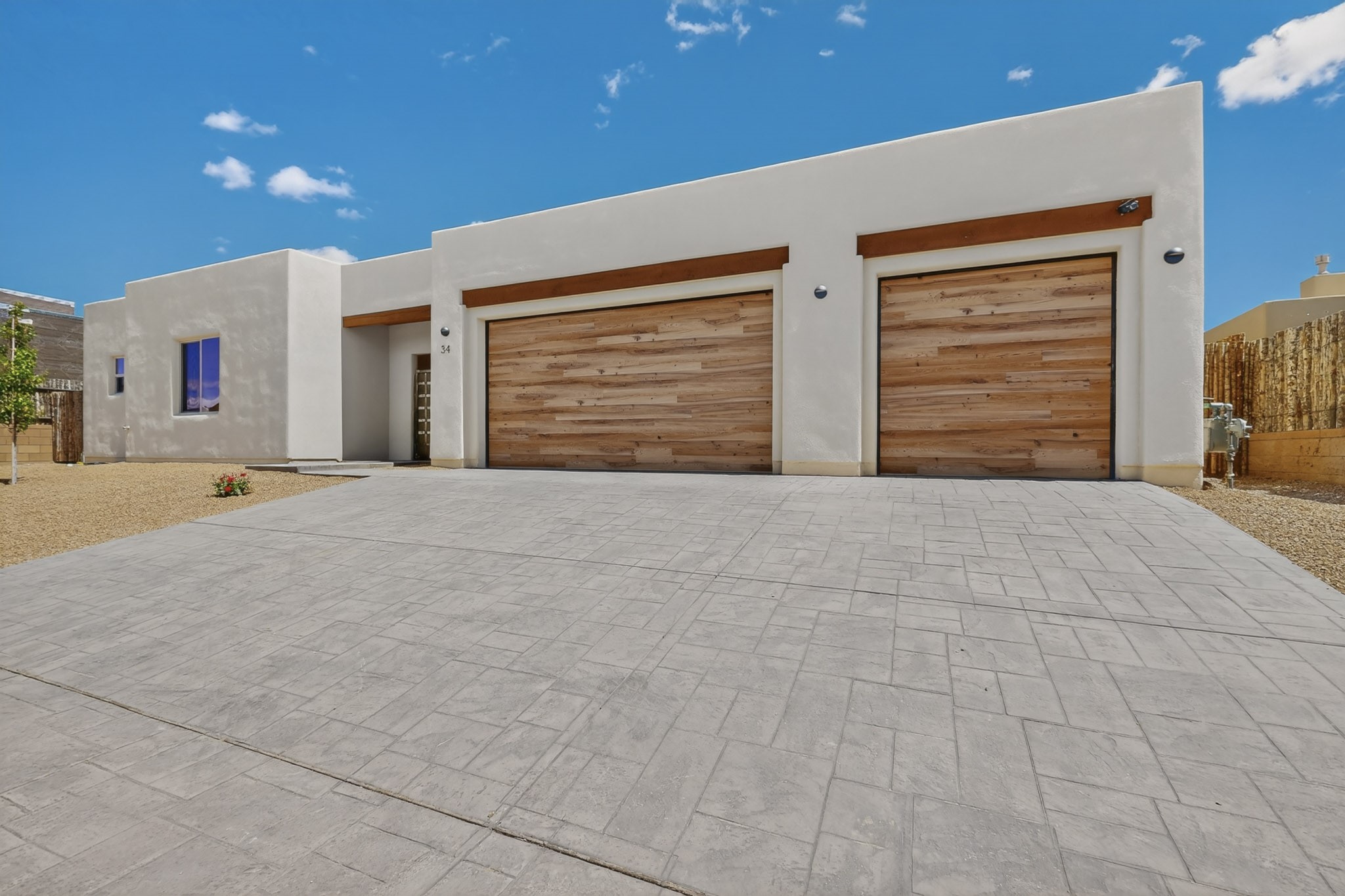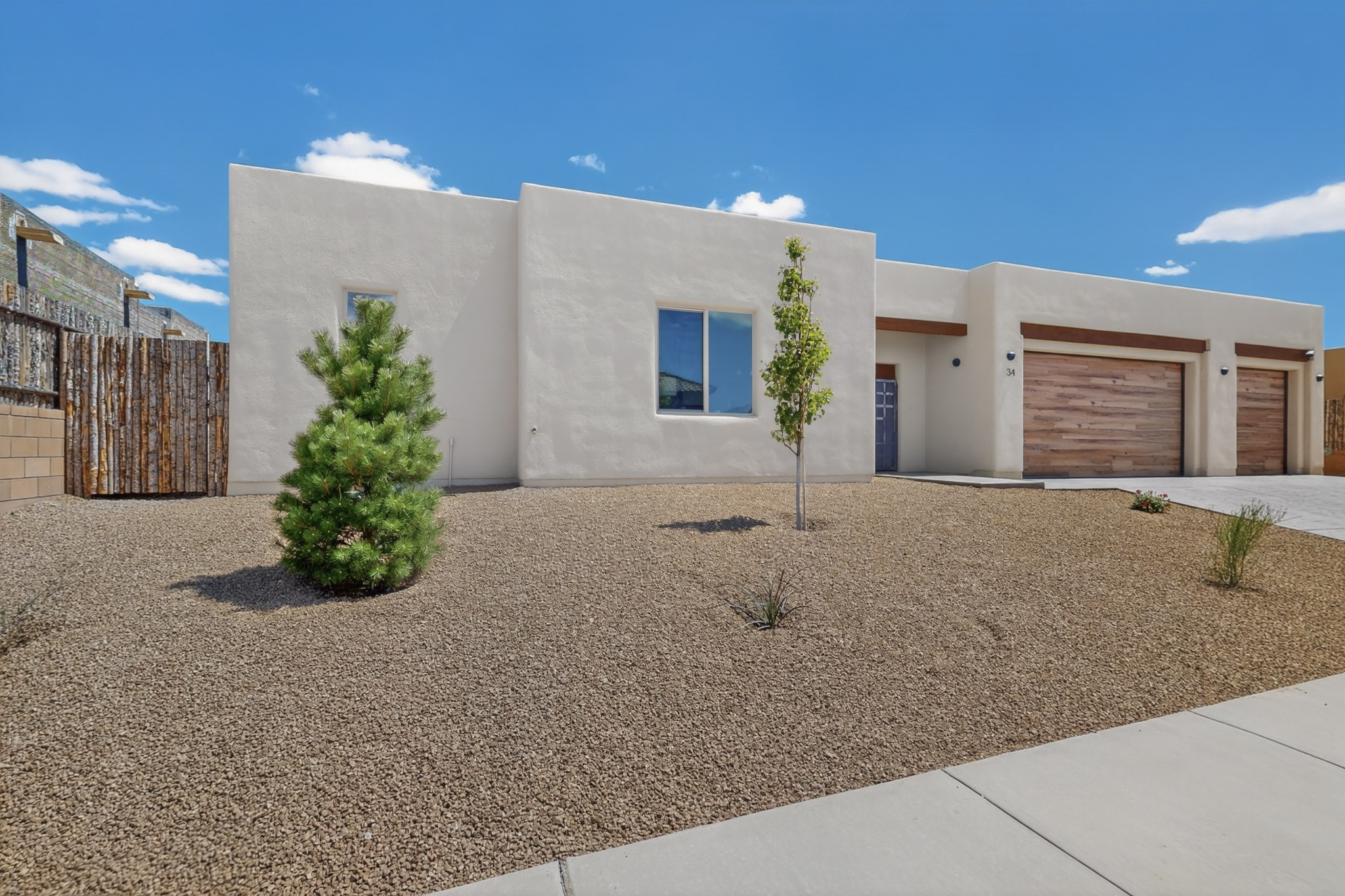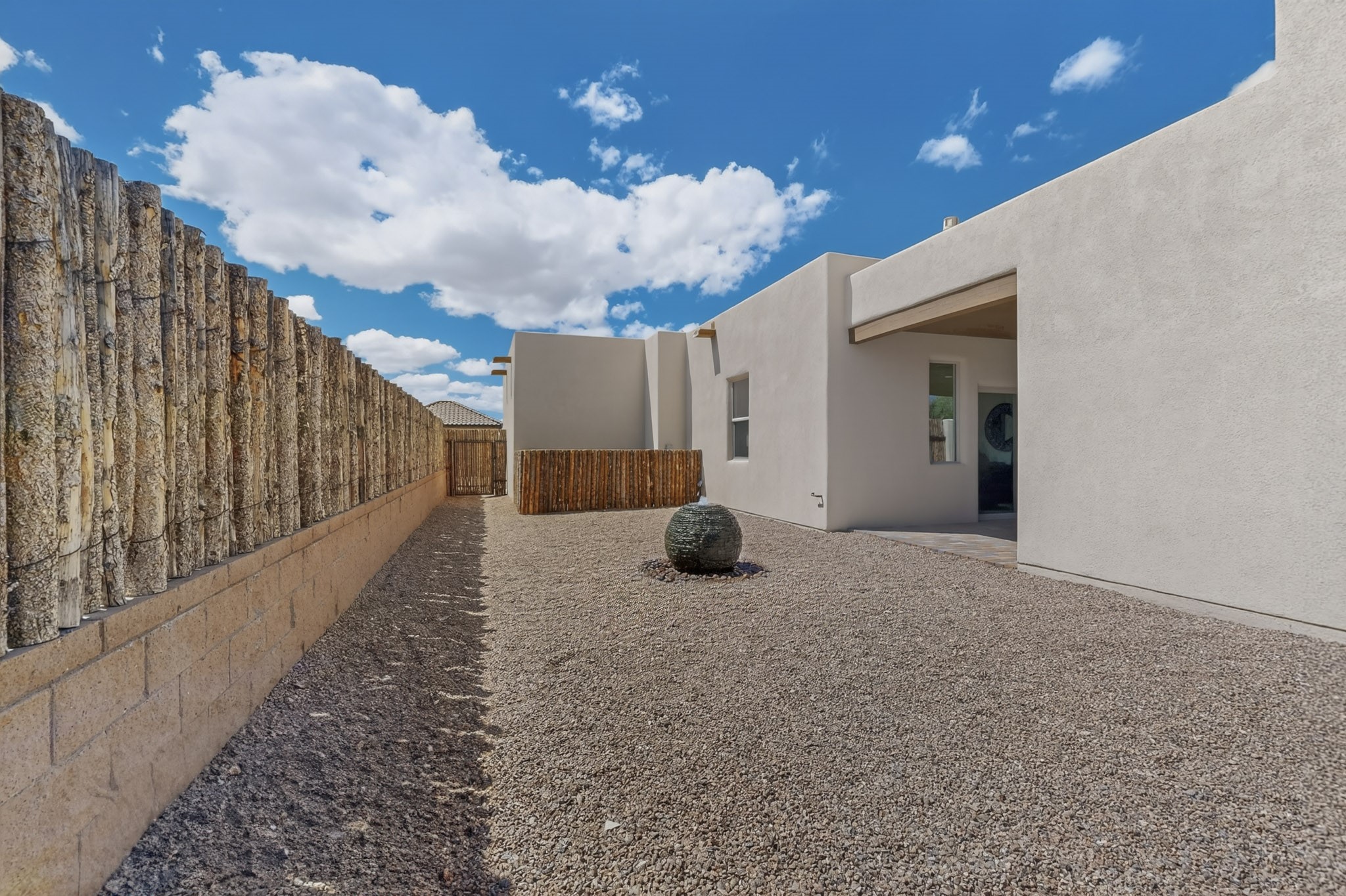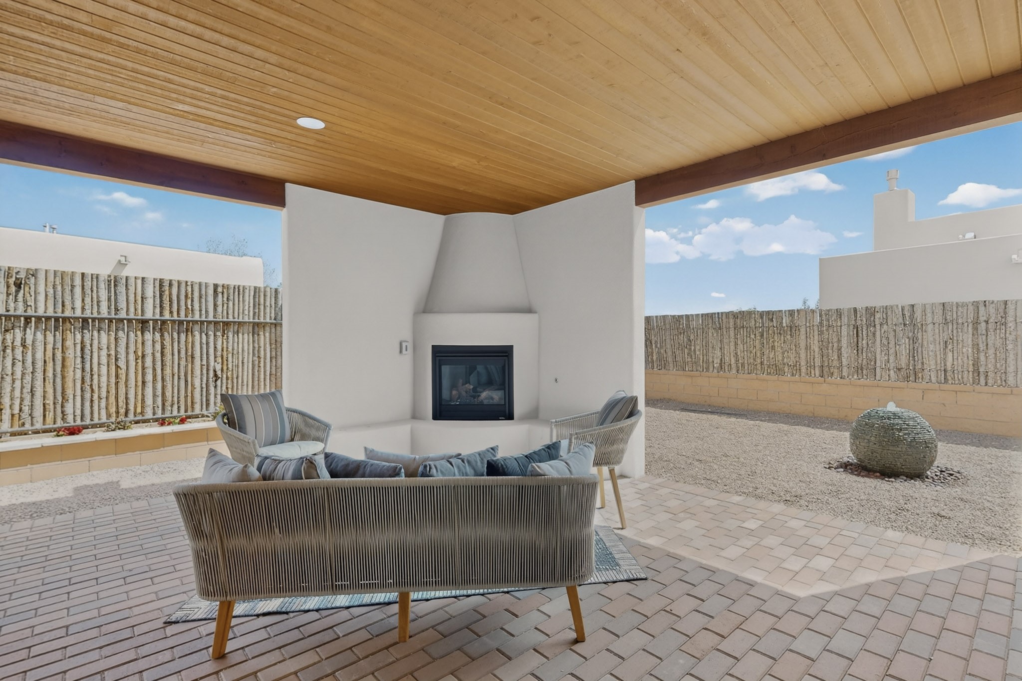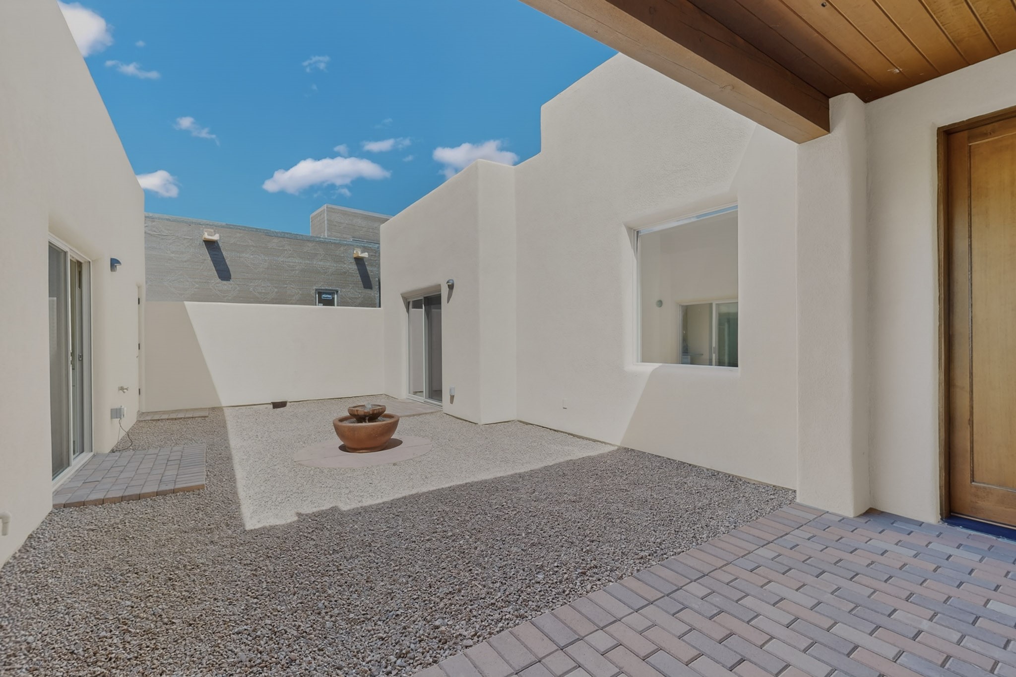 Sited on a quiet lot in Phase 4 of the La Pradera Subdivision this delightful Zaguanita Plan with its rich and sophisticated colors is entered through a lockable double wrought iron gate into a covered entry (a "Zaguan") with brick pavers and an open private courtyard. On your left is a separate living unit featuring a bedroom, three-quarter bath, independent HVAC, tankless water heater, tiled shower, white cabinets with grey quartz countertops, sink, and under-counter fridge. The main entry leads to the formal entry with a lighted nicho and boveda ceiling. To the left is the owner's suite with a barn door entry to the owner's suite bath with a large walk-in shower with euro-style shower fixtures and an overhead rain shower head. Two large closets are separated by a commode closet. Directly ahead of the entrance is the open living room with walnut stained beams and T&G planking offset with grey quartz countertops, a kiva fireplace and an open kitchen with an oversized counter. The kitchen and guest bedroom both open out to a covered portal that has a gas-fired kiva fireplace and brick pavers. To the right is the guest bedroom bath that can also serve as a powder room. The open kitchen has white cabinets. All floors are tiled with light gray porcelain planks. The exterior is a contemporary design with a TPO roof. The driveway is a colored stamped concrete design, and the insulated 3-car garage includes an epoxy-coated floor.