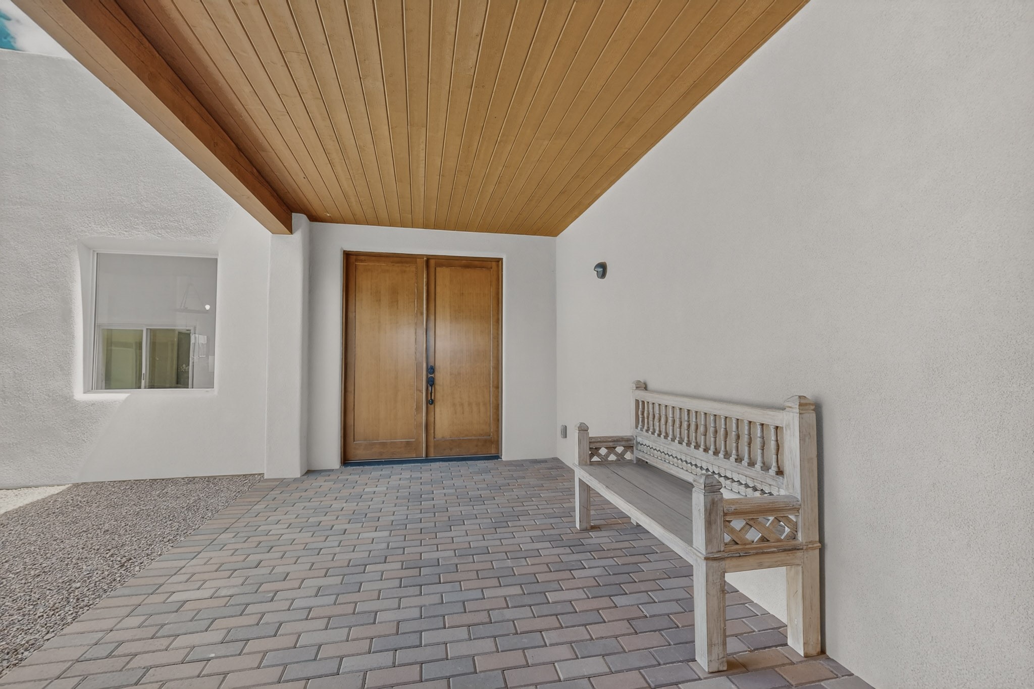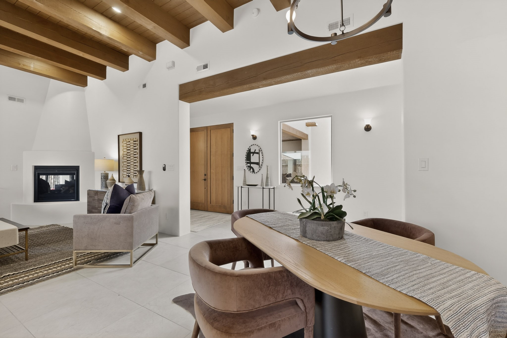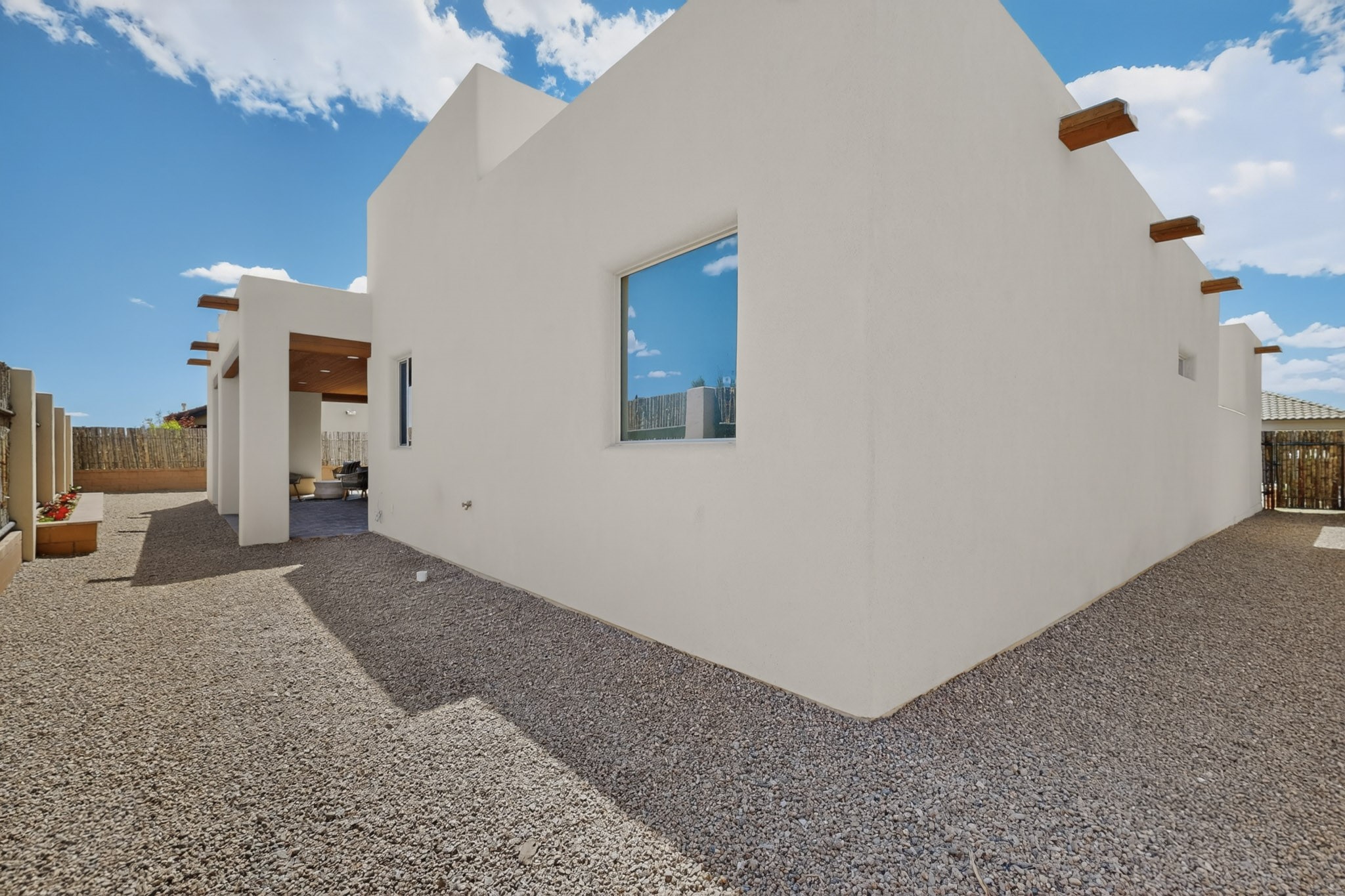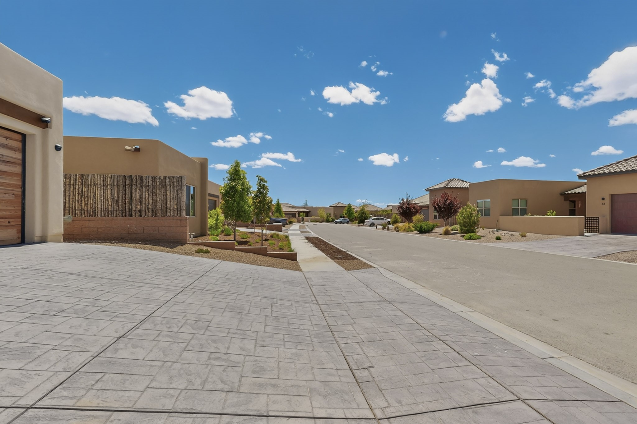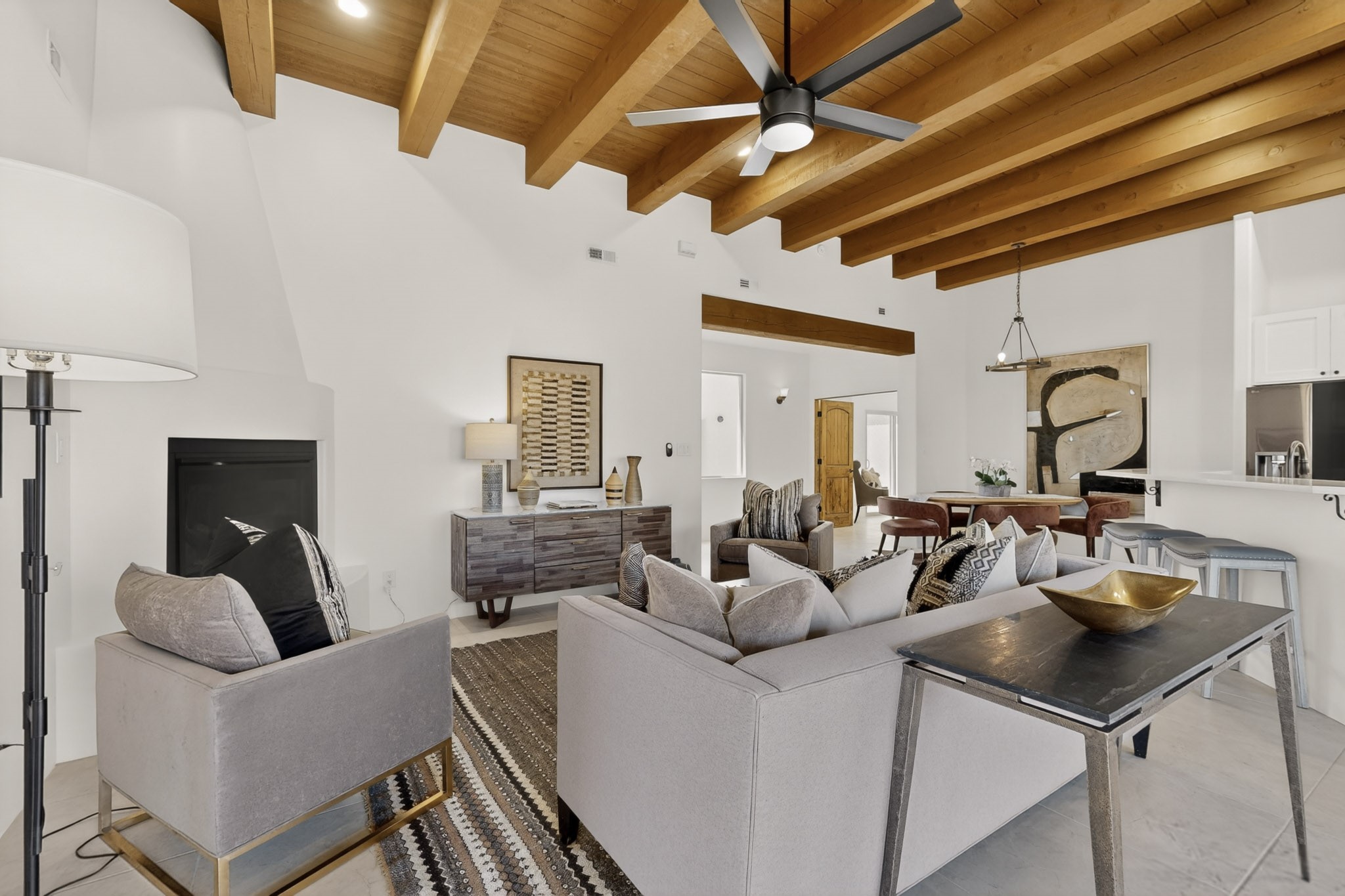 Sited on a quiet lot in Phase 4 of the La Pradera Subdivision this delightful Zaguanita Plan with its rich and sophisticated colors is entered through a lockable double wrought iron gate into a covered entry (a "Zaguan") with brick pavers and an open private courtyard. On your left is a separate living unit featuring a bedroom, three-quarter bath, independent HVAC, tankless water heater, tiled shower, white cabinets with grey quartz countertops, sink, and under-counter fridge. The main entry leads to the formal entry with a lighted nicho and boveda ceiling. To the left is the owner's suite with a barn door entry to the owner's suite bath with a large walk-in shower with euro-style shower fixtures and an overhead rain shower head. Two large closets are separated by a commode closet. Directly ahead of the entrance is the open living room with walnut stained beams and T&G planking offset with grey quartz countertops, a kiva fireplace and an open kitchen with an oversized counter. The kitchen and guest bedroom both open out to a covered portal that has a gas-fired kiva fireplace and brick pavers. To the right is the guest bedroom bath that can also serve as a powder room. The open kitchen has white cabinets. All floors are tiled with light gray porcelain planks. The exterior is a contemporary design with a TPO roof. The driveway is a colored stamped concrete design, and the insulated 3-car garage includes an epoxy-coated floor.