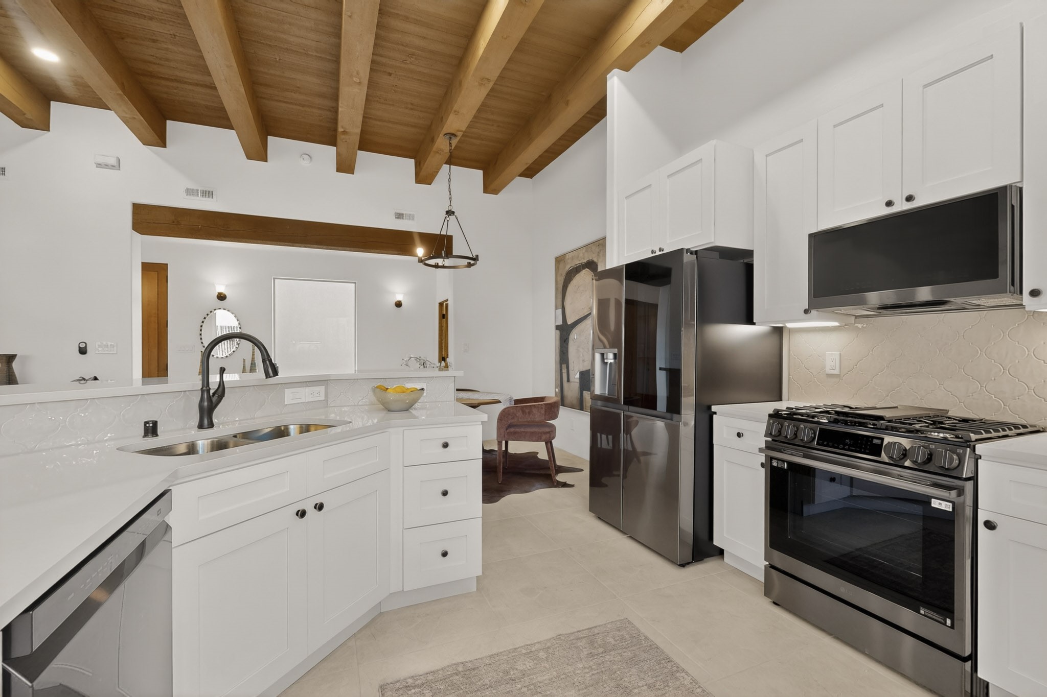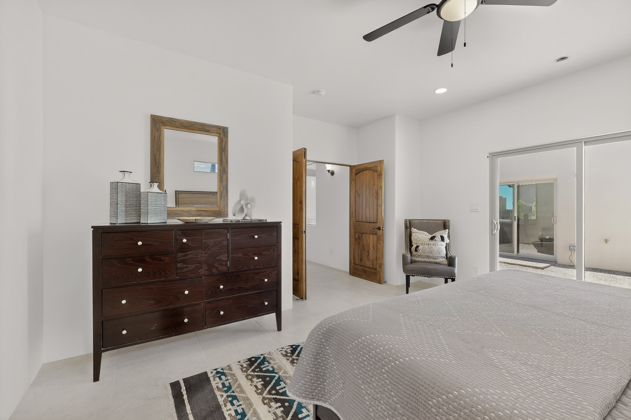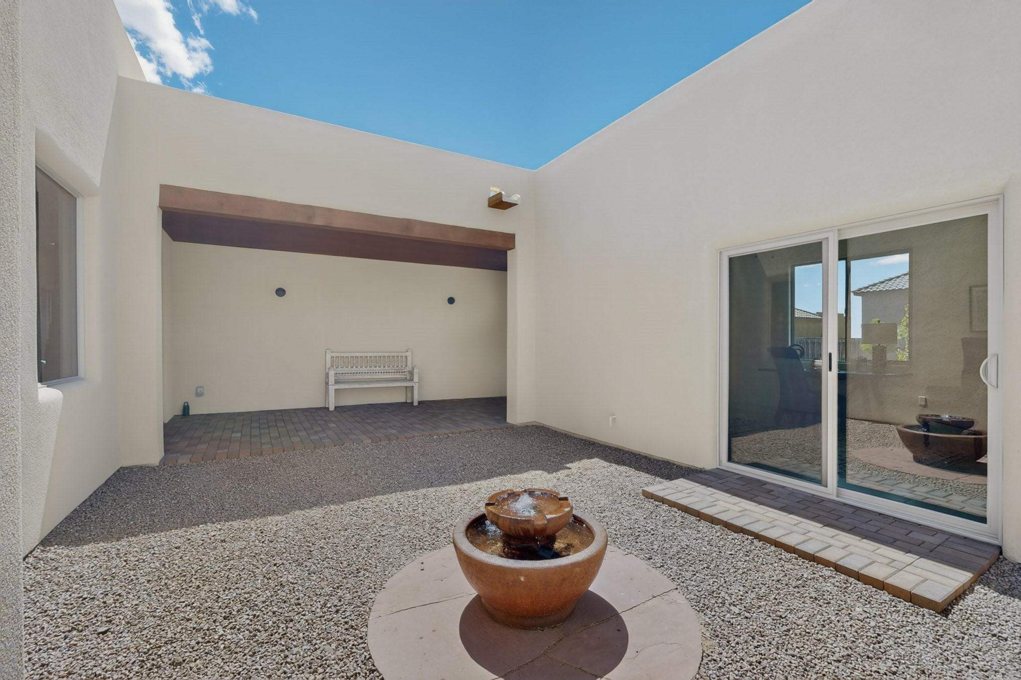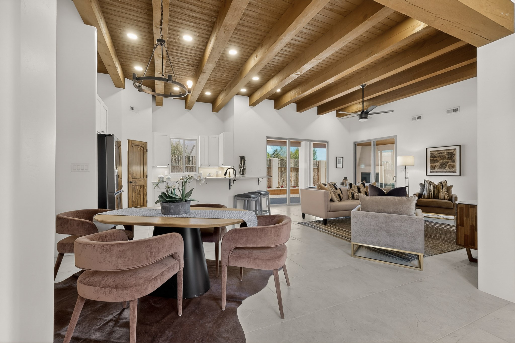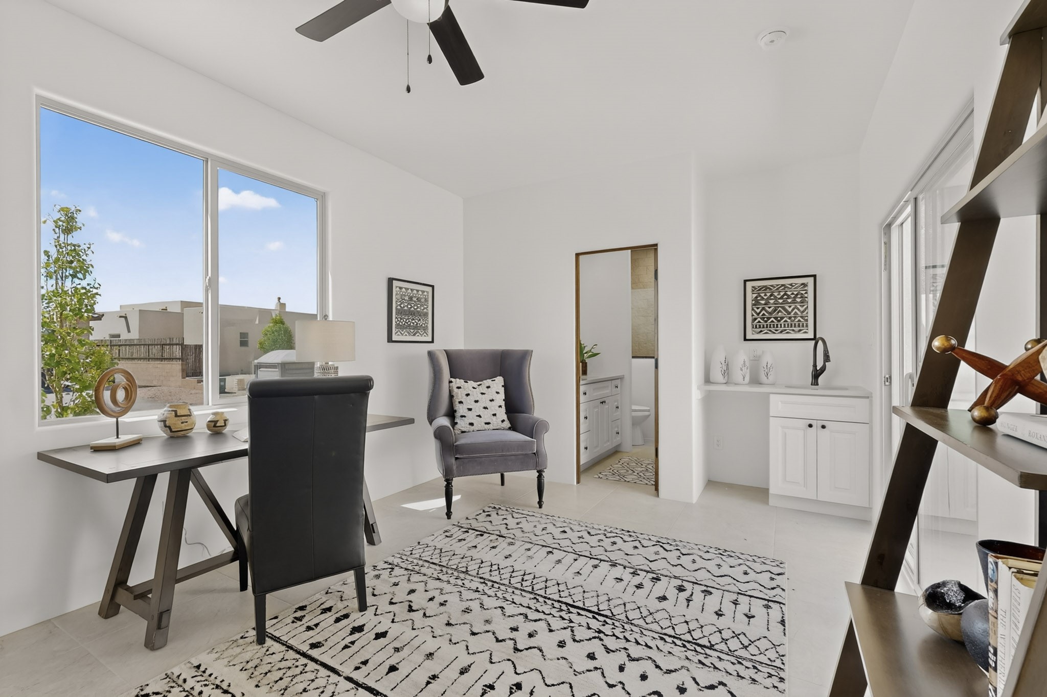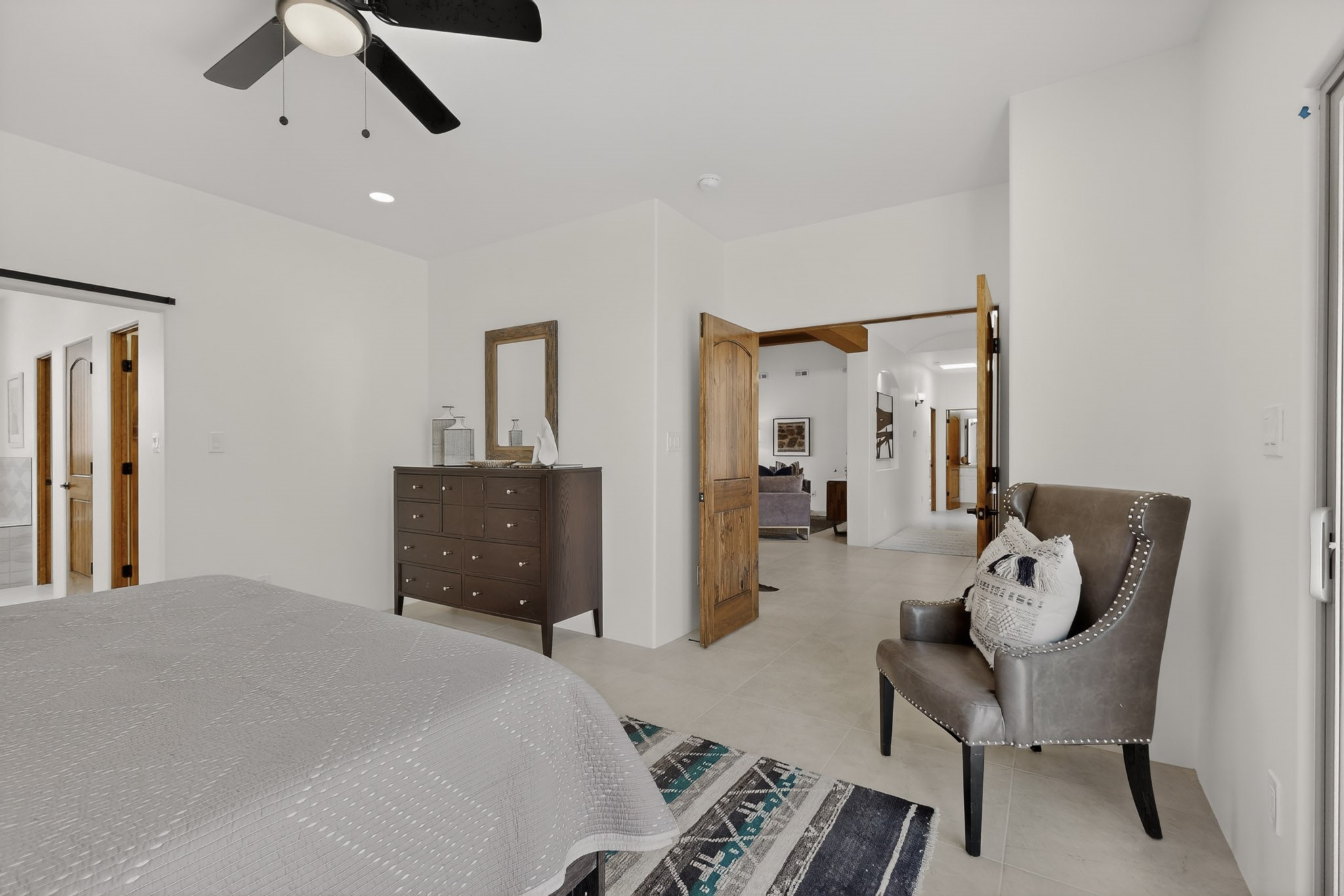Sited on a quiet lot in Phase 4 of the La Pradera Subdivision this delightful Zaguanita Plan with its rich and sophisticated colors is entered through a lockable double wrought iron gate into a covered entry (a "Zaguan") with brick pavers and an open private courtyard. On your left is a separate living unit featuring a bedroom, three-quarter bath, independent HVAC, tankless water heater, tiled shower, white cabinets with grey quartz countertops, sink, and under-counter fridge. The main entry leads to the formal entry with a lighted nicho and boveda ceiling. To the left is the owner's suite with a barn door entry to the owner's suite bath with a large walk-in shower with euro-style shower fixtures and an overhead rain shower head. Two large closets are separated by a commode closet. Directly ahead of the entrance is the open living room with walnut stained beams and T&G planking offset with grey quartz countertops, a kiva fireplace and an open kitchen with an oversized counter. The kitchen and guest bedroom both open out to a covered portal that has a gas-fired kiva fireplace and brick pavers. To the right is the guest bedroom bath that can also serve as a powder room. The open kitchen has white cabinets. All floors are tiled with light gray porcelain planks. The exterior is a contemporary design with a TPO roof. The driveway is a colored stamped concrete design, and the insulated 3-car garage includes an epoxy-coated floor.