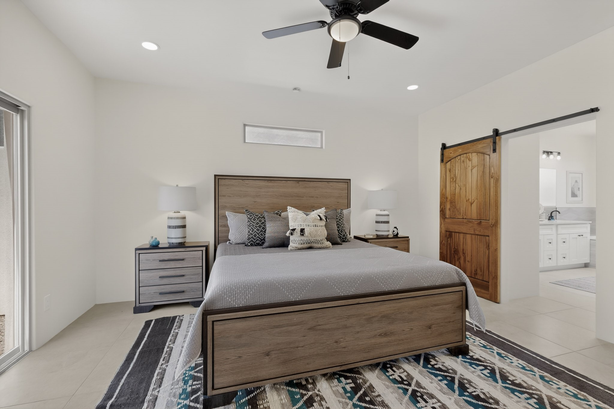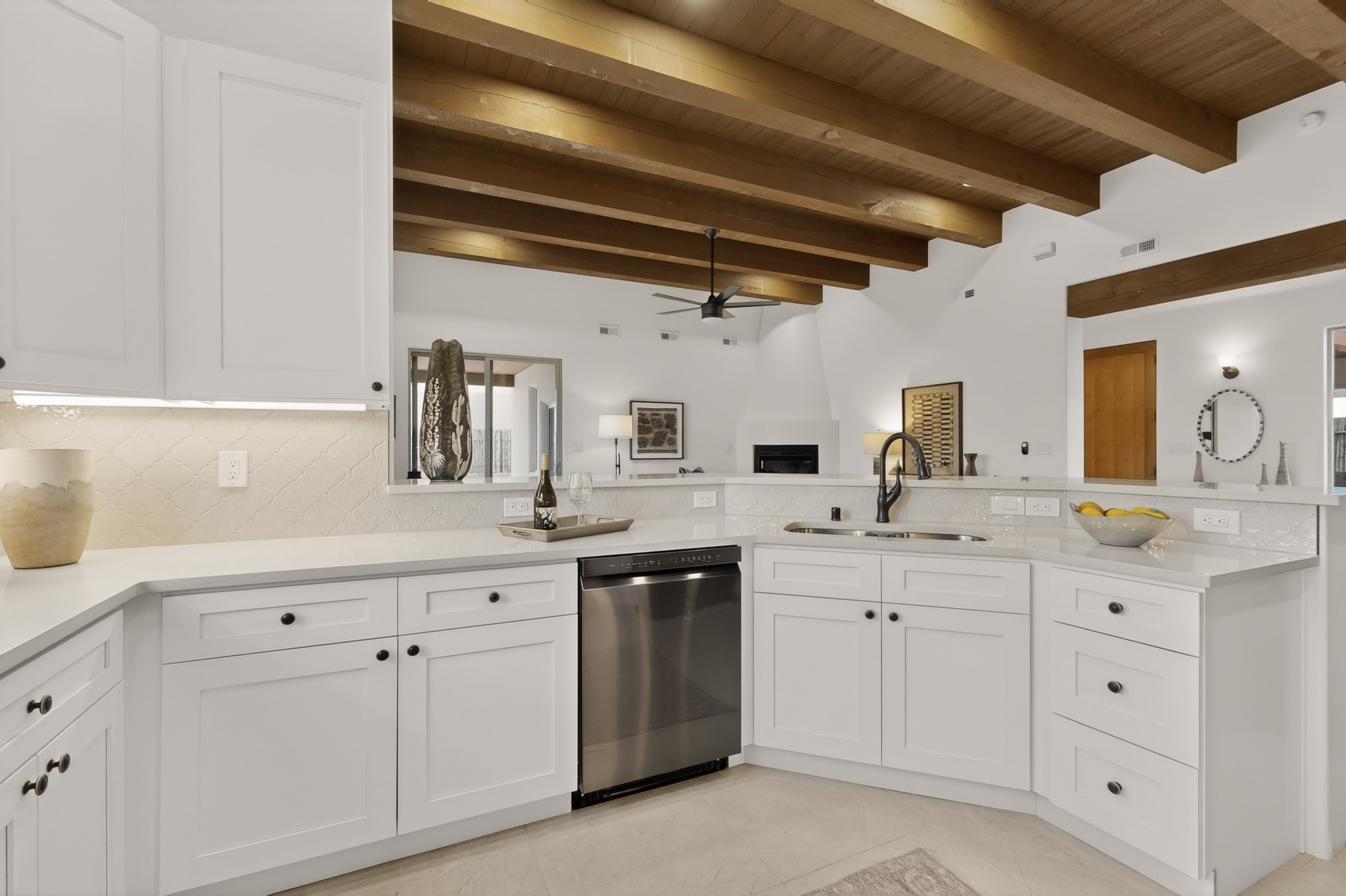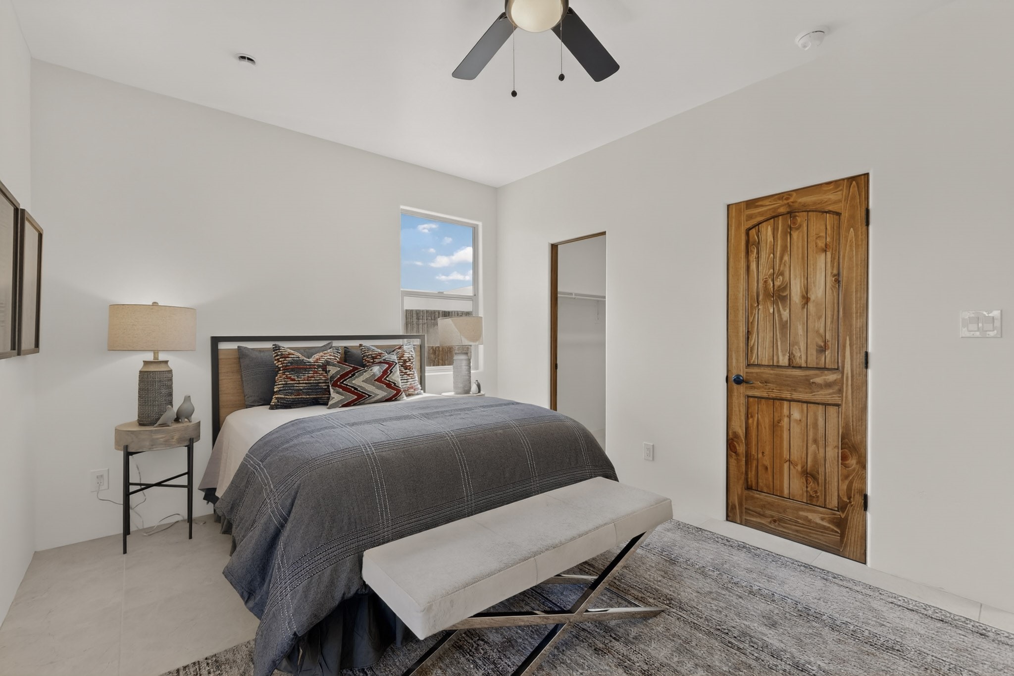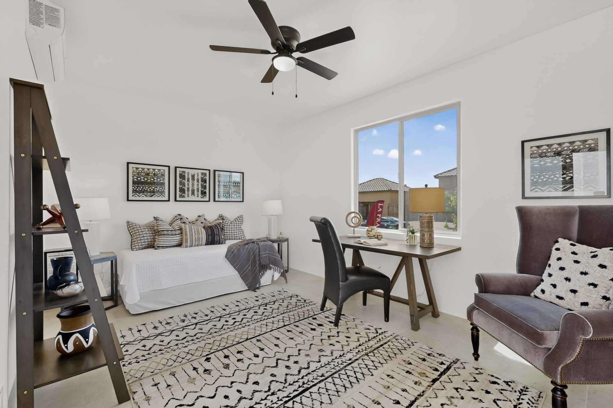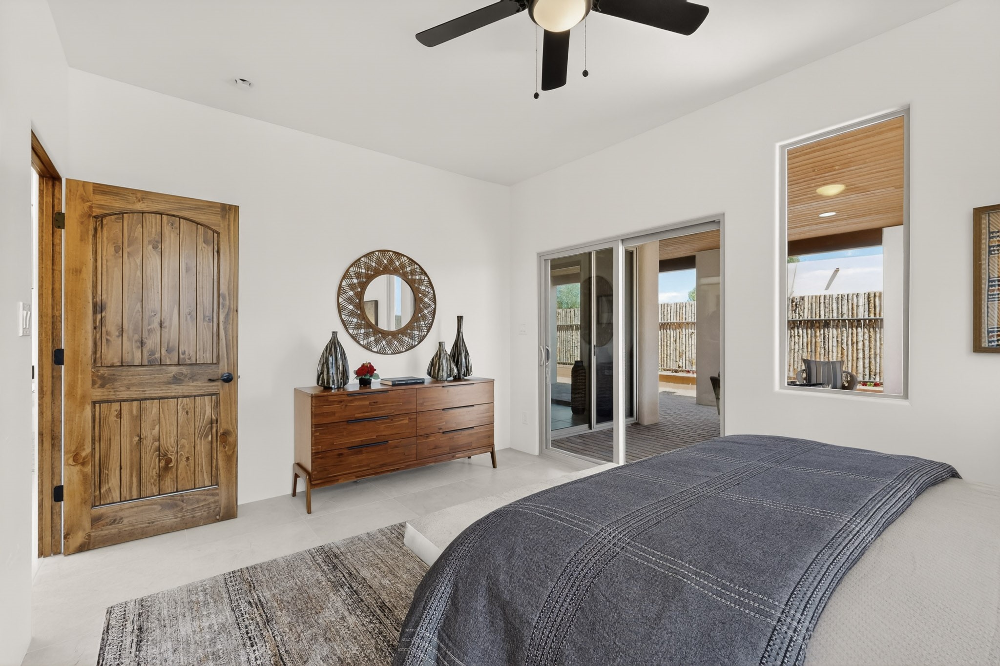 Sited on a quiet lot in Phase 4 of the La Pradera Subdivision this delightful Zaguanita Plan with its rich and sophisticated colors is entered through a lockable double wrought iron gate into a covered entry (a "Zaguan") with brick pavers and an open private courtyard. On your left is a separate living unit featuring a bedroom, three-quarter bath, independent HVAC, tankless water heater, tiled shower, white cabinets with grey quartz countertops, sink, and under-counter fridge. The main entry leads to the formal entry with a lighted nicho and boveda ceiling. To the left is the owner's suite with a barn door entry to the owner's suite bath with a large walk-in shower with euro-style shower fixtures and an overhead rain shower head. Two large closets are separated by a commode closet. Directly ahead of the entrance is the open living room with walnut stained beams and T&G planking offset with grey quartz countertops, a kiva fireplace and an open kitchen with an oversized counter. The kitchen and guest bedroom both open out to a covered portal that has a gas-fired kiva fireplace and brick pavers. To the right is the guest bedroom bath that can also serve as a powder room. The open kitchen has white cabinets. All floors are tiled with light gray porcelain planks. The exterior is a contemporary design with a TPO roof. The driveway is a colored stamped concrete design, and the insulated 3-car garage includes an epoxy-coated floor.