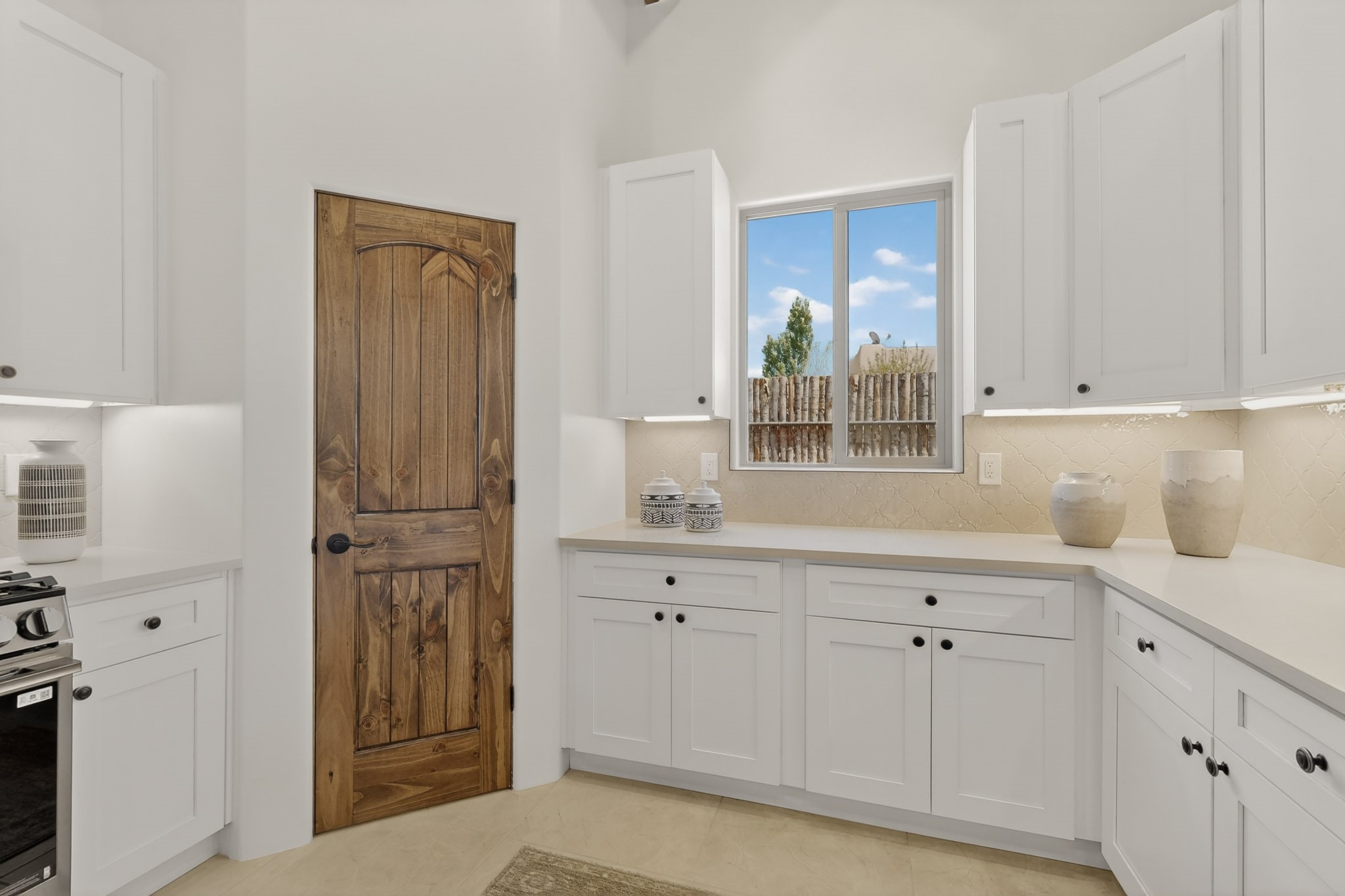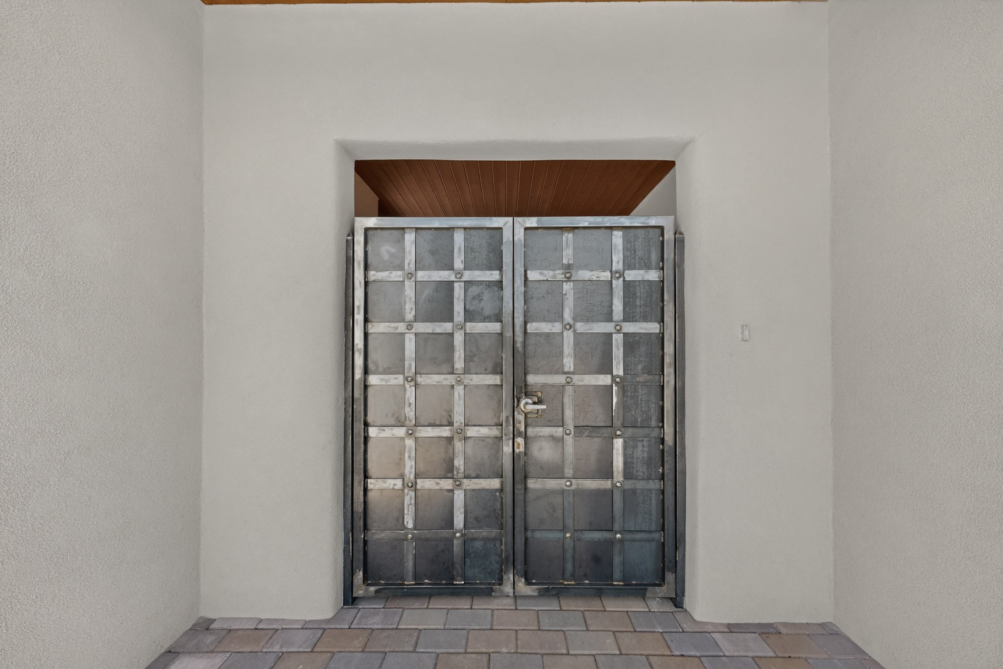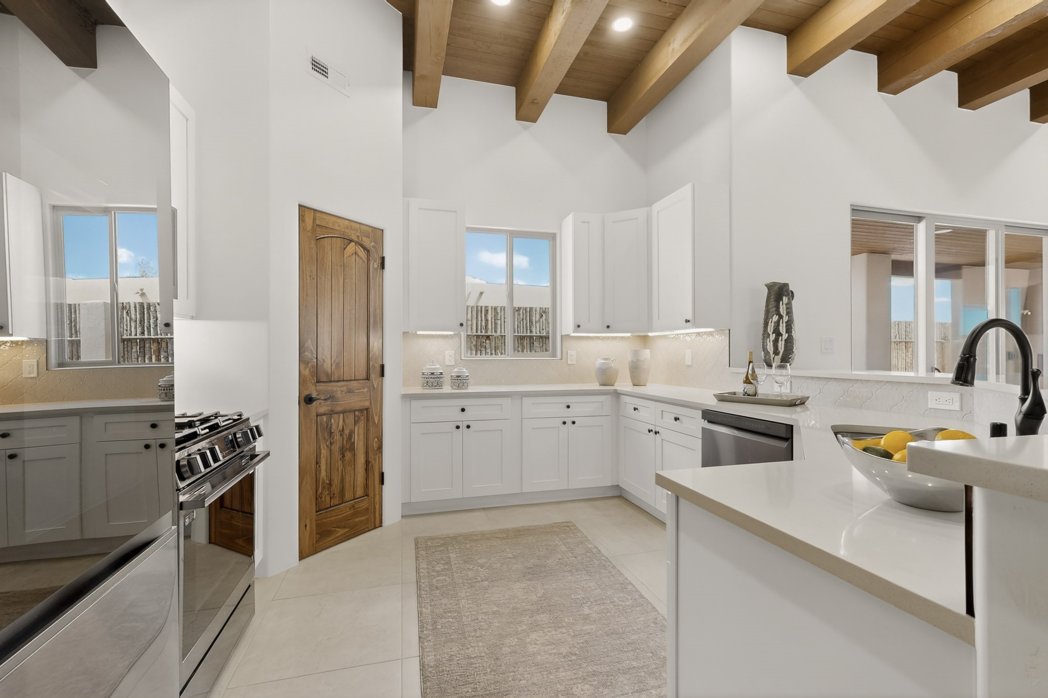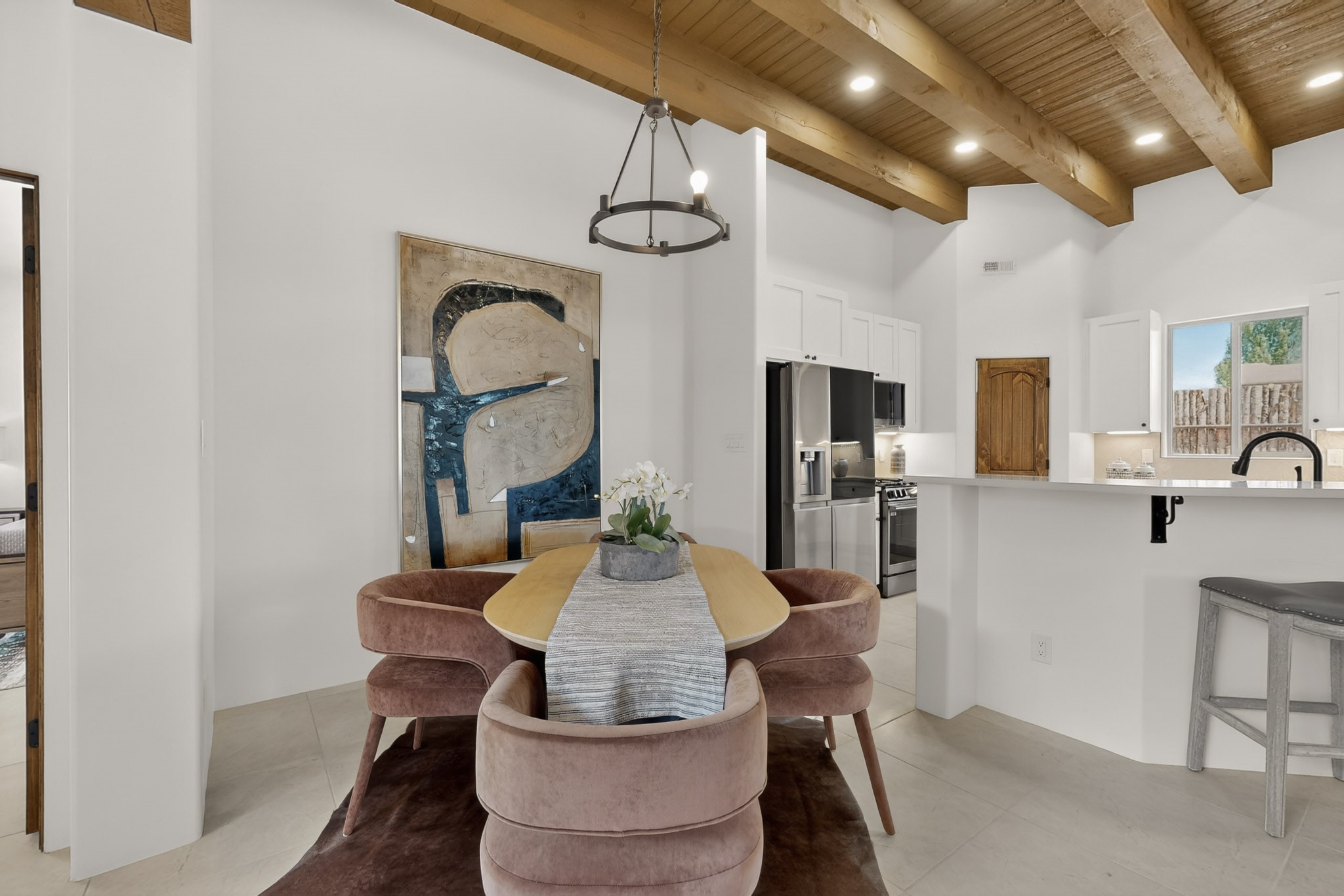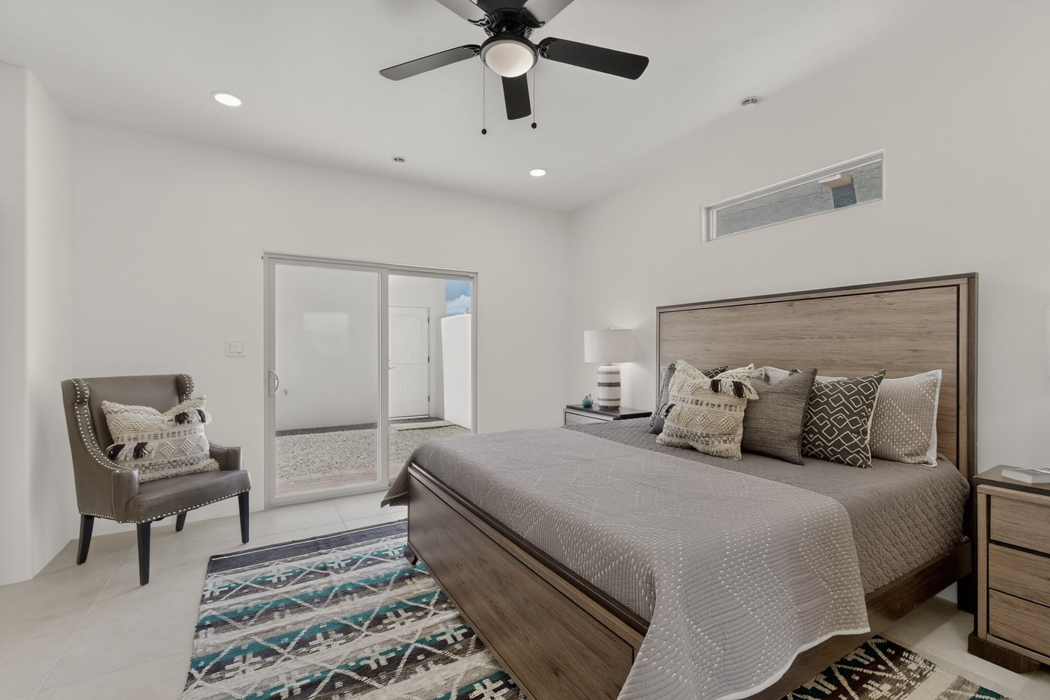 Sited on a quiet lot in Phase 4 of the La Pradera Subdivision this delightful Zaguanita Plan with its rich and sophisticated colors is entered through a lockable double wrought iron gate into a covered entry (a "Zaguan") with brick pavers and an open private courtyard. On your left is a separate living unit featuring a bedroom, three-quarter bath, independent HVAC, tankless water heater, tiled shower, white cabinets with grey quartz countertops, sink, and under-counter fridge. The main entry leads to the formal entry with a lighted nicho and boveda ceiling. To the left is the owner's suite with a barn door entry to the owner's suite bath with a large walk-in shower with euro-style shower fixtures and an overhead rain shower head. Two large closets are separated by a commode closet. Directly ahead of the entrance is the open living room with walnut stained beams and T&G planking offset with grey quartz countertops, a kiva fireplace and an open kitchen with an oversized counter. The kitchen and guest bedroom both open out to a covered portal that has a gas-fired kiva fireplace and brick pavers. To the right is the guest bedroom bath that can also serve as a powder room. The open kitchen has white cabinets. All floors are tiled with light gray porcelain planks. The exterior is a contemporary design with a TPO roof. The driveway is a colored stamped concrete design, and the insulated 3-car garage includes an epoxy-coated floor.