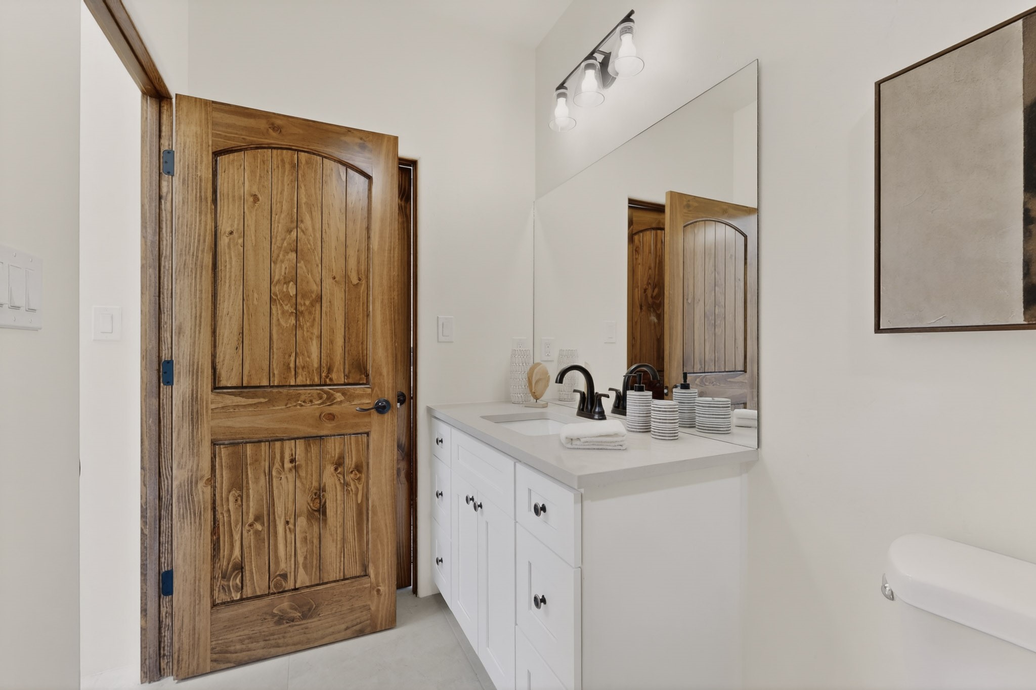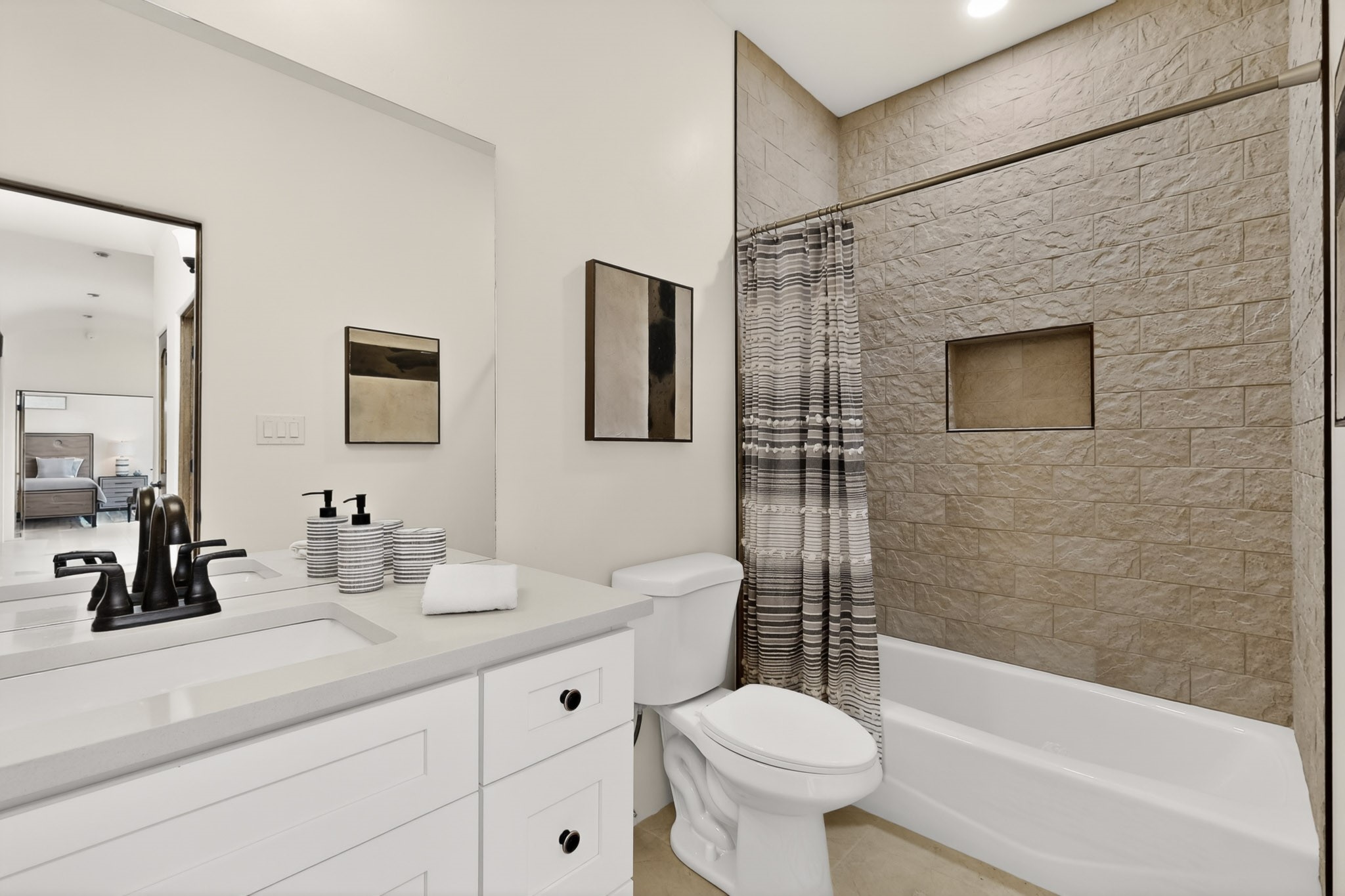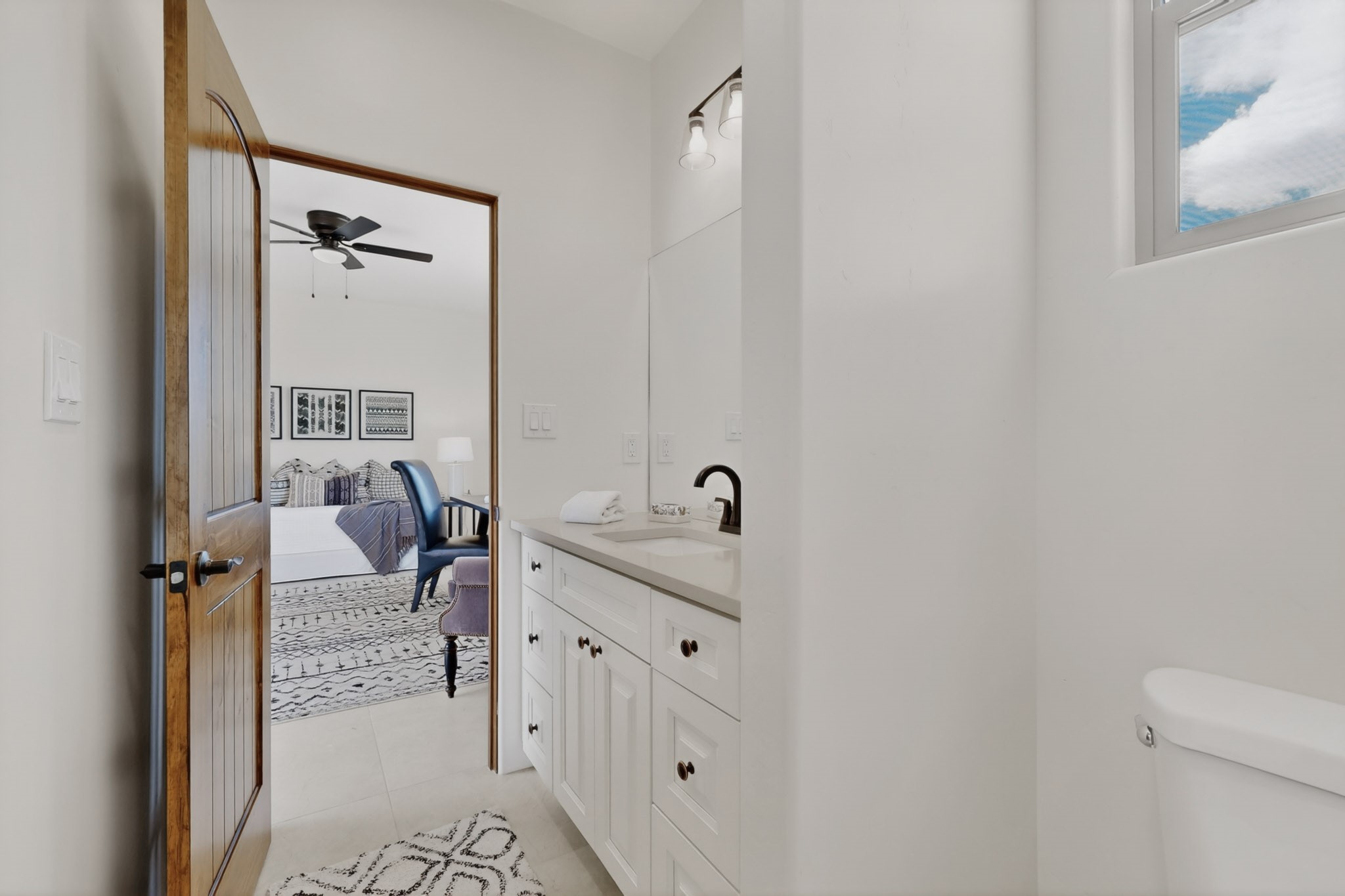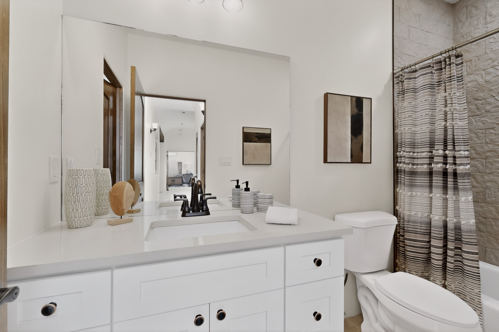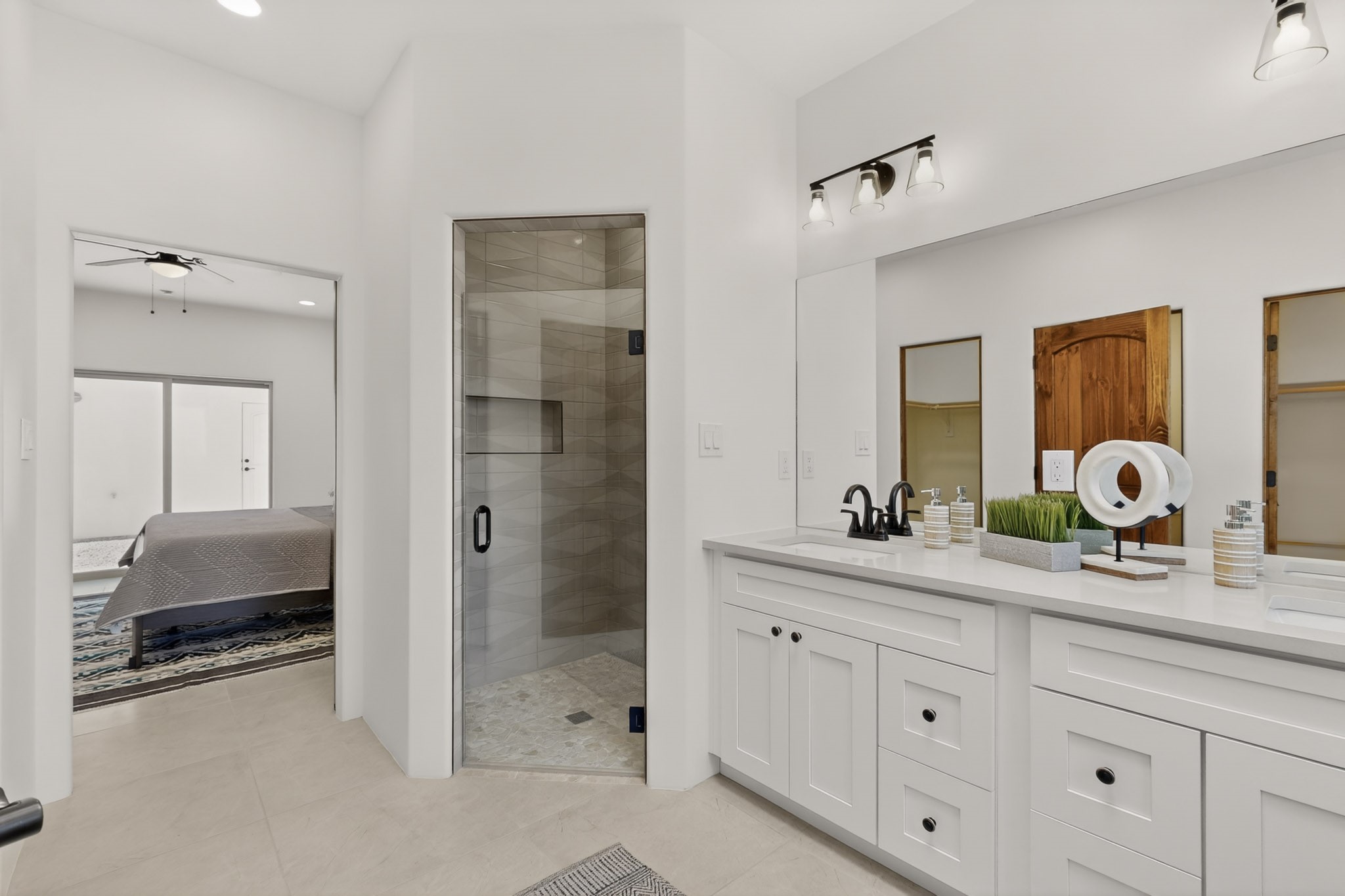Sited on a quiet lot in Phase 4 of the La Pradera Subdivision this delightful Zaguanita Plan with its rich and sophisticated colors is entered through a lockable double wrought iron gate into a covered entry (a "Zaguan") with brick pavers and an open private courtyard. On your left is a separate living unit featuring a bedroom, three-quarter bath, independent HVAC, tankless water heater, tiled shower, white cabinets with grey quartz countertops, sink, and under-counter fridge. The main entry leads to the formal entry with a lighted nicho and boveda ceiling. To the left is the owner's suite with a barn door entry to the owner's suite bath with a large walk-in shower with euro-style shower fixtures and an overhead rain shower head. Two large closets are separated by a commode closet. Directly ahead of the entrance is the open living room with walnut stained beams and T&G planking offset with grey quartz countertops, a kiva fireplace and an open kitchen with an oversized counter. The kitchen and guest bedroom both open out to a covered portal that has a gas-fired kiva fireplace and brick pavers. To the right is the guest bedroom bath that can also serve as a powder room. The open kitchen has white cabinets. All floors are tiled with light gray porcelain planks. The exterior is a contemporary design with a TPO roof. The driveway is a colored stamped concrete design, and the insulated 3-car garage includes an epoxy-coated floor.