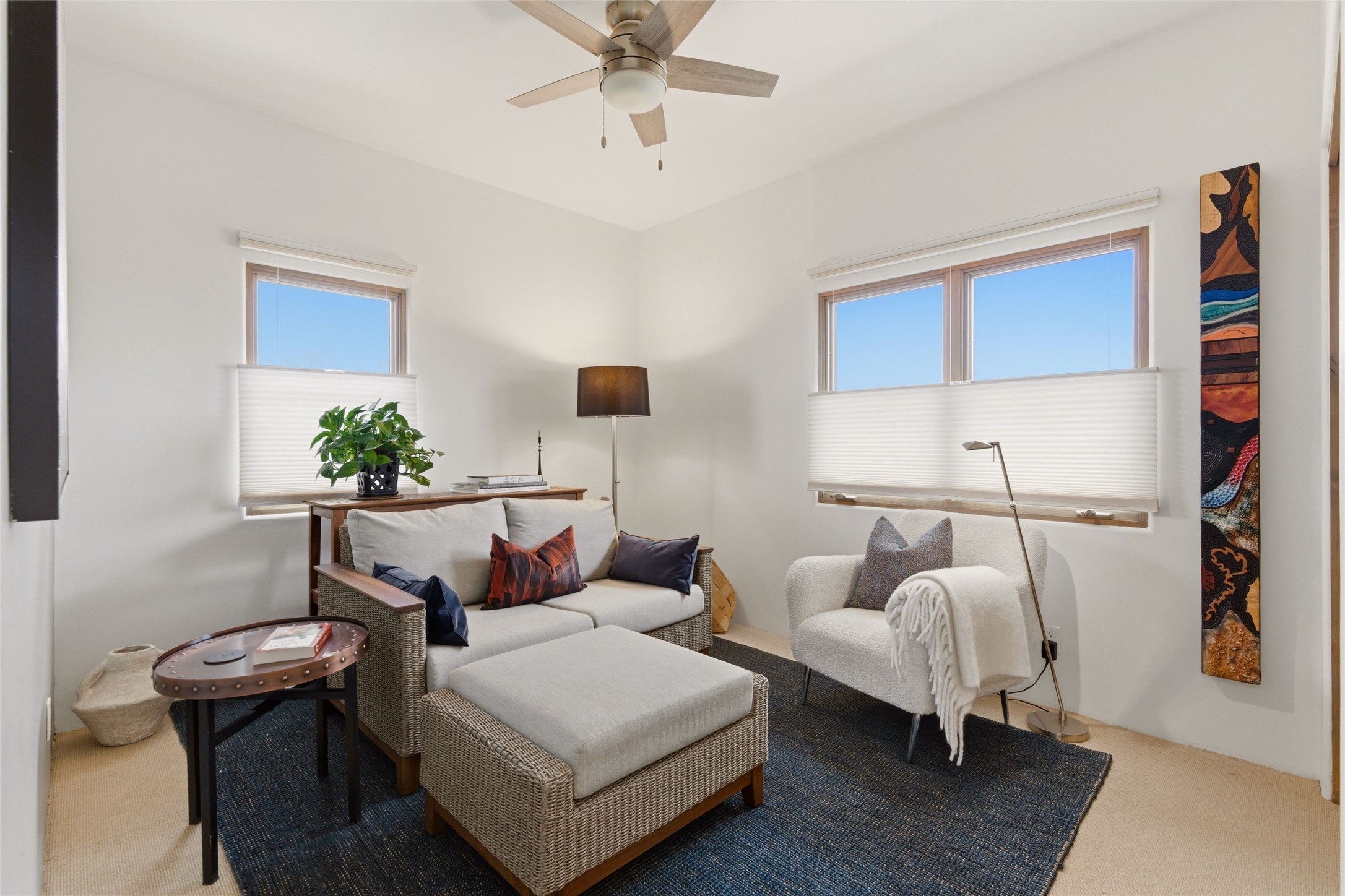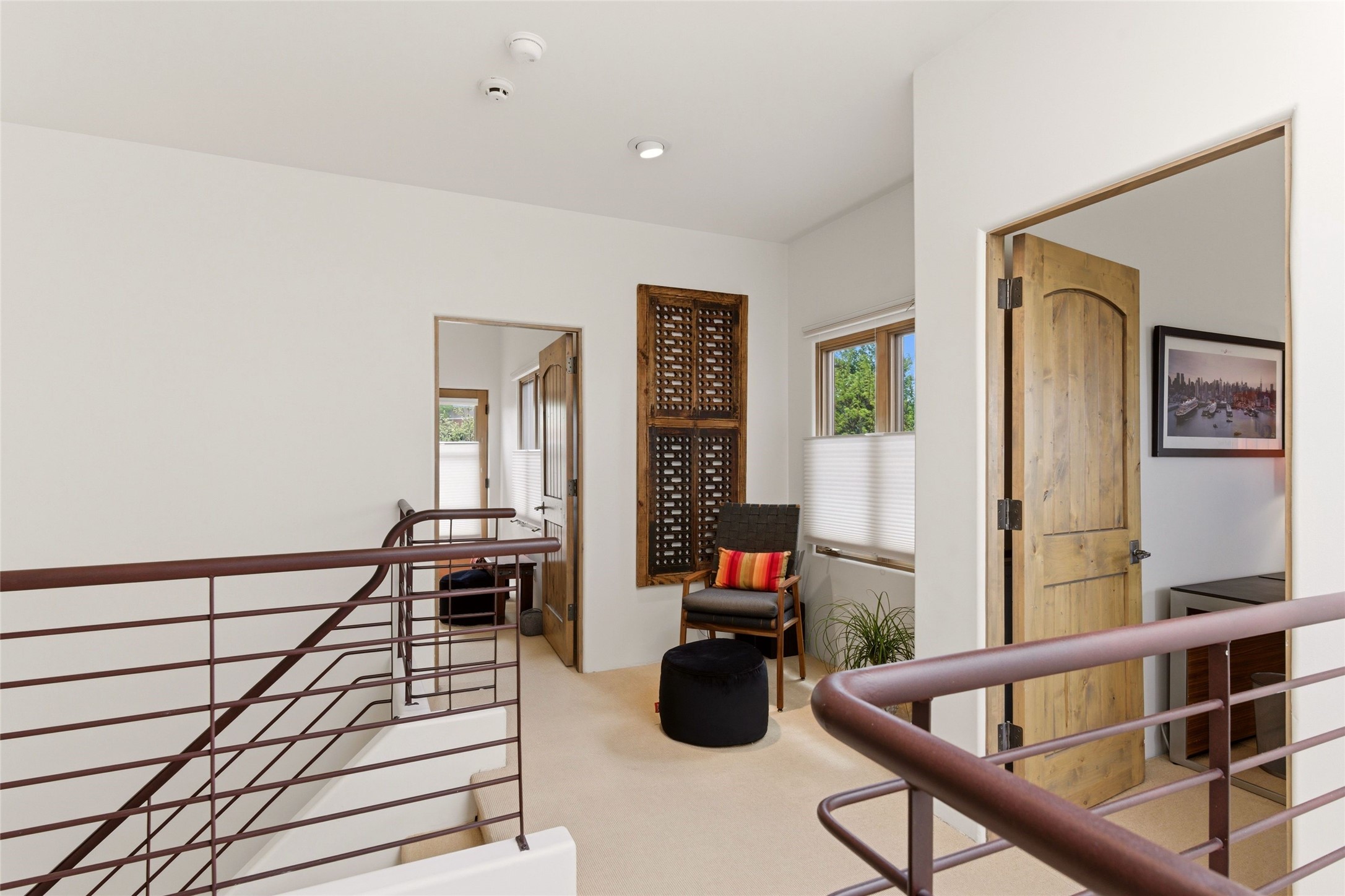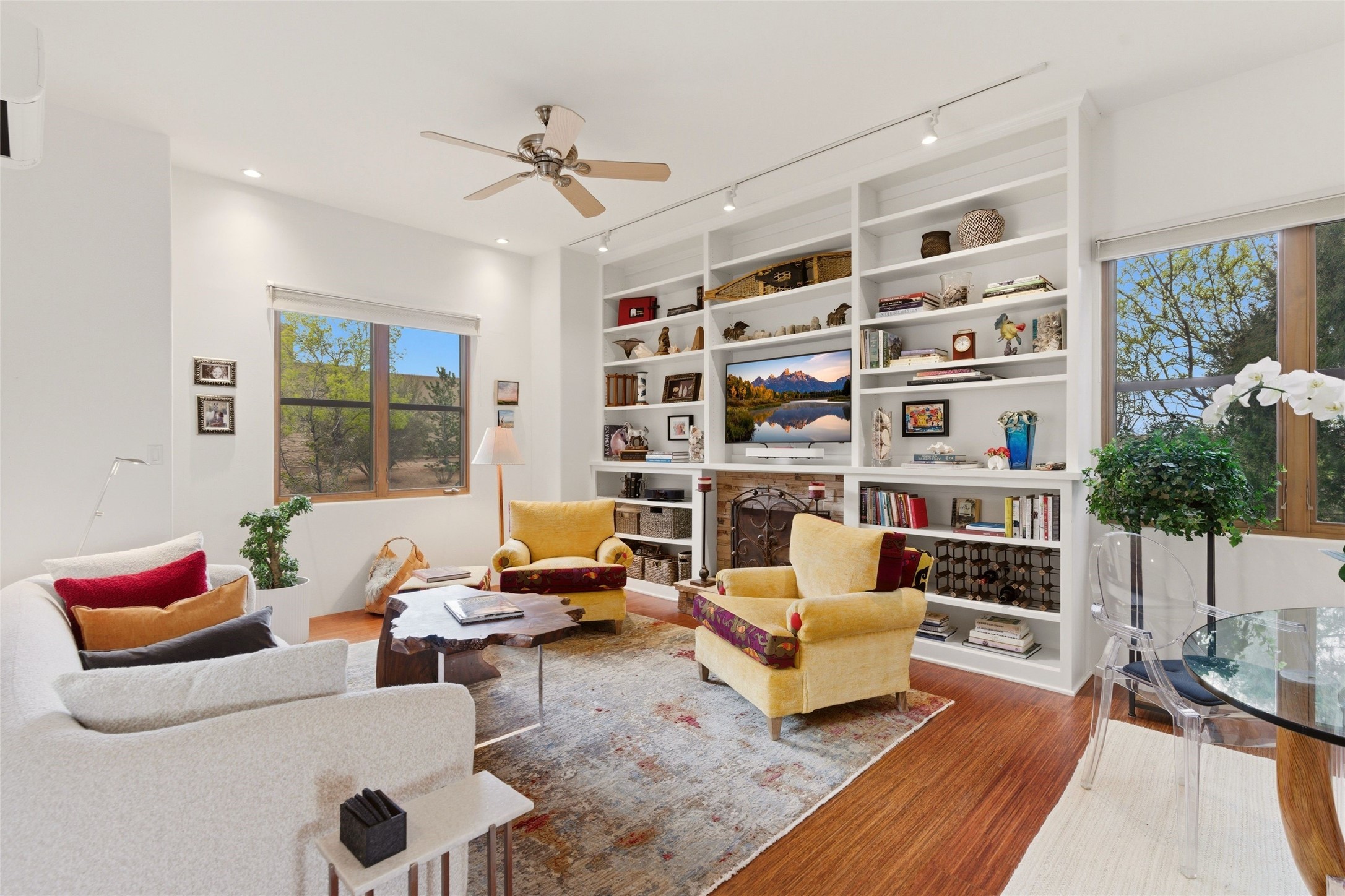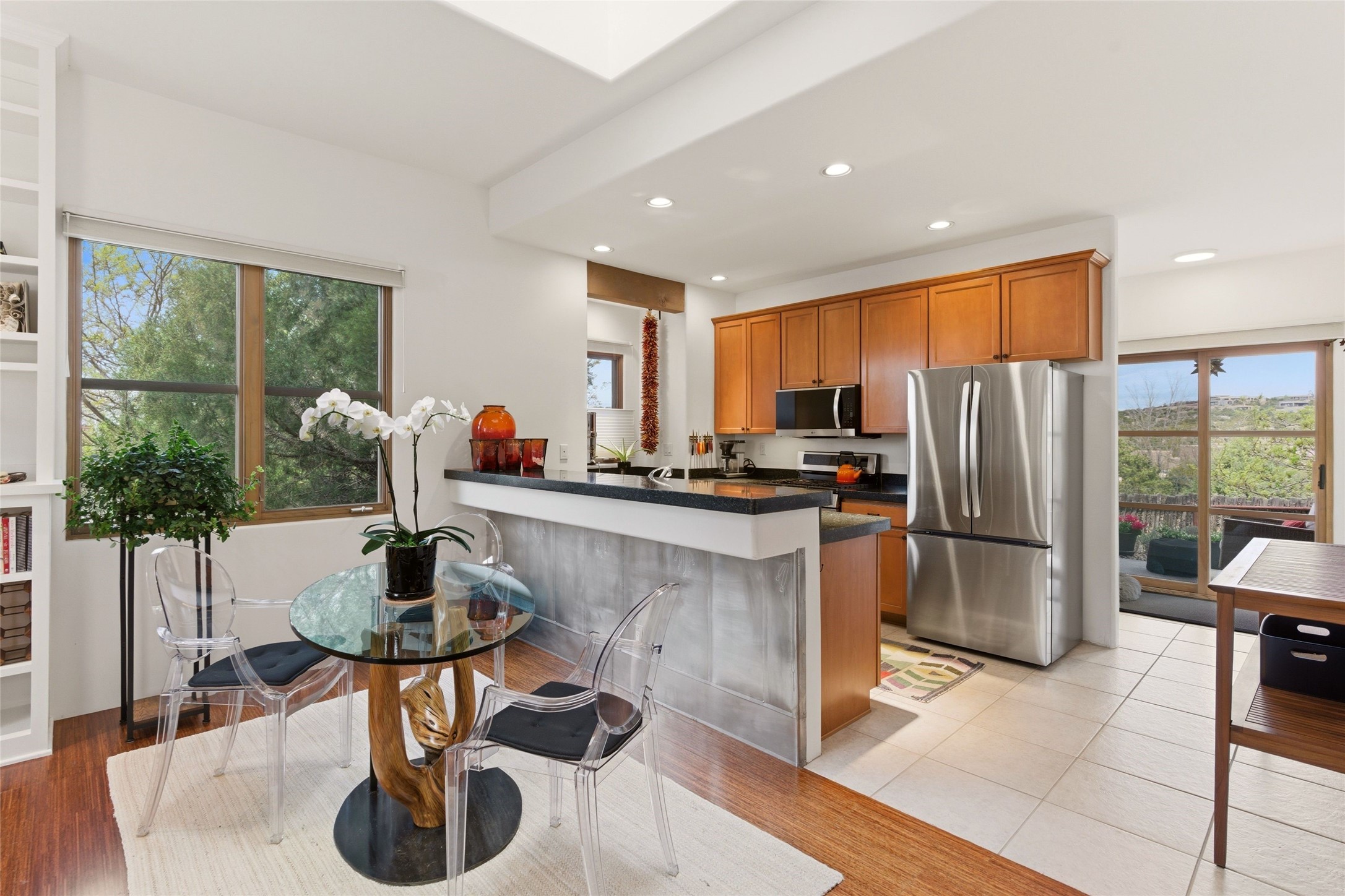 Located in the desirable Las Estrellas neighborhood on Santa Fe's northside, this exceptional home offers panoramic mountain and city views from a premium corner lot at the end of a quiet cul-de-sac. This light-filled, lock-and-go home features an open, airy floor plan with seamless flow between living, dining, and kitchen areas -- ideal for everyday living and entertaining.This nicely landscaped, shady backyard is fully fenced for pets and perfect for outdoor gatherings. Originally a model home, it includes numerous upgrades such as custom-built-in bookshelves and two upper decks, one of which is a private rooftop deck off the primary suite with a walk-in closet and stunning Sangre de Cristo views.Recent improvements include a Mitsubishi ductless cooling and supplemental heating system, new stainless steel appliances, updated LED lighting and new window shades throughout the home. Residents enjoy a community park, paved paths and access to Santa Fe's extensive trail network.Peaceful yet convenient, this northside location is just minutes from the Plaza and DeVargas Mall with easy access to Los Alamos and Albuquerque, offering an exceptional blend of views, privacy and modern comfort.