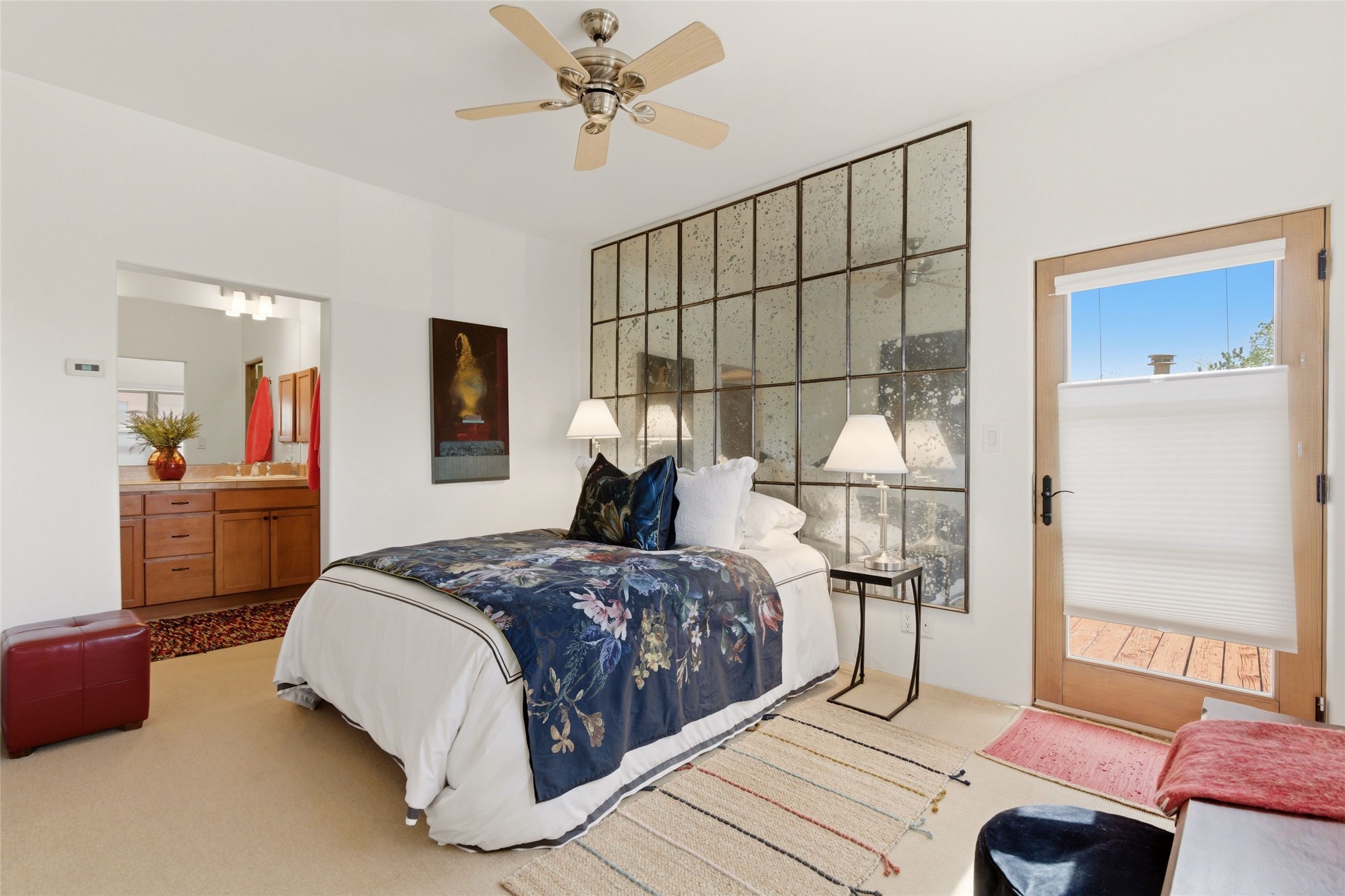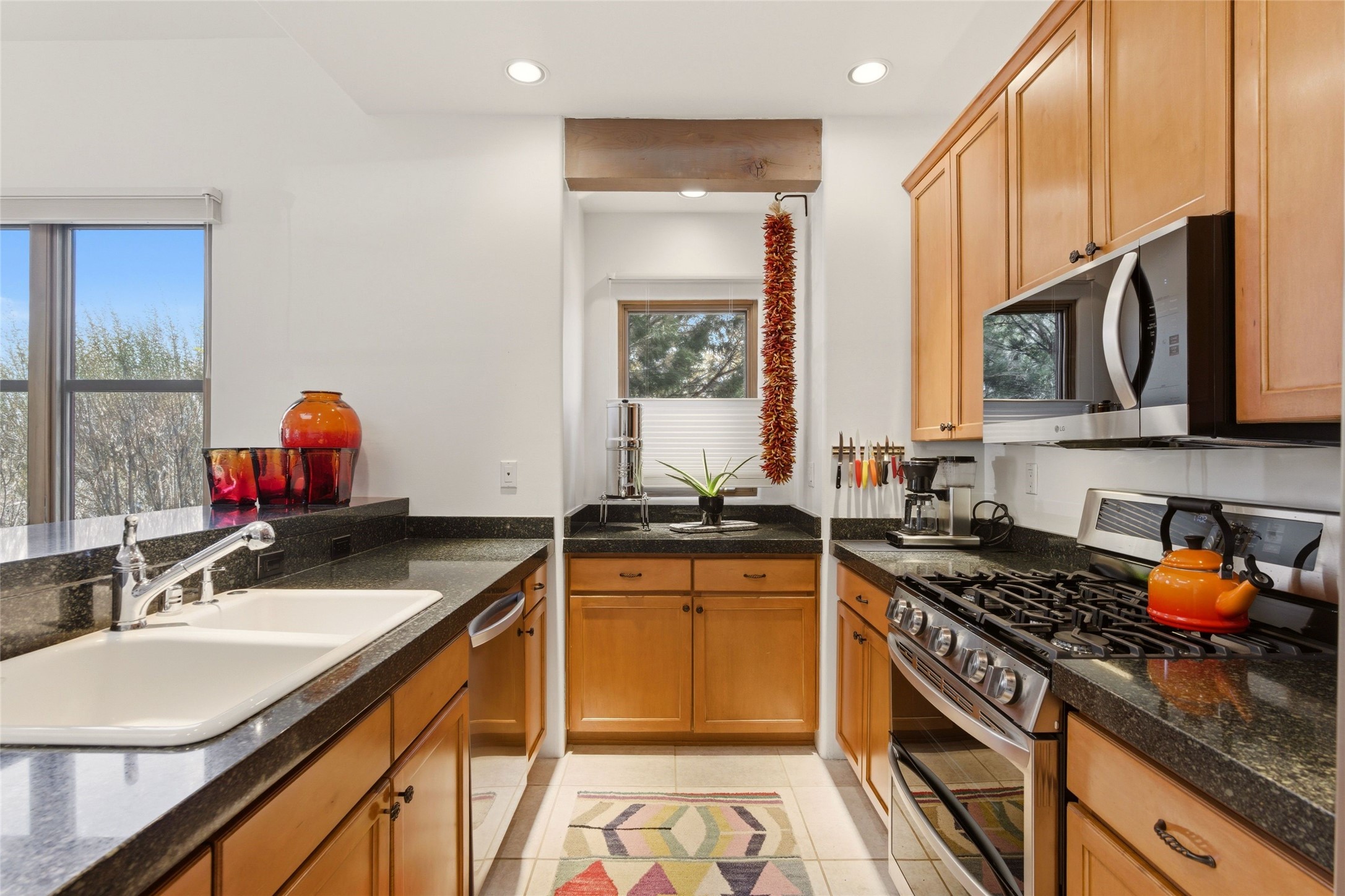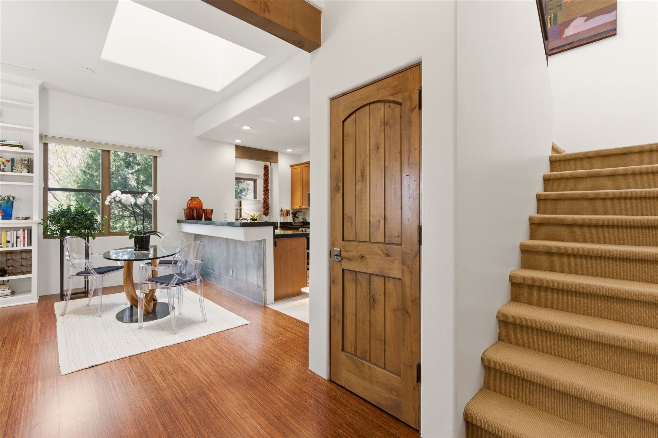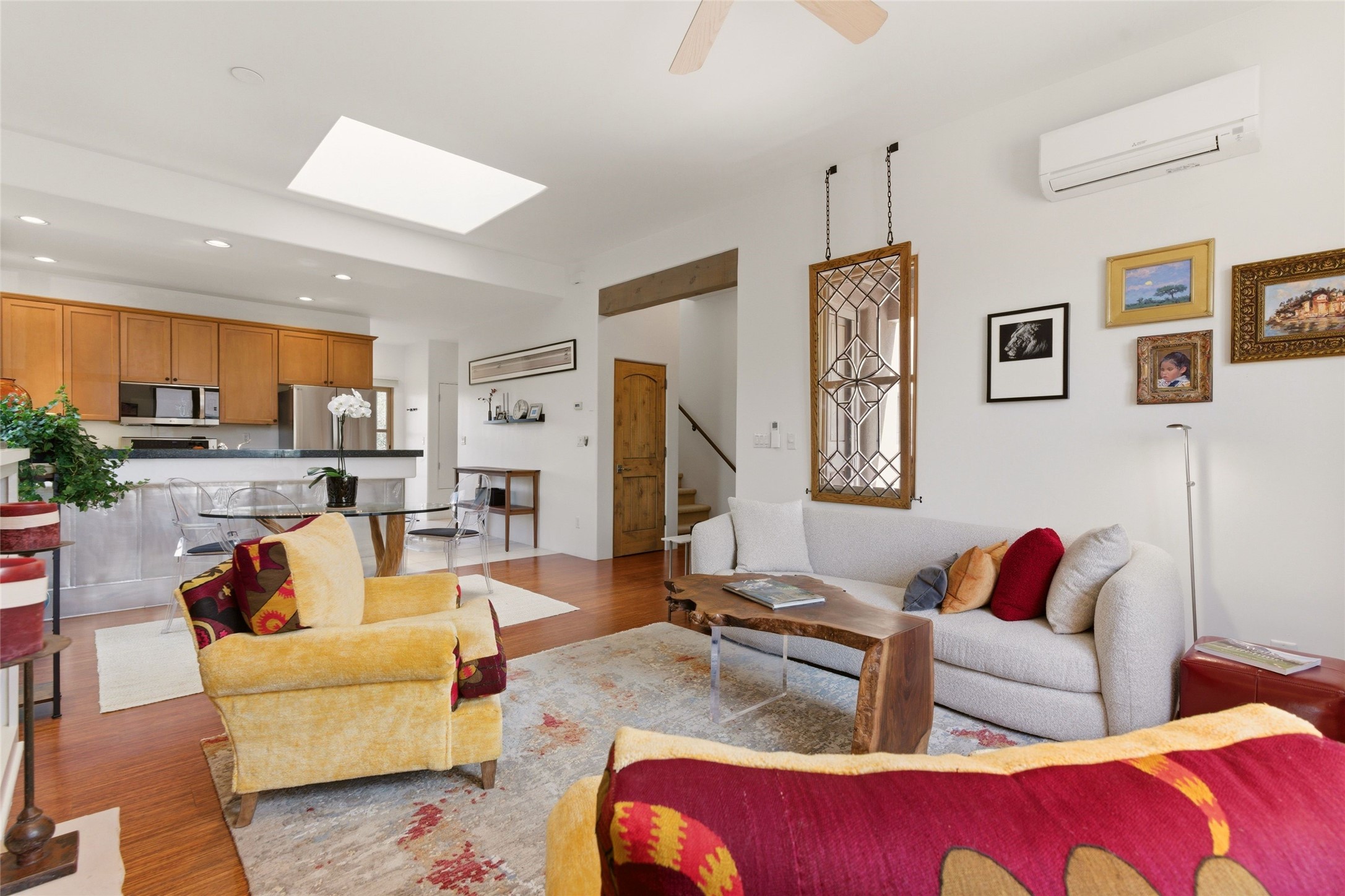Located in the desirable Las Estrellas neighborhood on Santa Fe's northside, this exceptional home offers panoramic mountain and city views from a premium corner lot at the end of a quiet cul-de-sac. This light-filled, lock-and-go home features an open, airy floor plan with seamless flow between living, dining, and kitchen areas -- ideal for everyday living and entertaining.This nicely landscaped, shady backyard is fully fenced for pets and perfect for outdoor gatherings. Originally a model home, it includes numerous upgrades such as custom-built-in bookshelves and two upper decks, one of which is a private rooftop deck off the primary suite with a walk-in closet and stunning Sangre de Cristo views.Recent improvements include a Mitsubishi ductless cooling and supplemental heating system, new stainless steel appliances, updated LED lighting and new window shades throughout the home. Residents enjoy a community park, paved paths and access to Santa Fe's extensive trail network.Peaceful yet convenient, this northside location is just minutes from the Plaza and DeVargas Mall with easy access to Los Alamos and Albuquerque, offering an exceptional blend of views, privacy and modern comfort.