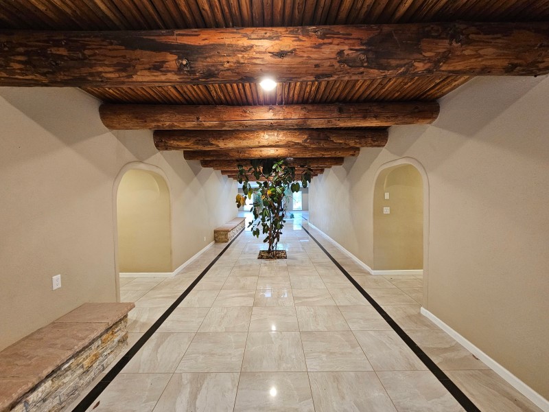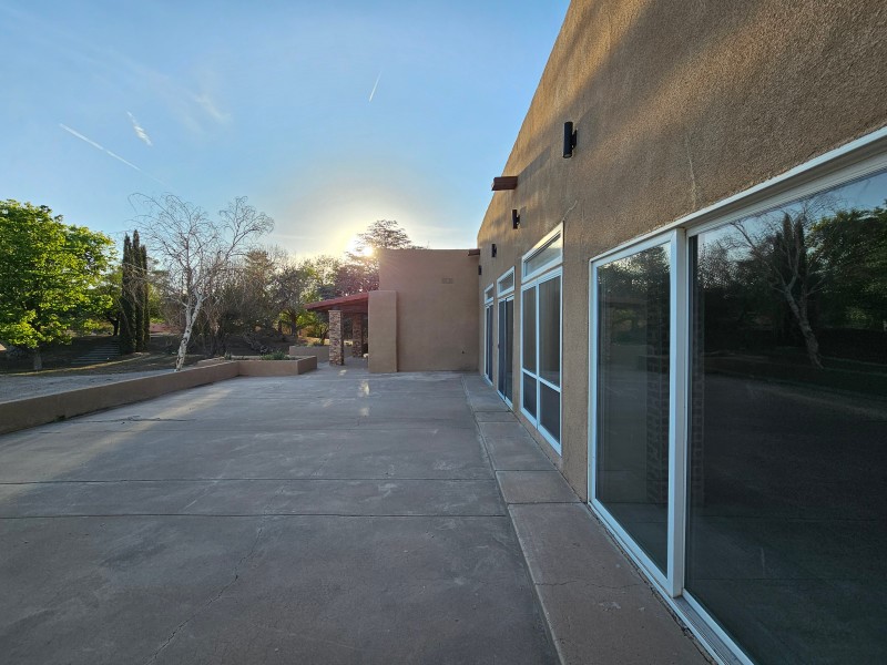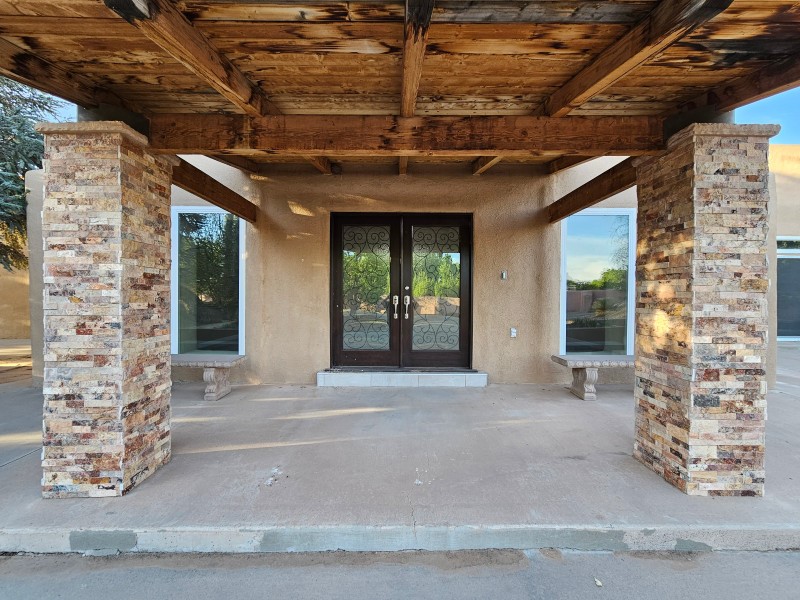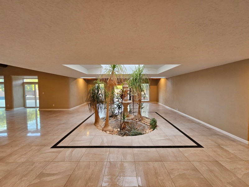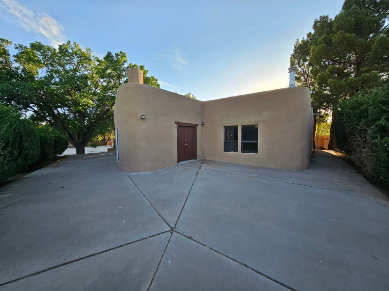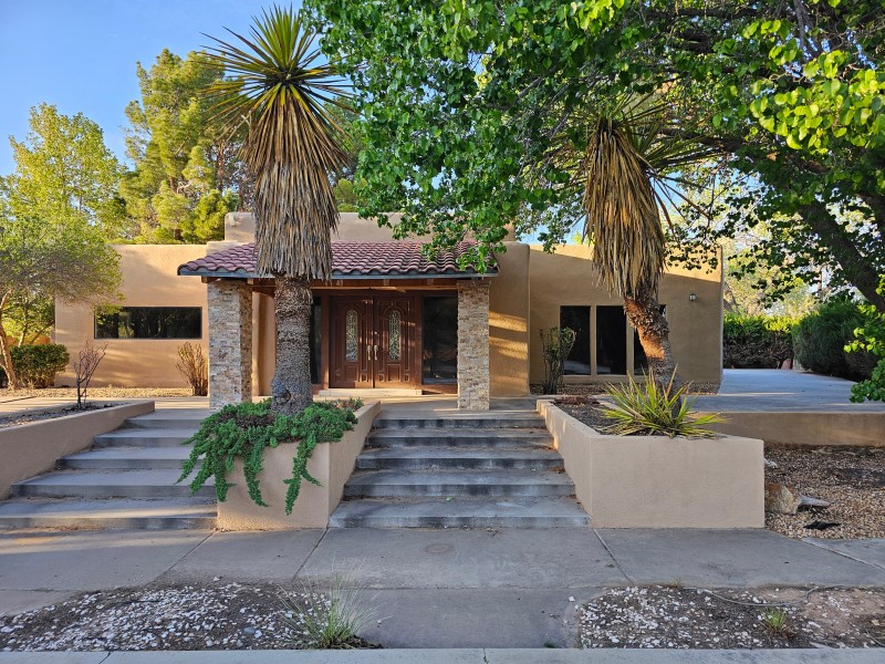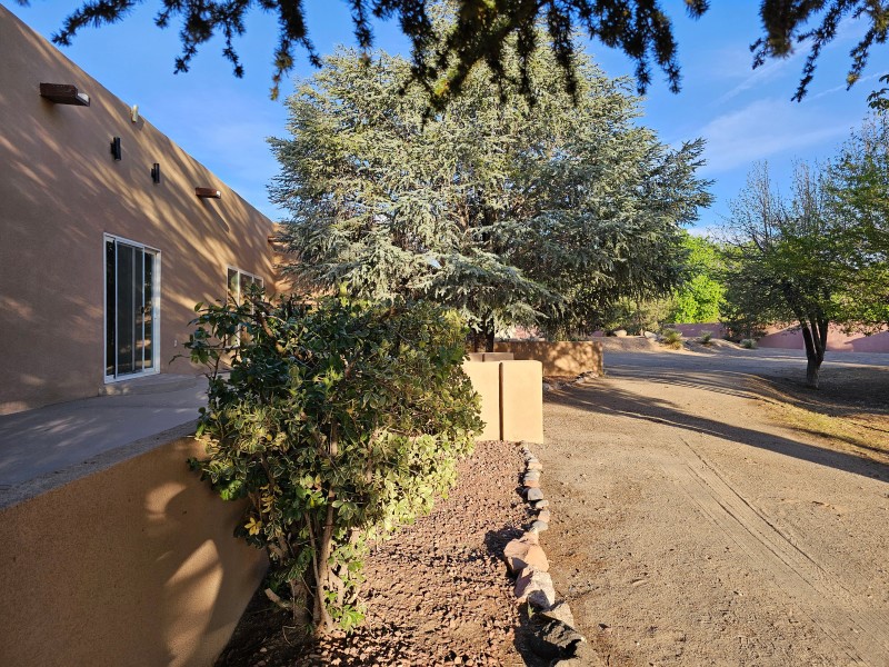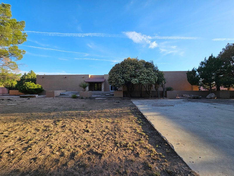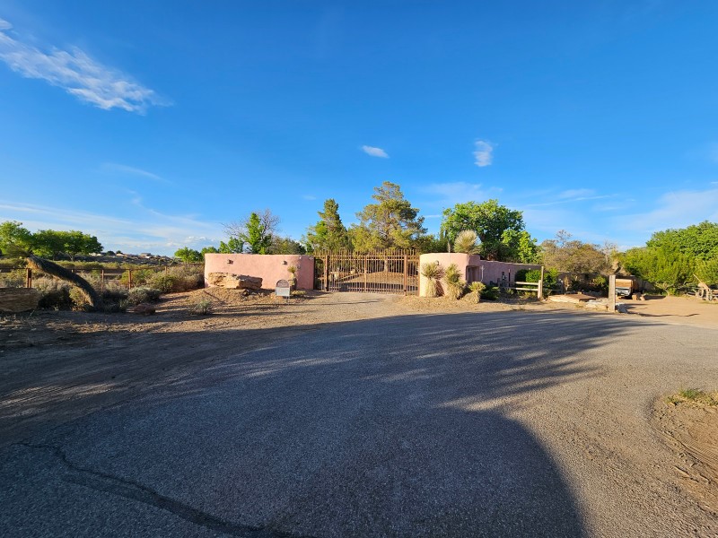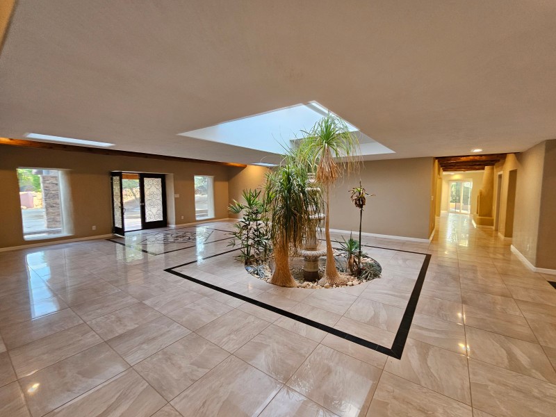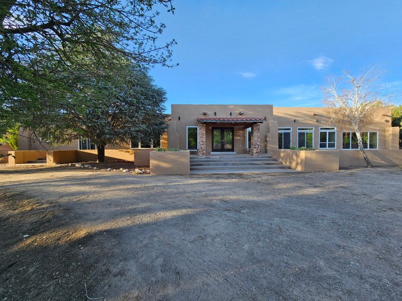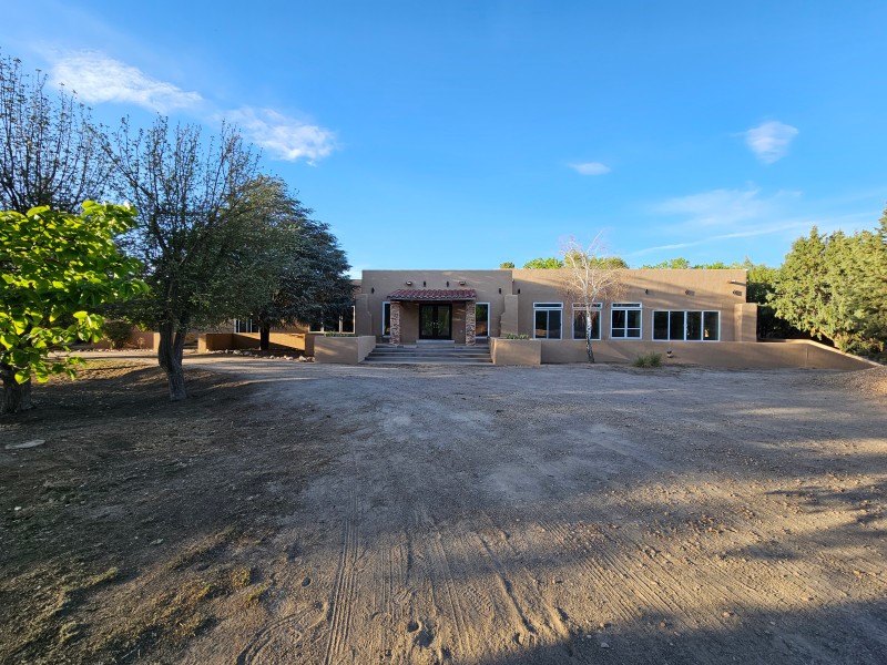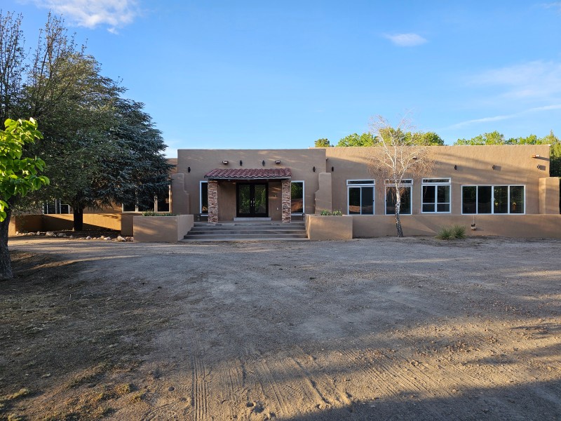 Located behind secure gates on 2.51 acres, this stunning contemporary estate offers both privacy and convenient access to the Corrales Bosque and the Rio Grande River. A striking entry atrium welcomes you with an indoor garden and expansive skylight, filling the space with natural light. The main living area is designed for both comfort and entertaining, featuring a built-in bar and a beautifully crafted wood-beamed ceiling with custom detailing. The kitchen is well-appointed with custom cabinetry, sleek countertops, a commercial-grade range, and an oversized island with seating and additional storage.The spacious owner's suite includes a cozy fireplace and a luxurious en-suite bathroom with dual sinks, a freestanding tub seamlessly integrated with the shower, and an impressive walk-in closet. A detached casita offers excellent flexibility with two bedrooms and two bathrooms--ideal for guests or extended living. The property also includes a pool (in need of repair), adding to its potential as a private retreat. This unique property is a must-see for those seeking space, style, and privacy in a prime location.